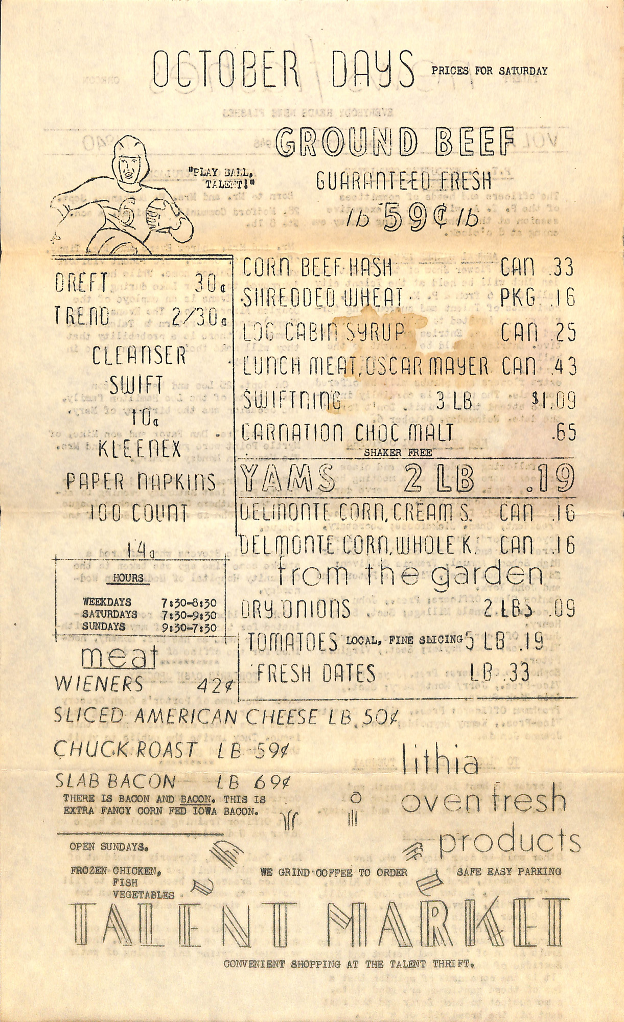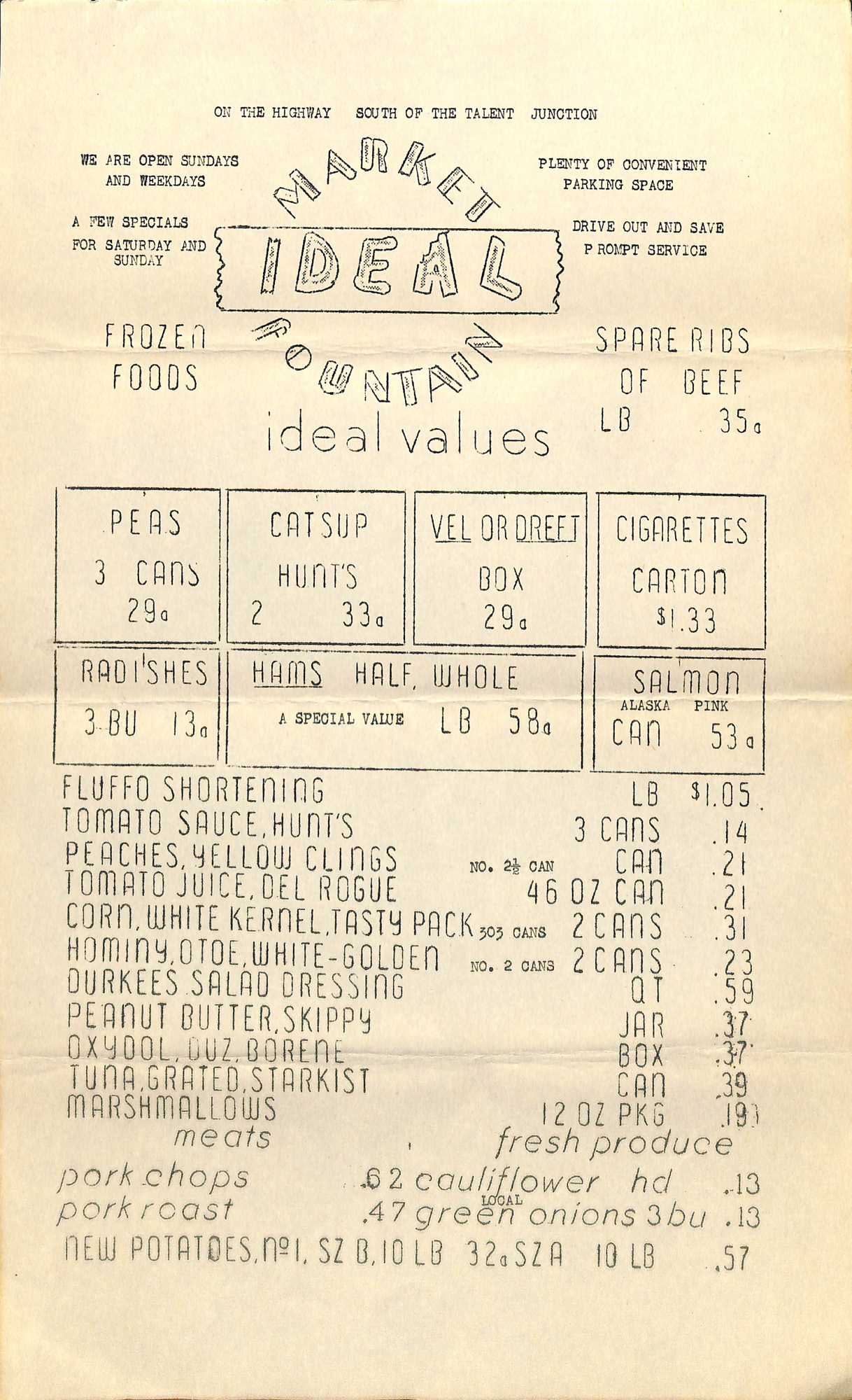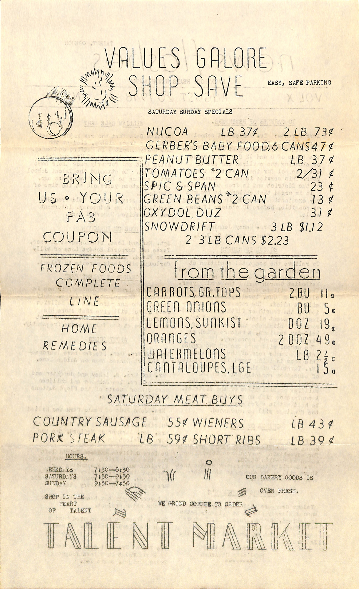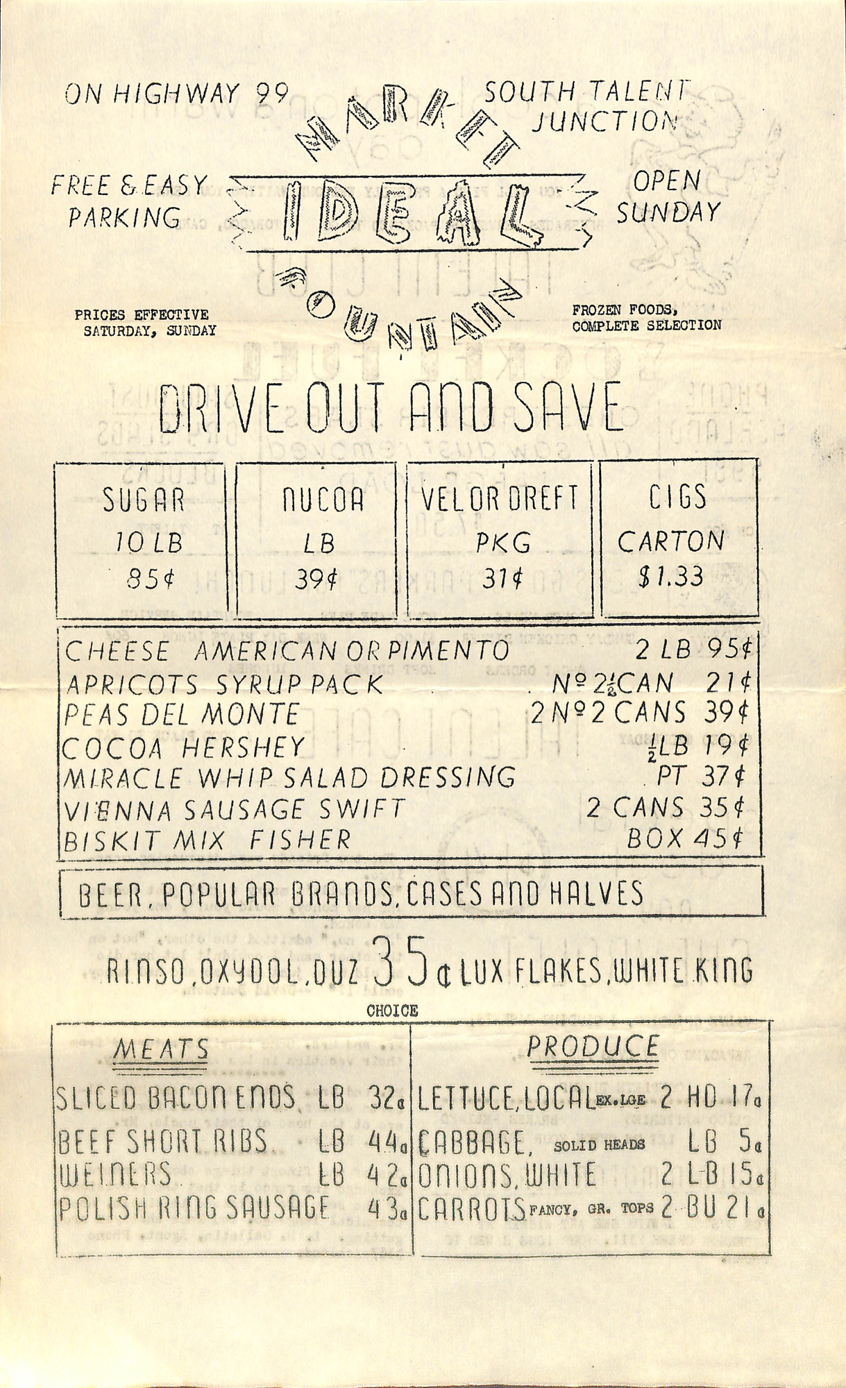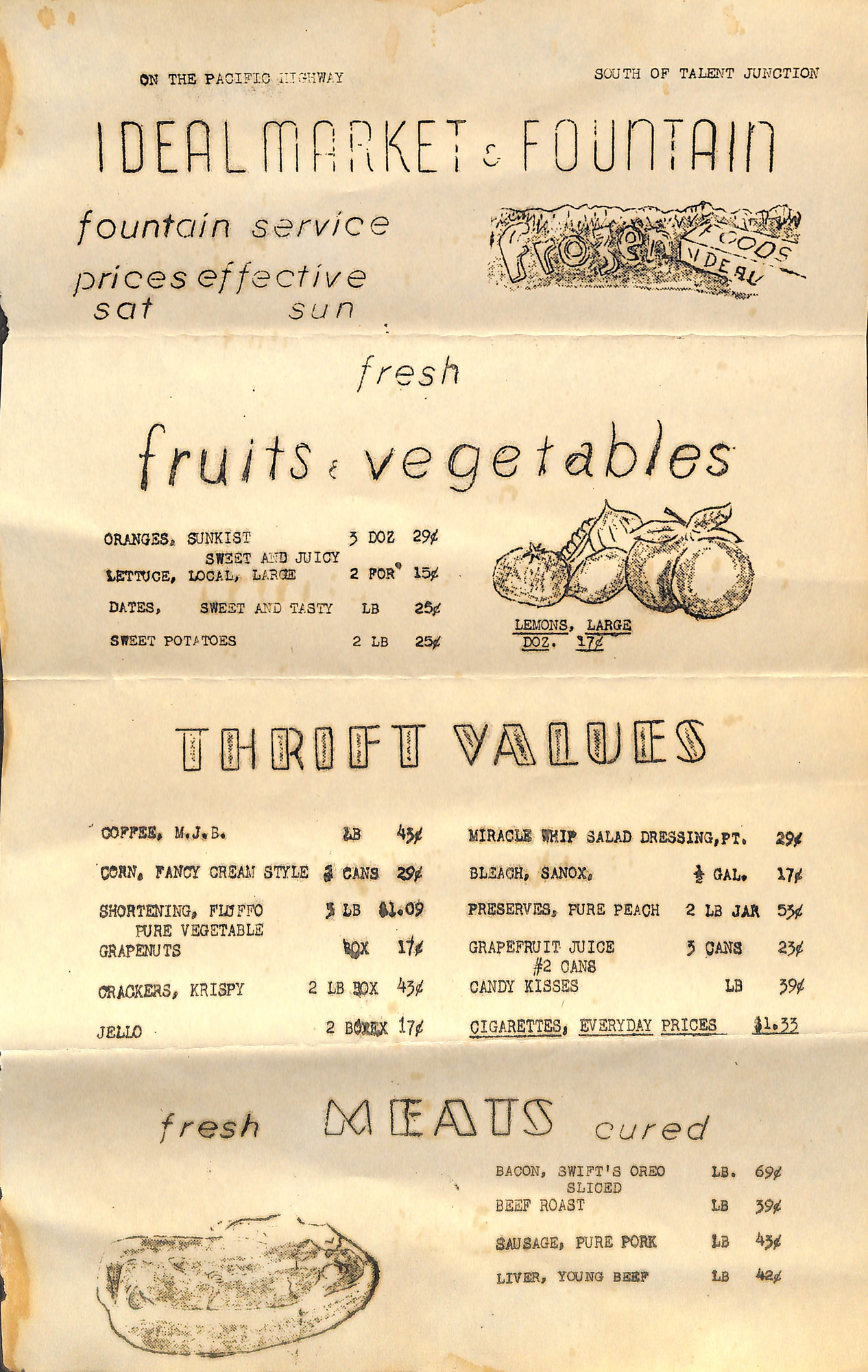 SATURDAY SPECIALS. GROCERY DEPARTMENT JELLO--5¢ pkg. SUGAR 10-lb. bag--50¢ FLOUR, KLAMATH HARD WHEAT 49-lb. bag--$1.69 FLOUR, KLAMATH, GOOD 49-lb. bag--$1.39 VEGETABLE DEPARTMENT SPUDS--50 lbs. #2--39¢ BRINER'S BERRIES 2 boxes--15¢ LEMONS, SUNKIST .doz--28¢ LETTUCE, large heads, 5¢ MEAT MARKET FINE STEAK--15¢ ROASTS--9¢ STEWS--6¢ LAMB CHOPS--15¢ BAKERY DEPARTMENT THAT GOOD HOMEMADE BREAD STILL 3 LOAVES--20¢ Many other treats at popular prices WE CARRY ICE, MEDFORD QUALITY AND PRICES FOR COMPLETE FOOD SERVICE, TRY RAY'S MARKET ----------------------------------------------------------------------------- TRAFFIC & WATER At the recent meeting of the city council, called for the purpose of considering the feasibility of securing more water, a proposition was made by the Talent Transient Camp that the members of the Camp would donate the necessary labor for the construction of a larger and deeper well at the lower city well property. It is planned to dig the well as deep as is necessary to secure an adequate flow of water, after which extensive drifts will be made to secure sufficient reservoir space. At the same meeting of the council it was voted to send for a supply of earwig parasites which are said to be efficacious in destroying the earwigs. It is requested that all owners of bantam chickens keep them penned up as a protection to the parasites…. KID PARTY Mrs. H. Good was hostess at a surprise kitchen shower Tuesday evening, honoring her sister, Miss Ione Bates, who is to be married to Mr. W. Dooms, Friday. The affair was given as a "Kid Party," and all the guests came dressed in an appropriate manner. The kids enjoyed punch and suckers and played kid games until a late hour. Many beautiful gifts were received by the guest of honor. About thirty friends of the guest of honor were present. Talent News Flashes June 23, 1934, now lost. Reprinted in the June 26, 1959 News Flashes -----------------------------------------------------------------------------
