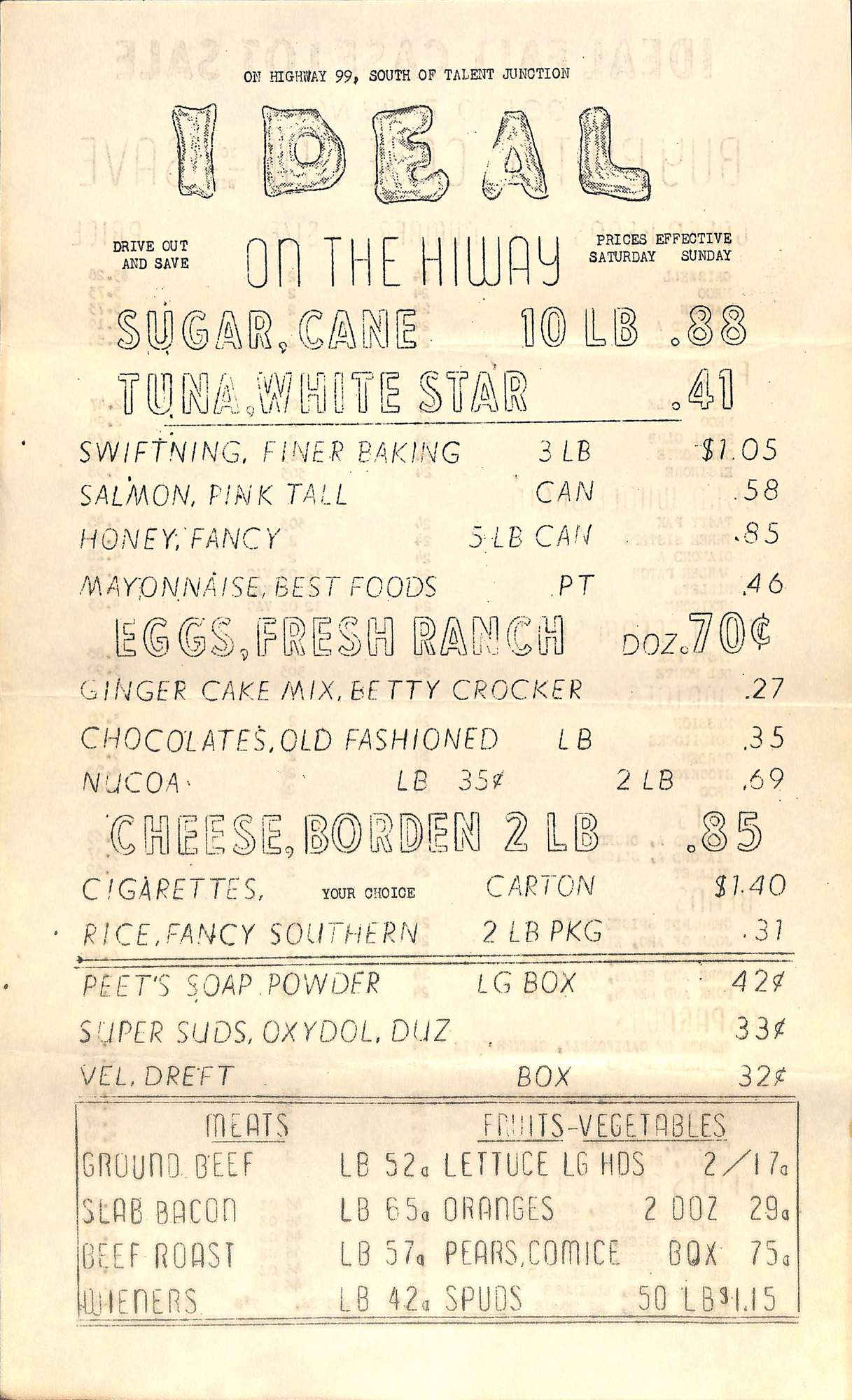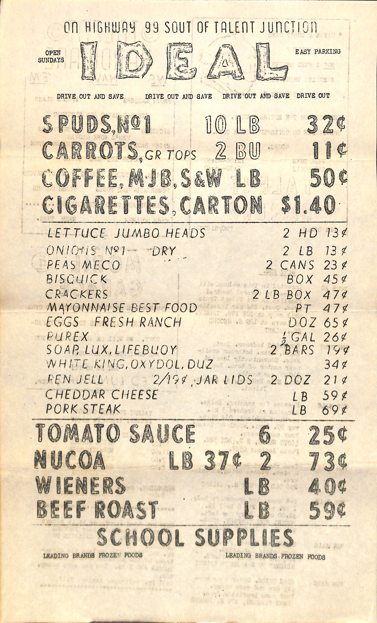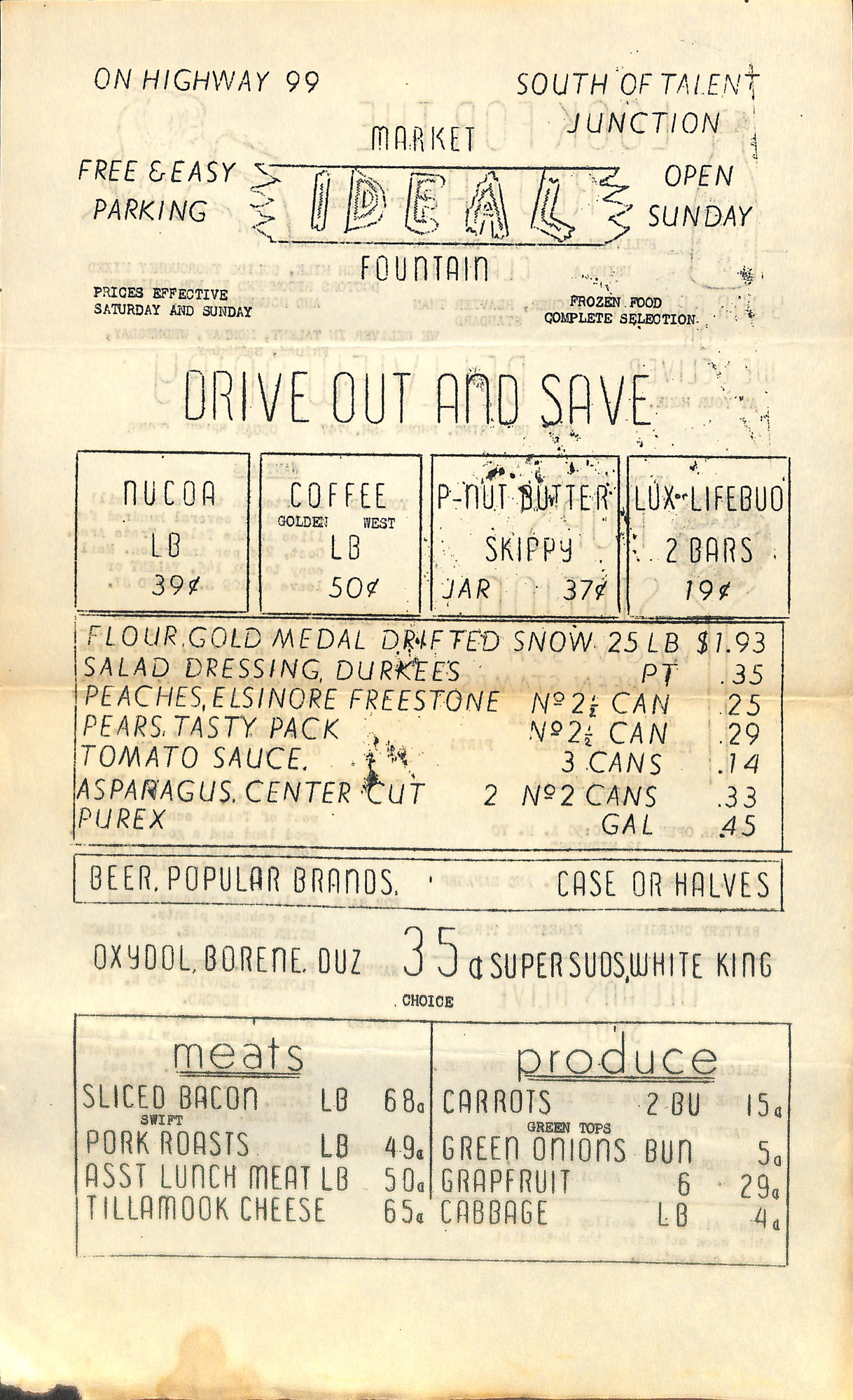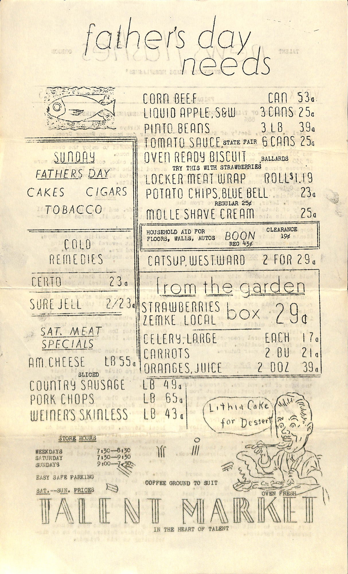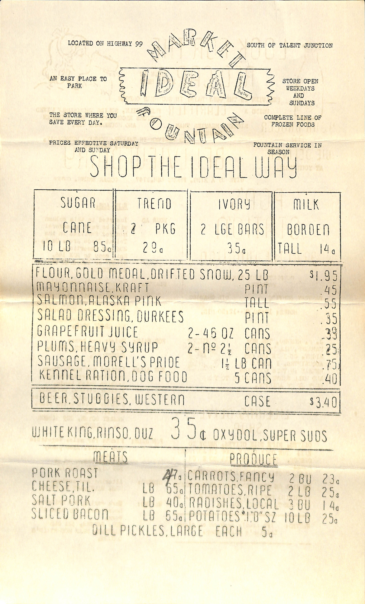 SATURDAY SPECIALS. GROCERY DEPARTMENT JELLO--5¢ pkg. SUGAR 10-lb. bag--50¢ FLOUR, KLAMATH HARD WHEAT 49-lb. bag--$1.69 FLOUR, KLAMATH, GOOD 49-lb. bag--$1.39 VEGETABLE DEPARTMENT SPUDS--50 lbs. #2--39¢ BRINER'S BERRIES 2 boxes--15¢ LEMONS, SUNKIST .doz--28¢ LETTUCE, large heads, 5¢ MEAT MARKET FINE STEAK--15¢ ROASTS--9¢ STEWS--6¢ LAMB CHOPS--15¢ BAKERY DEPARTMENT THAT GOOD HOMEMADE BREAD STILL 3 LOAVES--20¢ Many other treats at popular prices WE CARRY ICE, MEDFORD QUALITY AND PRICES FOR COMPLETE FOOD SERVICE, TRY RAY'S MARKET ----------------------------------------------------------------------------- TRAFFIC & WATER At the recent meeting of the city council, called for the purpose of considering the feasibility of securing more water, a proposition was made by the Talent Transient Camp that the members of the Camp would donate the necessary labor for the construction of a larger and deeper well at the lower city well property. It is planned to dig the well as deep as is necessary to secure an adequate flow of water, after which extensive drifts will be made to secure sufficient reservoir space. At the same meeting of the council it was voted to send for a supply of earwig parasites which are said to be efficacious in destroying the earwigs. It is requested that all owners of bantam chickens keep them penned up as a protection to the parasites…. KID PARTY Mrs. H. Good was hostess at a surprise kitchen shower Tuesday evening, honoring her sister, Miss Ione Bates, who is to be married to Mr. W. Dooms, Friday. The affair was given as a "Kid Party," and all the guests came dressed in an appropriate manner. The kids enjoyed punch and suckers and played kid games until a late hour. Many beautiful gifts were received by the guest of honor. About thirty friends of the guest of honor were present. Talent News Flashes June 23, 1934, now lost. Reprinted in the June 26, 1959 News Flashes -----------------------------------------------------------------------------