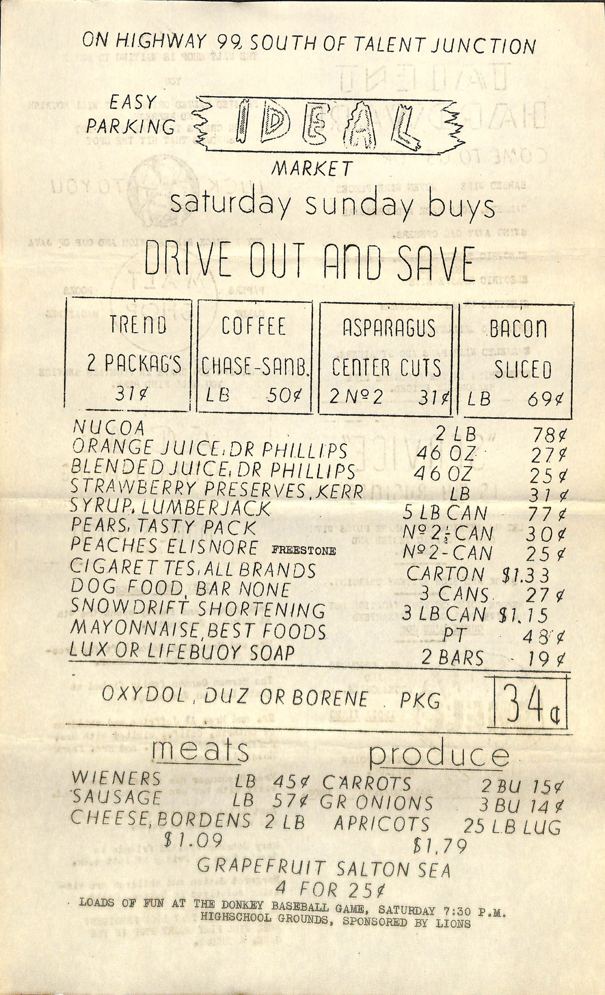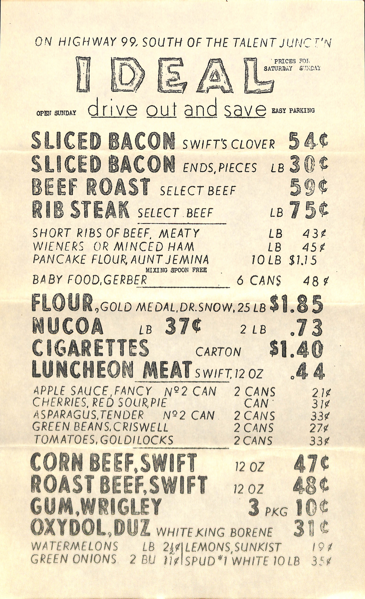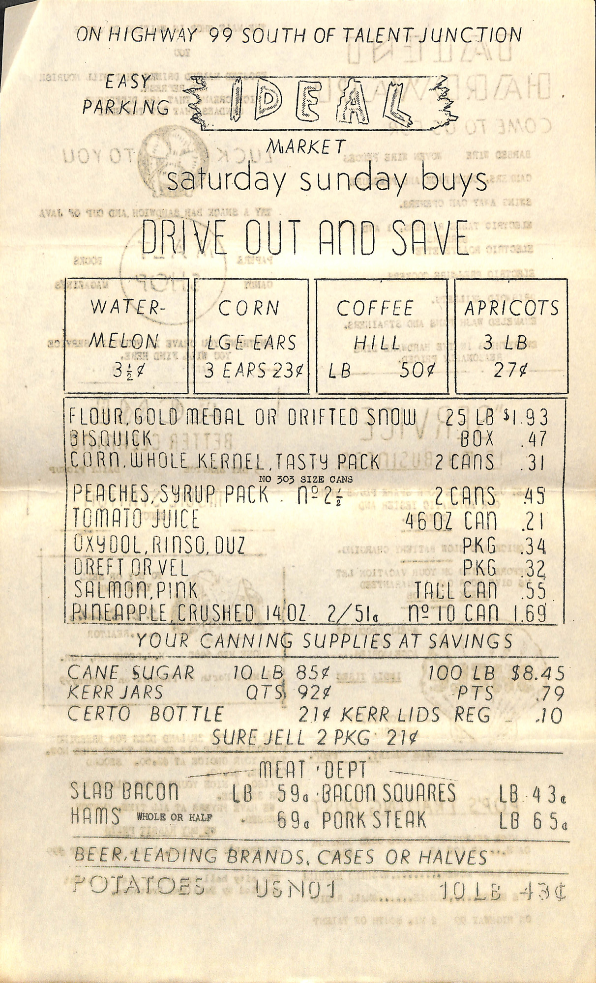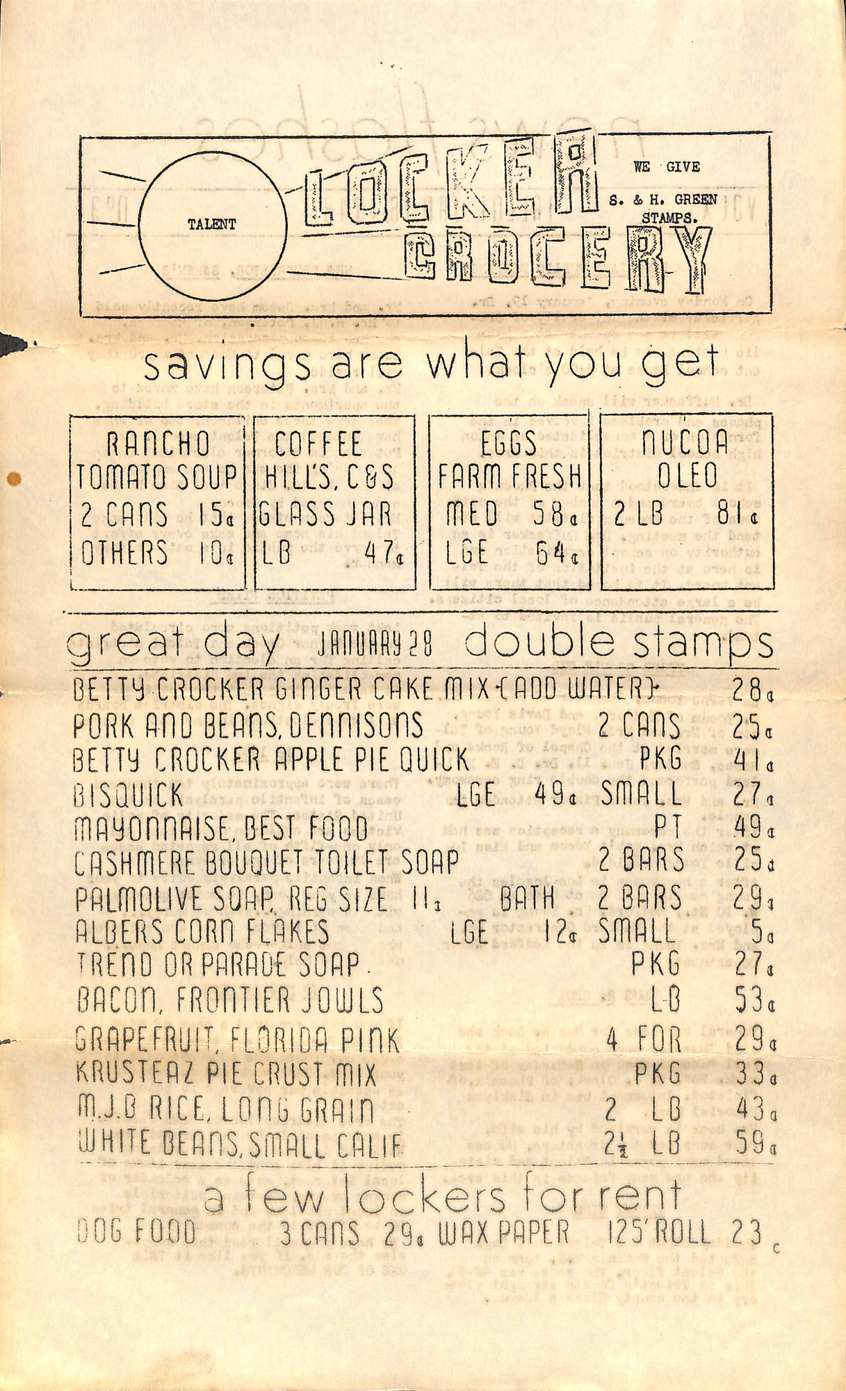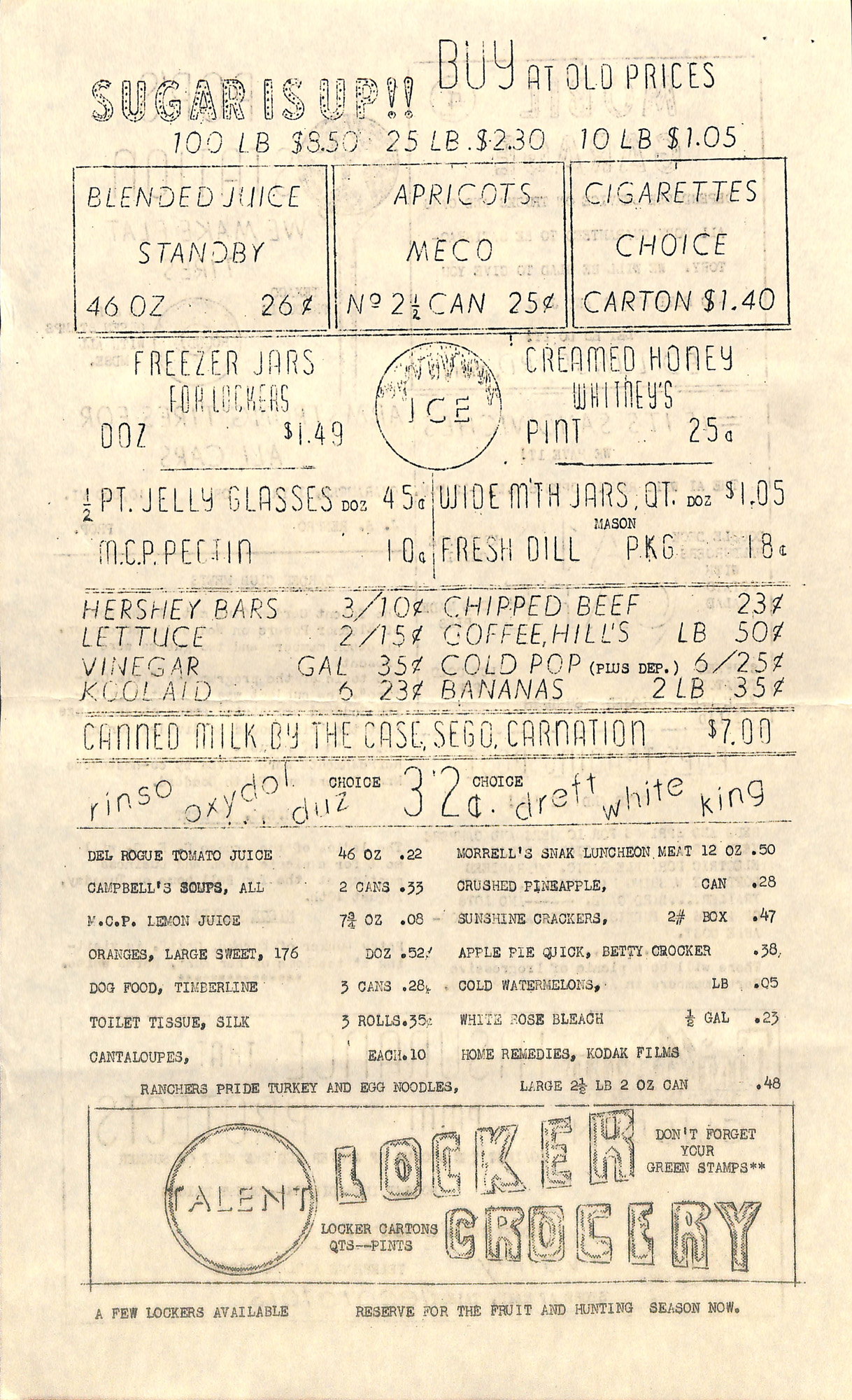 SATURDAY SPECIALS. GROCERY DEPARTMENT JELLO--5¢ pkg. SUGAR 10-lb. bag--50¢ FLOUR, KLAMATH HARD WHEAT 49-lb. bag--$1.69 FLOUR, KLAMATH, GOOD 49-lb. bag--$1.39 VEGETABLE DEPARTMENT SPUDS--50 lbs. #2--39¢ BRINER'S BERRIES 2 boxes--15¢ LEMONS, SUNKIST .doz--28¢ LETTUCE, large heads, 5¢ MEAT MARKET FINE STEAK--15¢ ROASTS--9¢ STEWS--6¢ LAMB CHOPS--15¢ BAKERY DEPARTMENT THAT GOOD HOMEMADE BREAD STILL 3 LOAVES--20¢ Many other treats at popular prices WE CARRY ICE, MEDFORD QUALITY AND PRICES FOR COMPLETE FOOD SERVICE, TRY RAY'S MARKET ----------------------------------------------------------------------------- TRAFFIC & WATER At the recent meeting of the city council, called for the purpose of considering the feasibility of securing more water, a proposition was made by the Talent Transient Camp that the members of the Camp would donate the necessary labor for the construction of a larger and deeper well at the lower city well property. It is planned to dig the well as deep as is necessary to secure an adequate flow of water, after which extensive drifts will be made to secure sufficient reservoir space. At the same meeting of the council it was voted to send for a supply of earwig parasites which are said to be efficacious in destroying the earwigs. It is requested that all owners of bantam chickens keep them penned up as a protection to the parasites…. KID PARTY Mrs. H. Good was hostess at a surprise kitchen shower Tuesday evening, honoring her sister, Miss Ione Bates, who is to be married to Mr. W. Dooms, Friday. The affair was given as a "Kid Party," and all the guests came dressed in an appropriate manner. The kids enjoyed punch and suckers and played kid games until a late hour. Many beautiful gifts were received by the guest of honor. About thirty friends of the guest of honor were present. Talent News Flashes June 23, 1934, now lost. Reprinted in the June 26, 1959 News Flashes -----------------------------------------------------------------------------