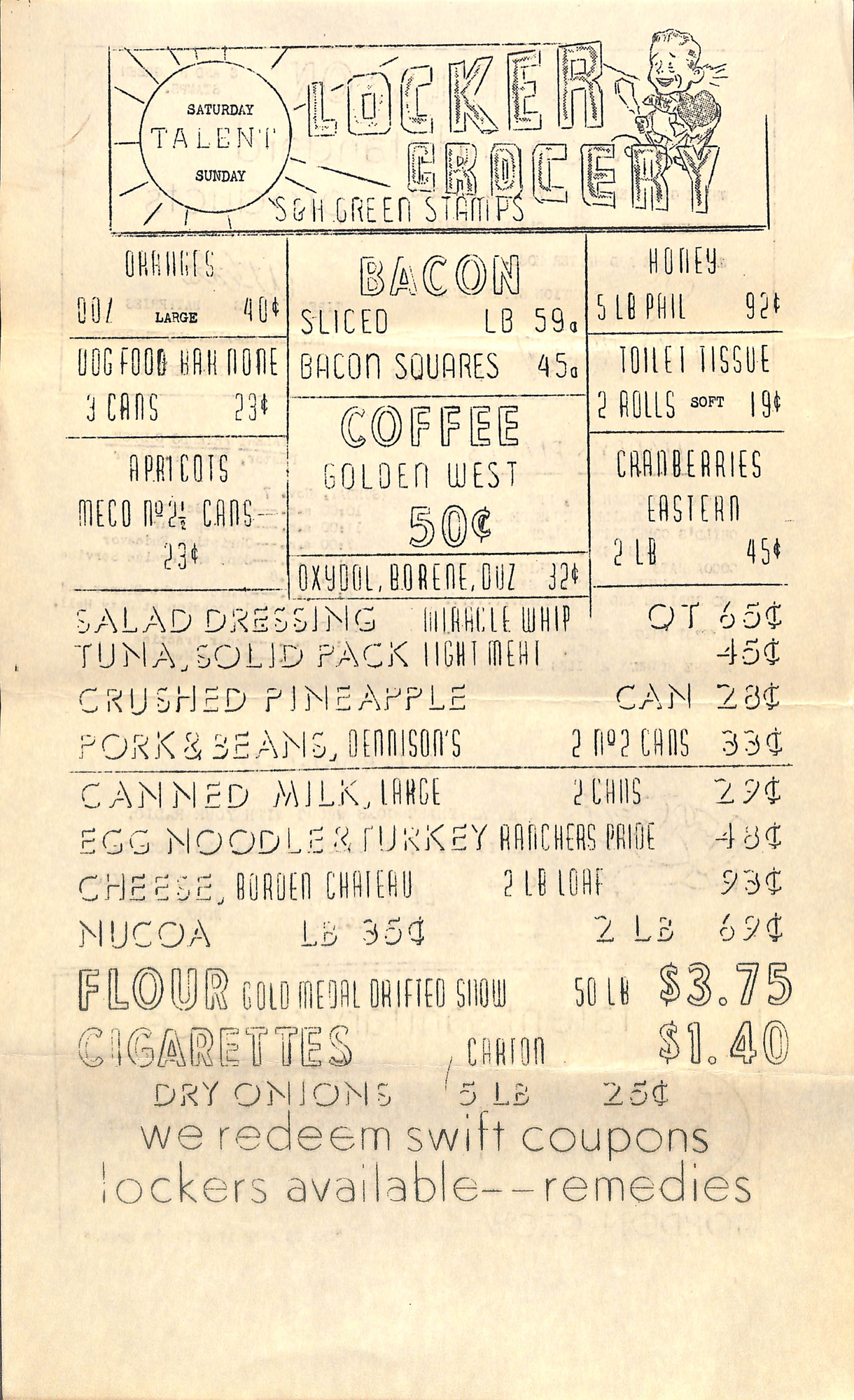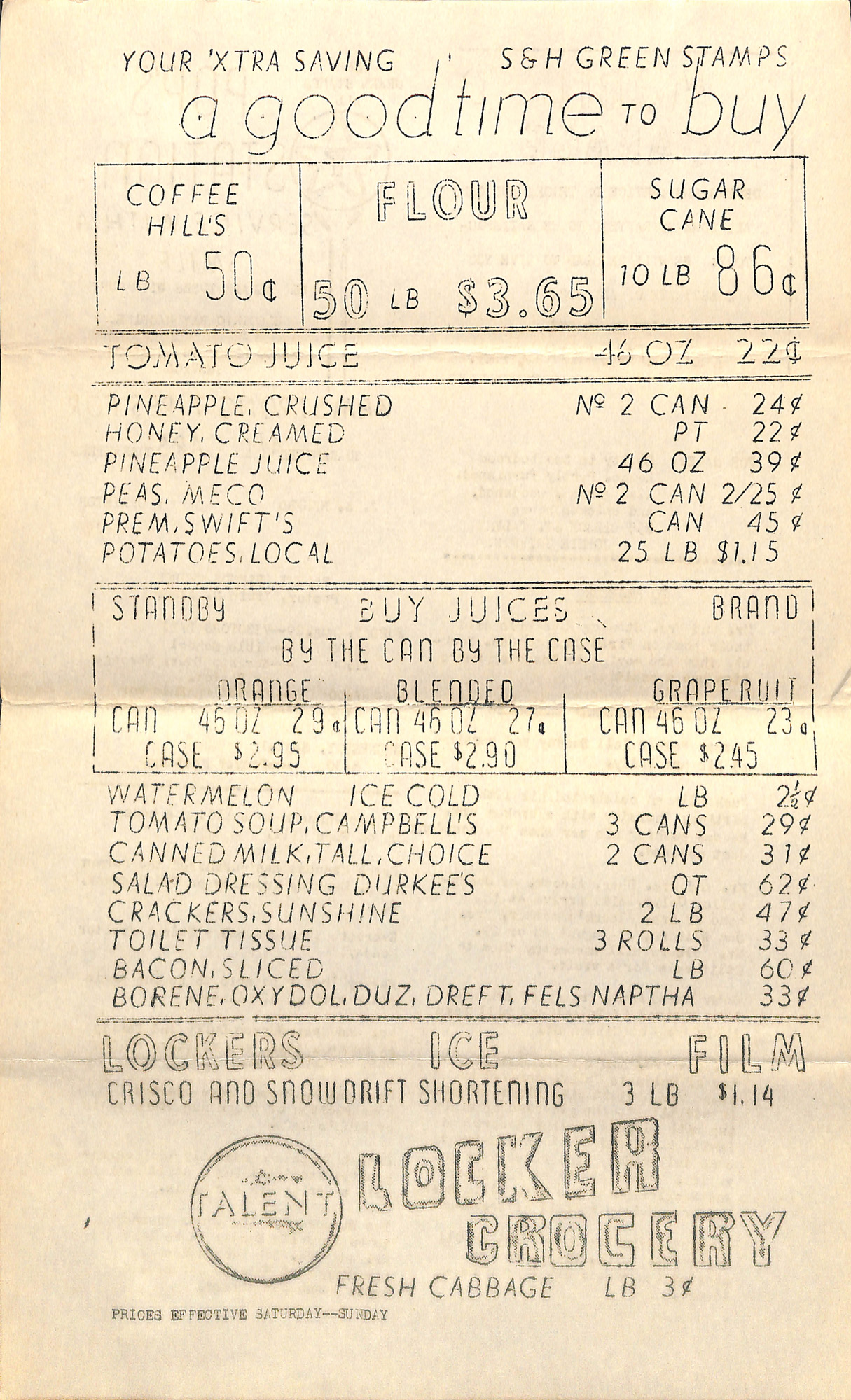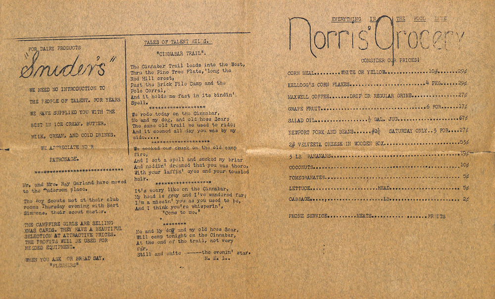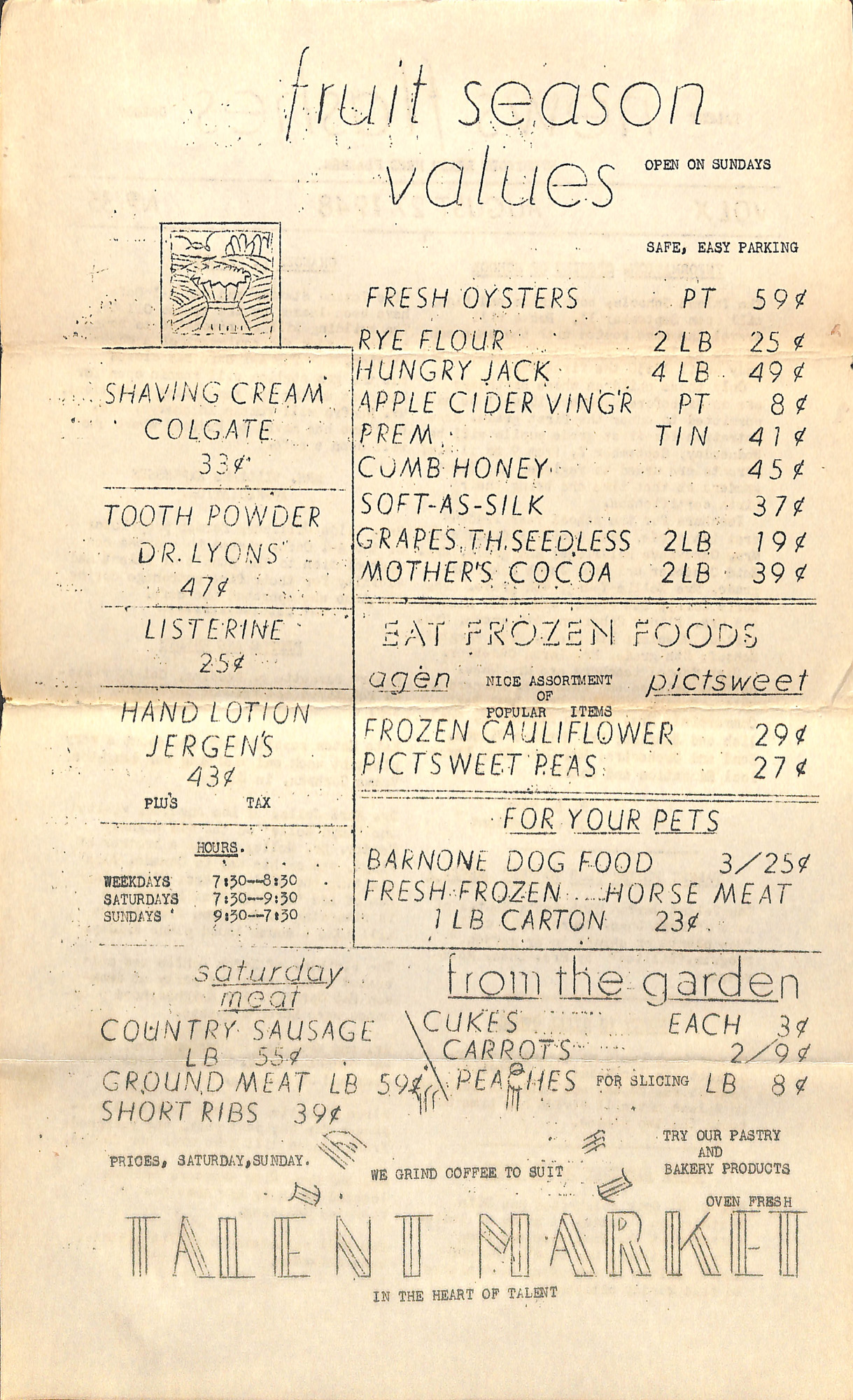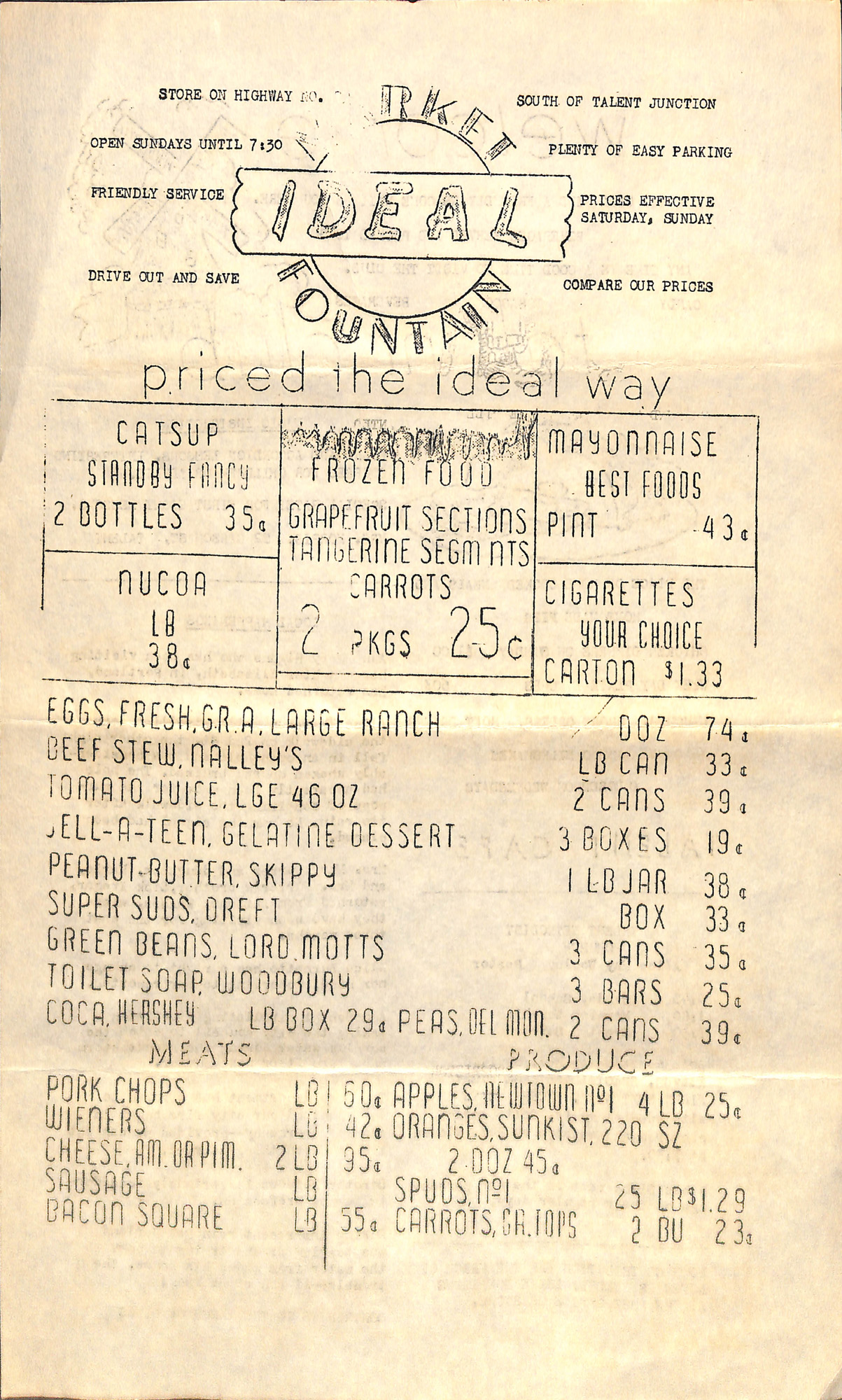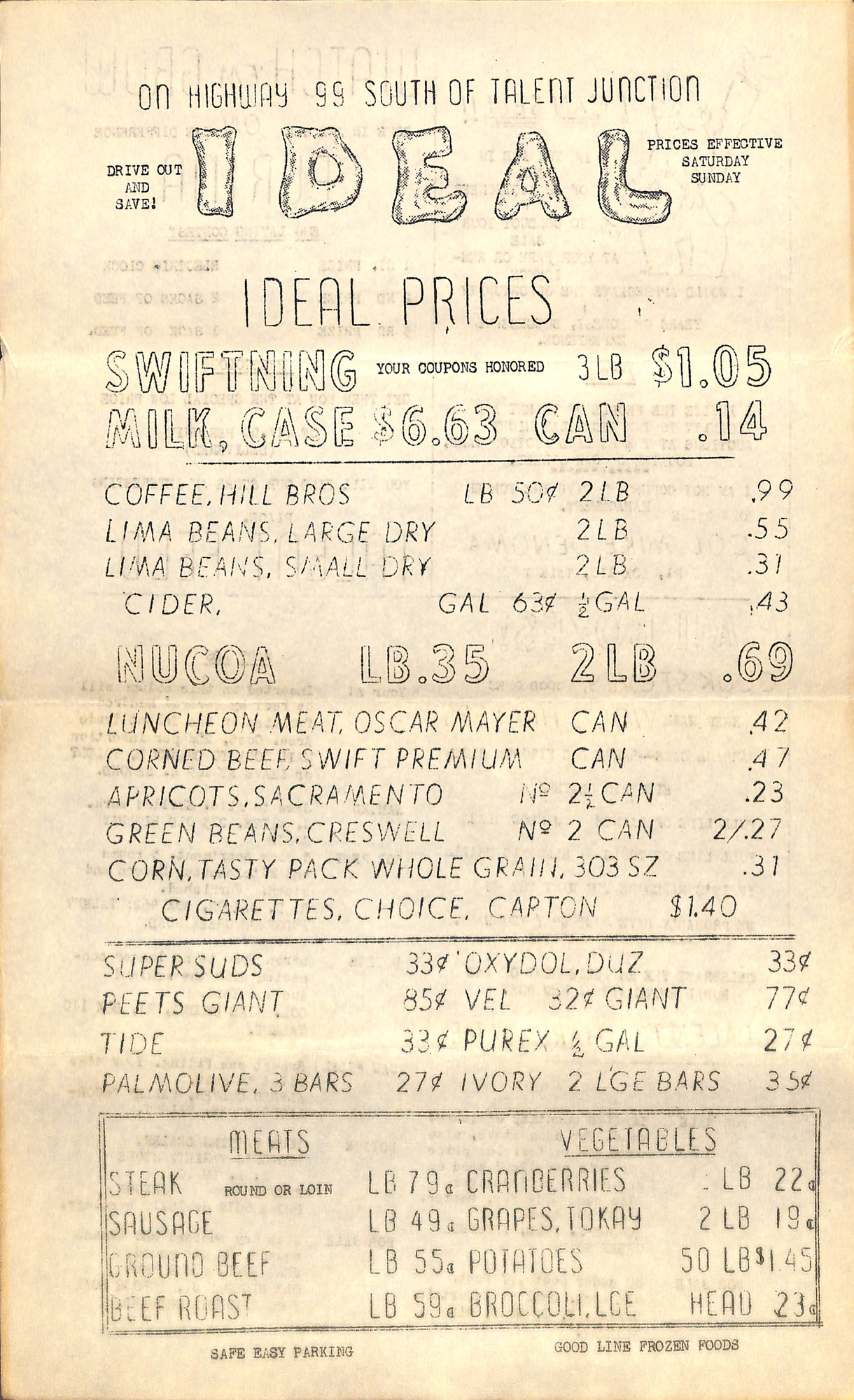 SATURDAY SPECIALS. GROCERY DEPARTMENT JELLO--5¢ pkg. SUGAR 10-lb. bag--50¢ FLOUR, KLAMATH HARD WHEAT 49-lb. bag--$1.69 FLOUR, KLAMATH, GOOD 49-lb. bag--$1.39 VEGETABLE DEPARTMENT SPUDS--50 lbs. #2--39¢ BRINER'S BERRIES 2 boxes--15¢ LEMONS, SUNKIST .doz--28¢ LETTUCE, large heads, 5¢ MEAT MARKET FINE STEAK--15¢ ROASTS--9¢ STEWS--6¢ LAMB CHOPS--15¢ BAKERY DEPARTMENT THAT GOOD HOMEMADE BREAD STILL 3 LOAVES--20¢ Many other treats at popular prices WE CARRY ICE, MEDFORD QUALITY AND PRICES FOR COMPLETE FOOD SERVICE, TRY RAY'S MARKET ----------------------------------------------------------------------------- TRAFFIC & WATER At the recent meeting of the city council, called for the purpose of considering the feasibility of securing more water, a proposition was made by the Talent Transient Camp that the members of the Camp would donate the necessary labor for the construction of a larger and deeper well at the lower city well property. It is planned to dig the well as deep as is necessary to secure an adequate flow of water, after which extensive drifts will be made to secure sufficient reservoir space. At the same meeting of the council it was voted to send for a supply of earwig parasites which are said to be efficacious in destroying the earwigs. It is requested that all owners of bantam chickens keep them penned up as a protection to the parasites…. KID PARTY Mrs. H. Good was hostess at a surprise kitchen shower Tuesday evening, honoring her sister, Miss Ione Bates, who is to be married to Mr. W. Dooms, Friday. The affair was given as a "Kid Party," and all the guests came dressed in an appropriate manner. The kids enjoyed punch and suckers and played kid games until a late hour. Many beautiful gifts were received by the guest of honor. About thirty friends of the guest of honor were present. Talent News Flashes June 23, 1934, now lost. Reprinted in the June 26, 1959 News Flashes -----------------------------------------------------------------------------