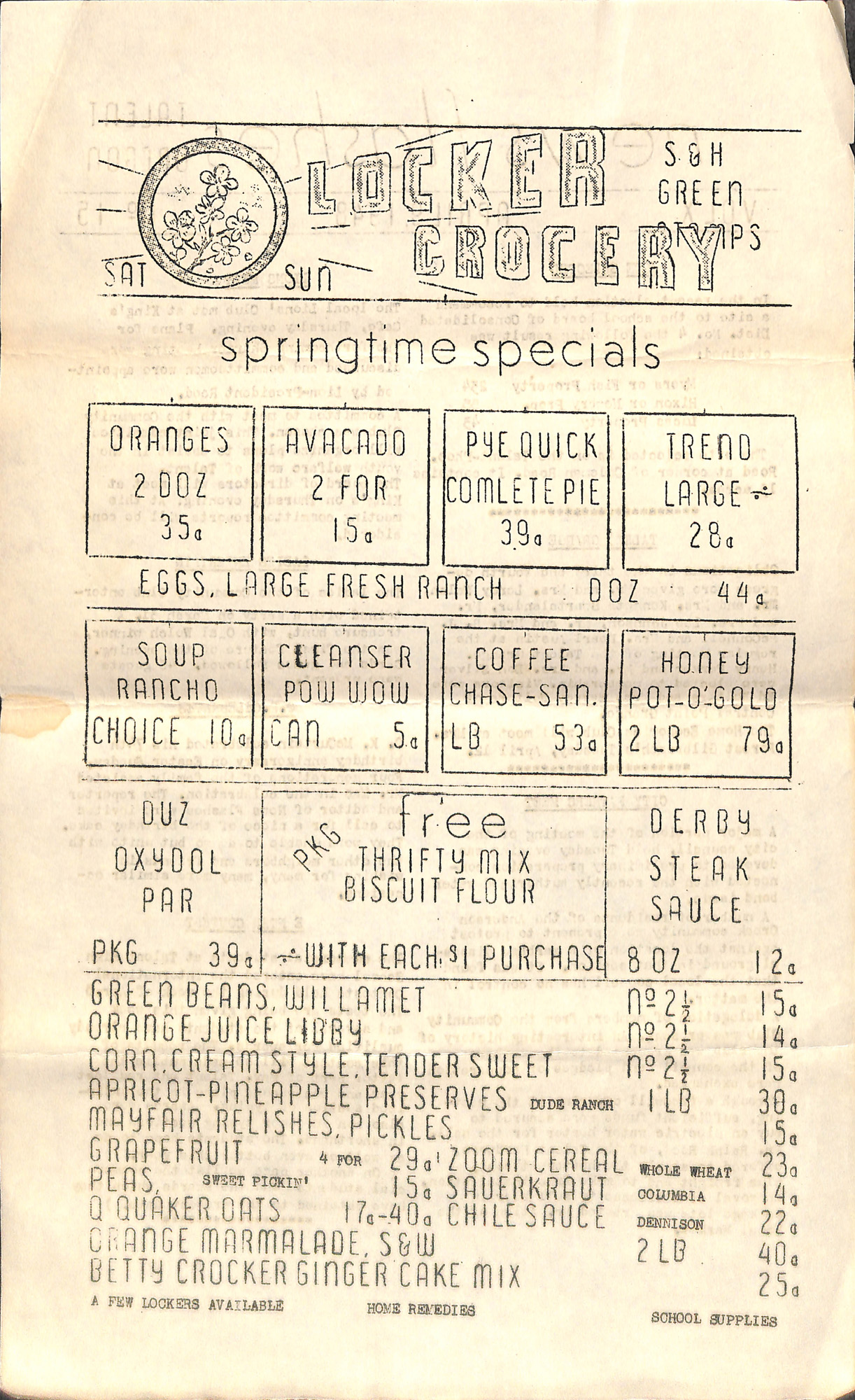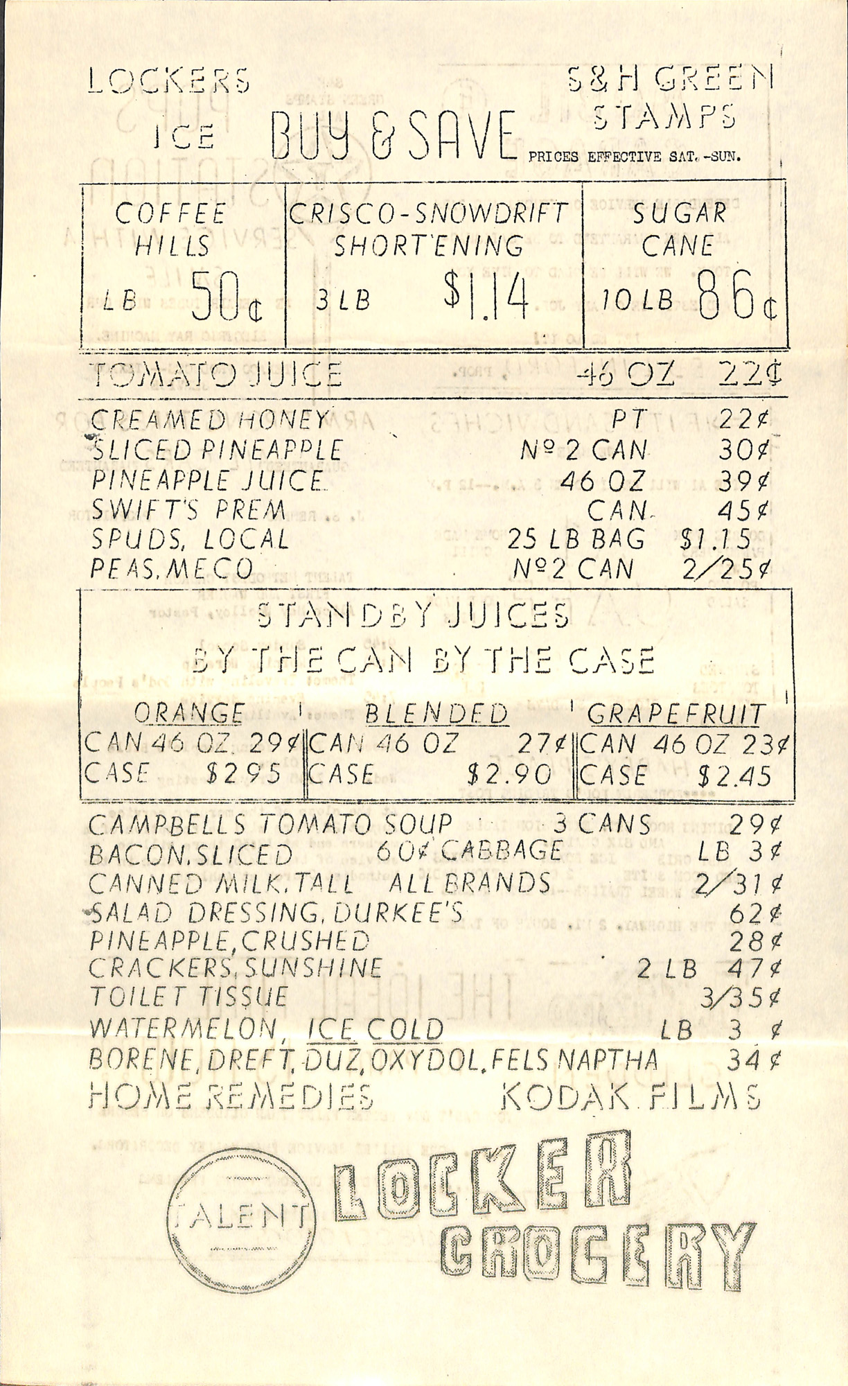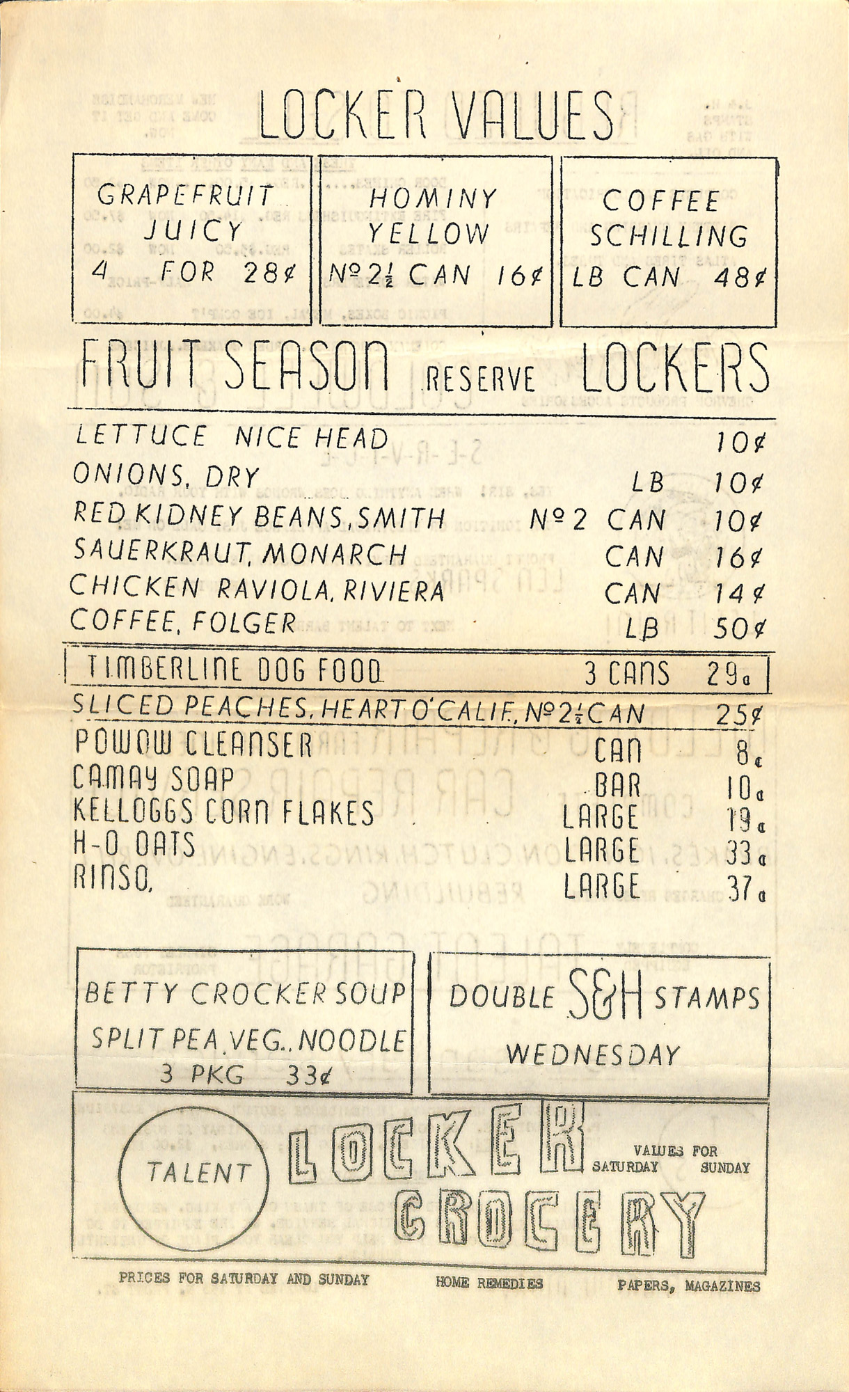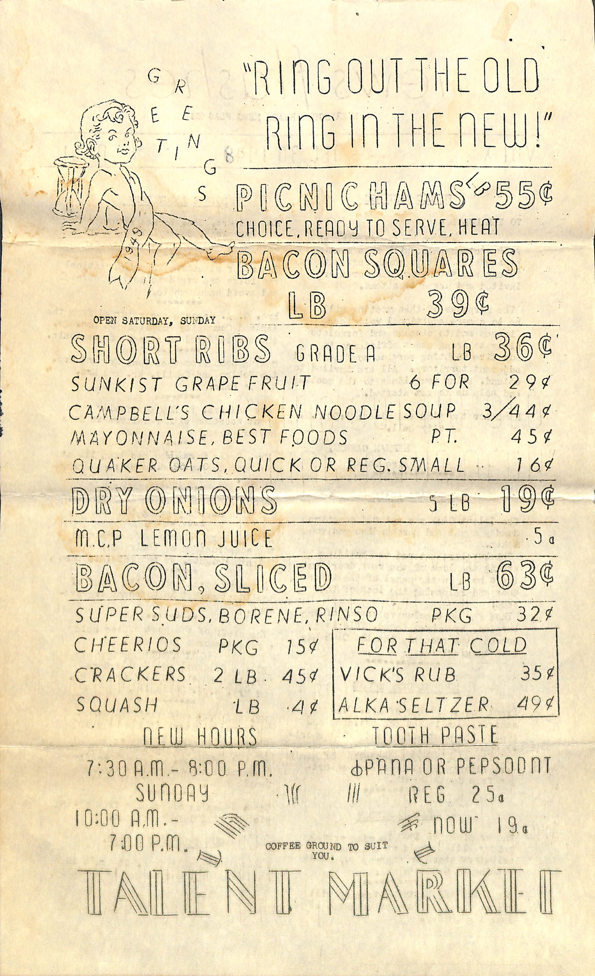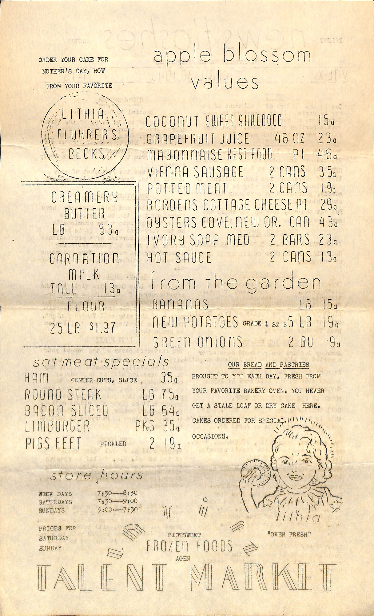 SATURDAY SPECIALS. GROCERY DEPARTMENT JELLO--5¢ pkg. SUGAR 10-lb. bag--50¢ FLOUR, KLAMATH HARD WHEAT 49-lb. bag--$1.69 FLOUR, KLAMATH, GOOD 49-lb. bag--$1.39 VEGETABLE DEPARTMENT SPUDS--50 lbs. #2--39¢ BRINER'S BERRIES 2 boxes--15¢ LEMONS, SUNKIST .doz--28¢ LETTUCE, large heads, 5¢ MEAT MARKET FINE STEAK--15¢ ROASTS--9¢ STEWS--6¢ LAMB CHOPS--15¢ BAKERY DEPARTMENT THAT GOOD HOMEMADE BREAD STILL 3 LOAVES--20¢ Many other treats at popular prices WE CARRY ICE, MEDFORD QUALITY AND PRICES FOR COMPLETE FOOD SERVICE, TRY RAY'S MARKET ----------------------------------------------------------------------------- TRAFFIC & WATER At the recent meeting of the city council, called for the purpose of considering the feasibility of securing more water, a proposition was made by the Talent Transient Camp that the members of the Camp would donate the necessary labor for the construction of a larger and deeper well at the lower city well property. It is planned to dig the well as deep as is necessary to secure an adequate flow of water, after which extensive drifts will be made to secure sufficient reservoir space. At the same meeting of the council it was voted to send for a supply of earwig parasites which are said to be efficacious in destroying the earwigs. It is requested that all owners of bantam chickens keep them penned up as a protection to the parasites…. KID PARTY Mrs. H. Good was hostess at a surprise kitchen shower Tuesday evening, honoring her sister, Miss Ione Bates, who is to be married to Mr. W. Dooms, Friday. The affair was given as a "Kid Party," and all the guests came dressed in an appropriate manner. The kids enjoyed punch and suckers and played kid games until a late hour. Many beautiful gifts were received by the guest of honor. About thirty friends of the guest of honor were present. Talent News Flashes June 23, 1934, now lost. Reprinted in the June 26, 1959 News Flashes -----------------------------------------------------------------------------