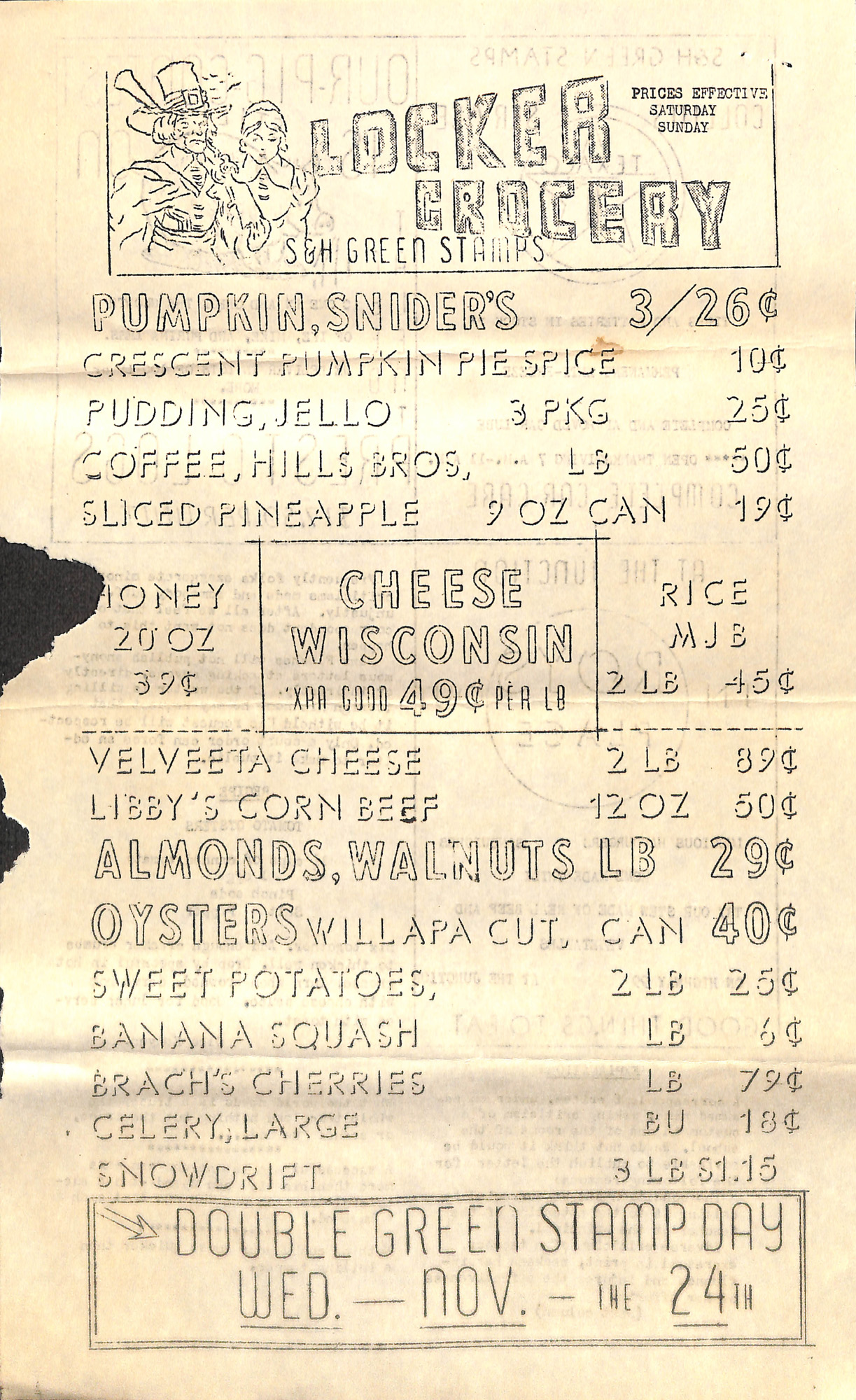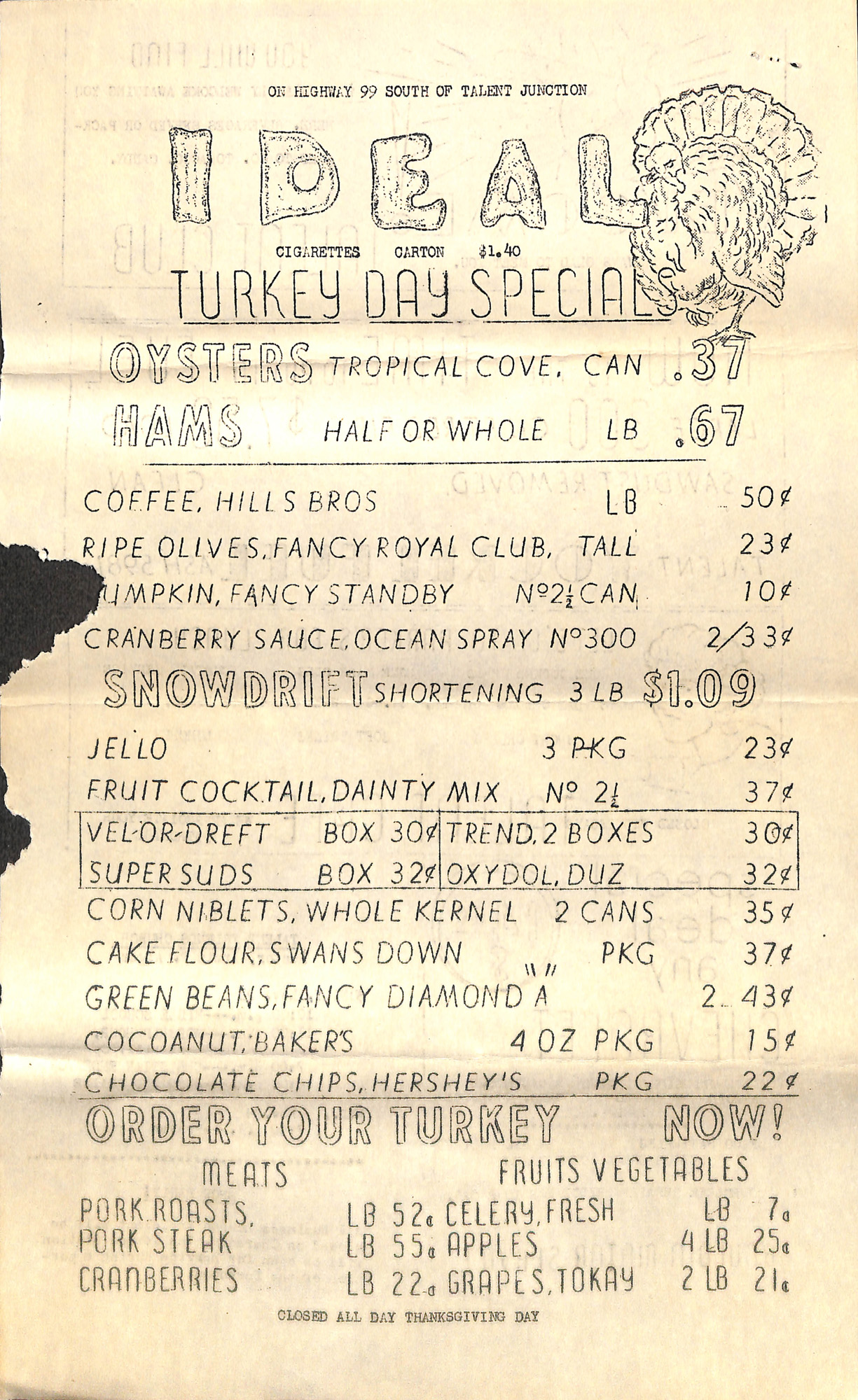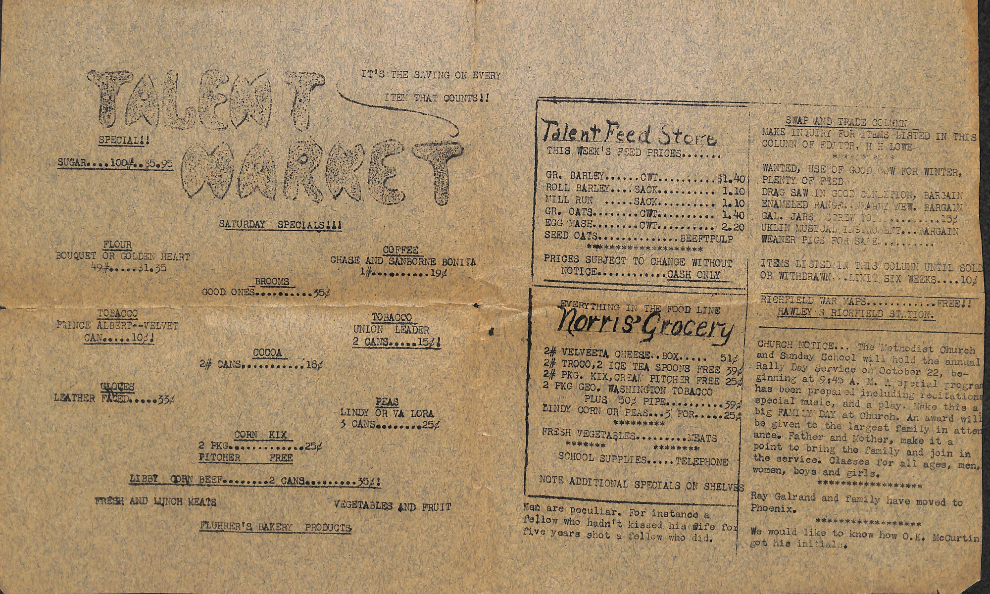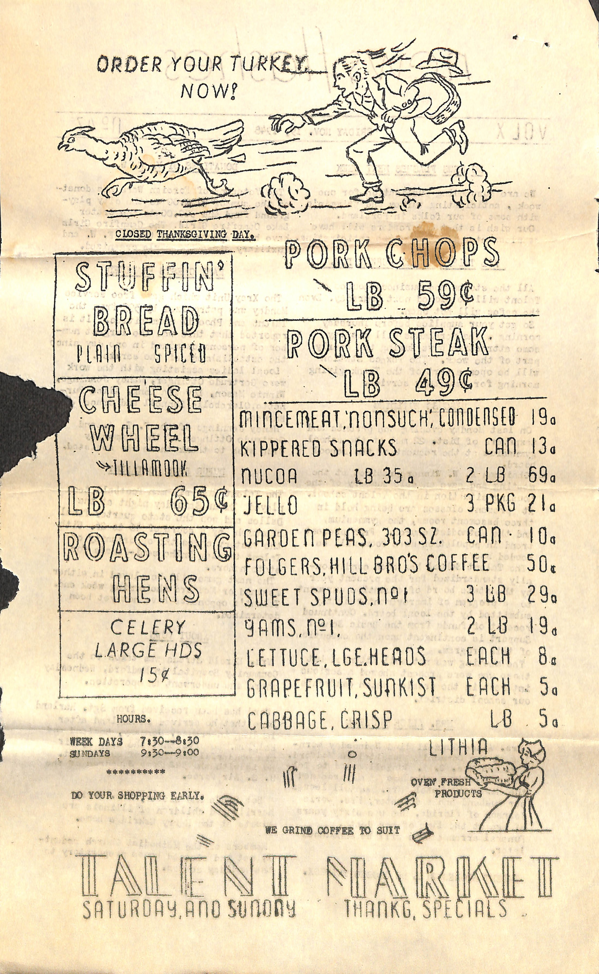 WE GIVE "TRADE IN TALENT" VOTES!! Prices Nov. 27-Dec. 2 RAYMAL PUMPKIN PER CAN 10¢ ALL READY FOR THE THANKSGIVING PIE! Large Fresh Oysters Per Pint--29¢ Make the Dinner Complete. GEM NUT OLEO. 2 LBS. 25¢ #1 Substitute for Butter. N.B.C. Crackers--2# Box--29¢ Crisp and Dainty. Jello--per pkg--6¢ True Fruit Flavor Royal Club Coffee--1# Glass Jar--29¢ One of America's Finest Coffees. Fine Beef Roasts, Wed. and Sat. Special--12½¢ Sweet Spuds, Celery, Fruits. TALENT FEED STORE Klamath Alfalfa, ton lots $13.00 Red Kanota Seed Oats--$1.40 Seed Rye (Recleaned) $1.20 Seed Wheat 1.60 Ground Barley 1.20 (ALL PRICES ABOVE, cwt.) Bonneville Hard Wheat Flour--49# sack--$1.80 Full Line Sperry's Dairy and Poultry Feed. Custom Grinding and Cleaning TALENT NEW AND SECOND HAND STORE. SOME PRICES Wash tubs--70¢ Hotcake griddles--from 20¢ Light bulbs--15¢ Flashlight batteries--10¢ Copper boiler--$2.00 Washboard--50¢ FORDSON TRACTOR PARTS! Hubby: My wife cried so hard that the tears ran down her back! Doctor: Hum, a serious case of bacteria. We cannot achieve prosperity and bankruptcy at the same time. NEWS FLASHING. Doctors of Jackson Co. and the rest of Medford, consulting about infantile paralysis, having spectacles on end of nose, announcing: "Oh, no! No danger! All getting better, please! No case of jittering! Just call it 'Polly Negro' (after movie lady), sounding much nicer. Council-maniacs of Talent and school-directing persons are 'dumb nuts' for soaking on lid without our 'Oaky-Doak'. Quiet please! 'Rah, rah, rah!