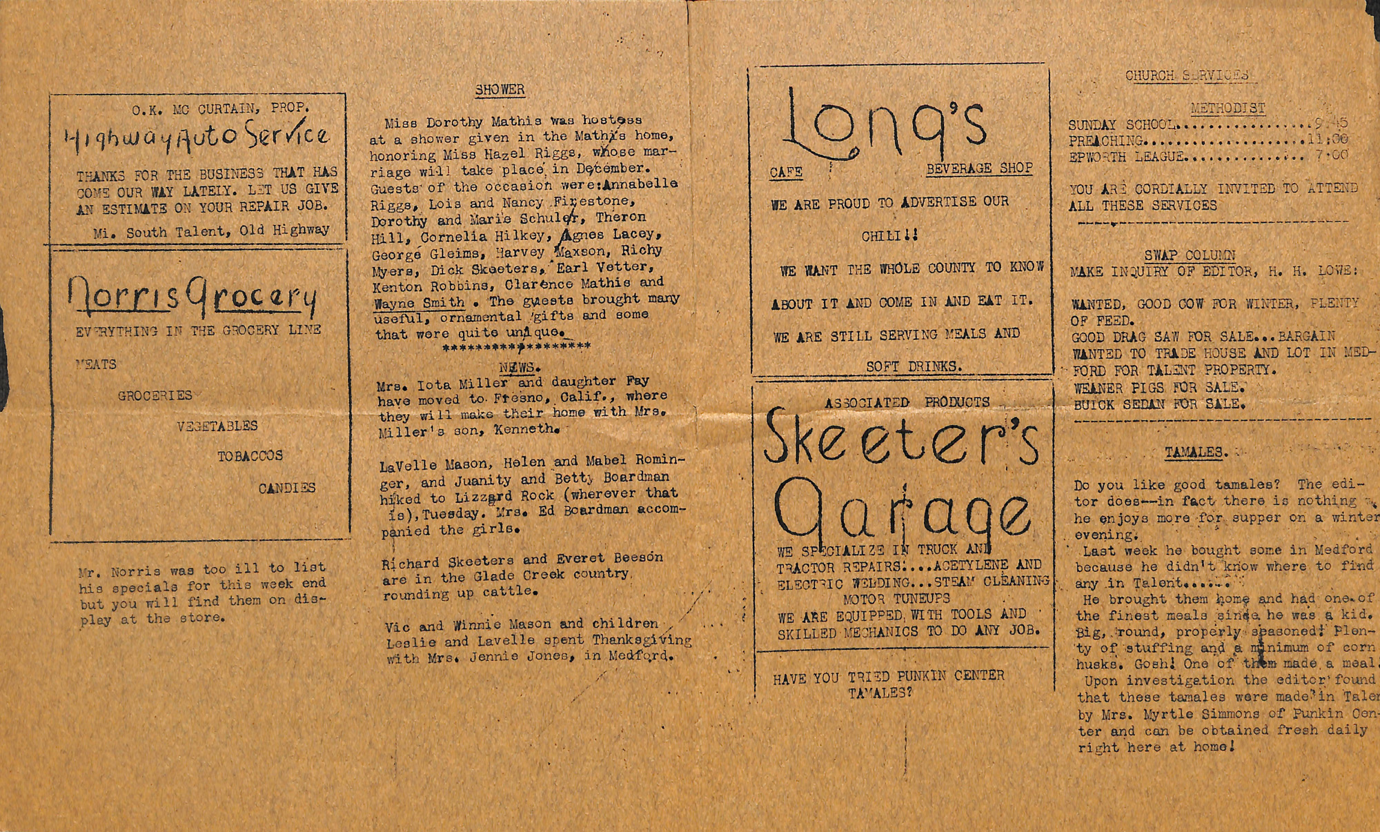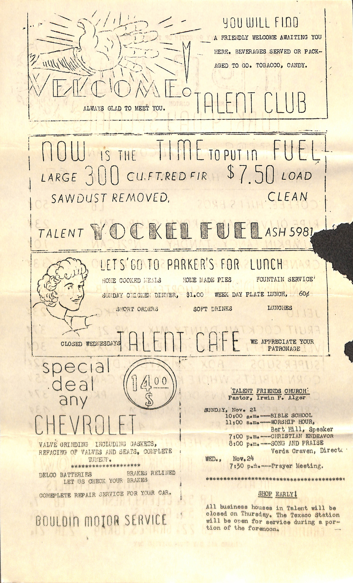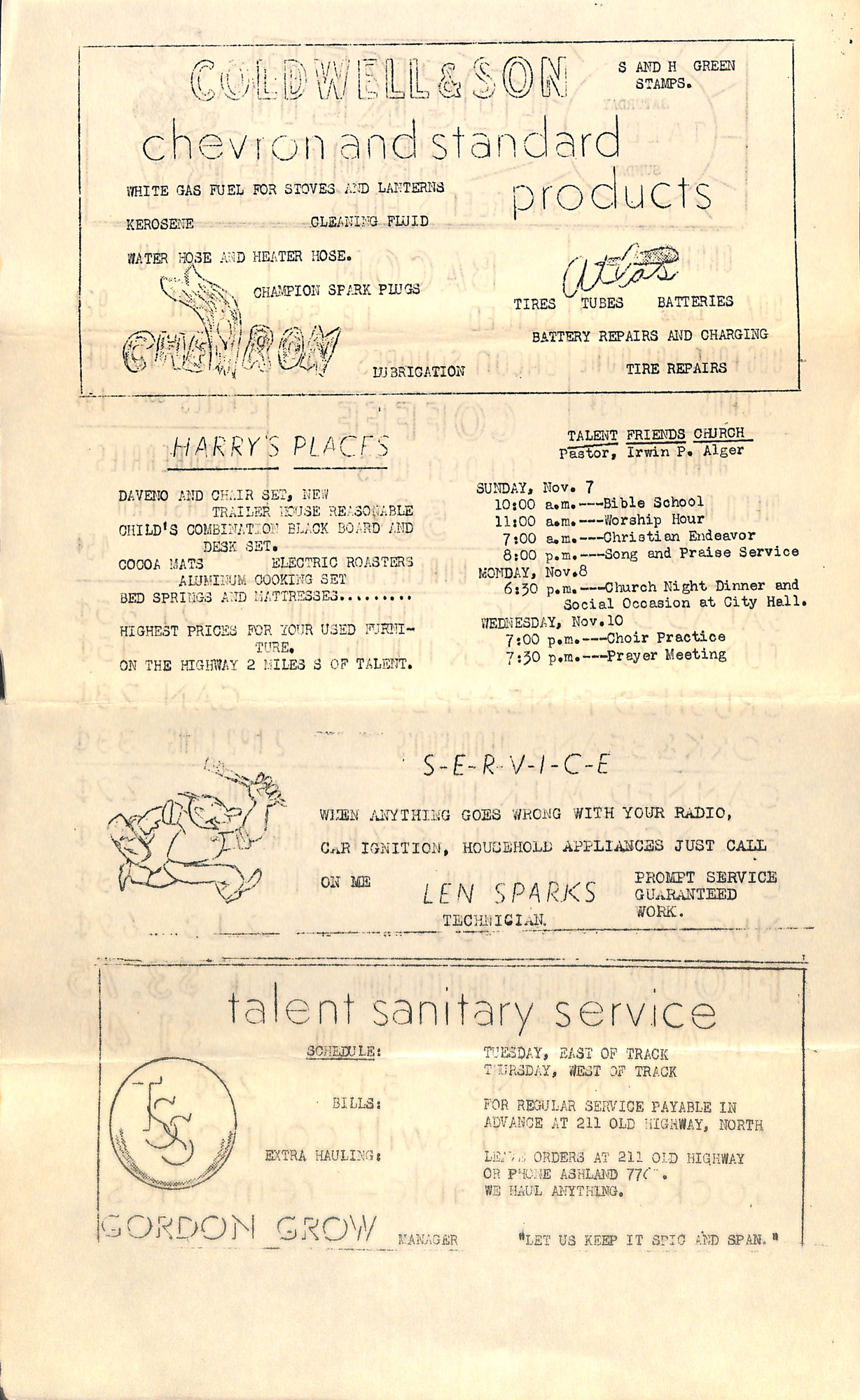 Page 5, full-page ad for: TALENT LOCKER GROCERY Page 6, ads for: COLDWELL & SON HARRY'S PLACE LEN SPARKS ELECTRICAL TECHNICIAN TALENT SANITARY SERVICE TALENT FRIENDS CHURCH Pastor, Irwin P. Alger SUNDAY, Nov. 7 10:00 a.m.--Bible School 11:00 a.m.--Worship Hour 7:00 a.m.--Christian Endeavor 8:00 a.m.--Song and Praise Service MONDAY, Nov. 8 6:30 p.m.--Church Night Dinner and Social Occasion at City Hall. WEDNESDAY, Nov. 10 7:00 p.m.--Choir Practice 7:30 p.m.--Prayer Meeting Page 7, ads for: WHITTLE TRANSFER LEOTA'S MALT SHOP SHELL STATION HARVEY PETERSON, REALTOR ACME CLEANING LUNSFORD MOBIL GARAGE FARMERS INSURANCE GROUP Wesley Boyer is growing a cute little mustache, according to a correspondent. It is our opinion that Wesley has a legal and social right to grow a mustache--or whiskers if he prefers. The editor is thinking of doing the same--but not for the same reason. Art Wisner received two votes for coroner and also two votes for county school sup't. in the recent calamity. Page 8, ads for: KING'S CAFÉ SULLIVAN BROTHERS GILBRAITH'S MOBIL STATION FROM "JUST A NEIGHBOR."