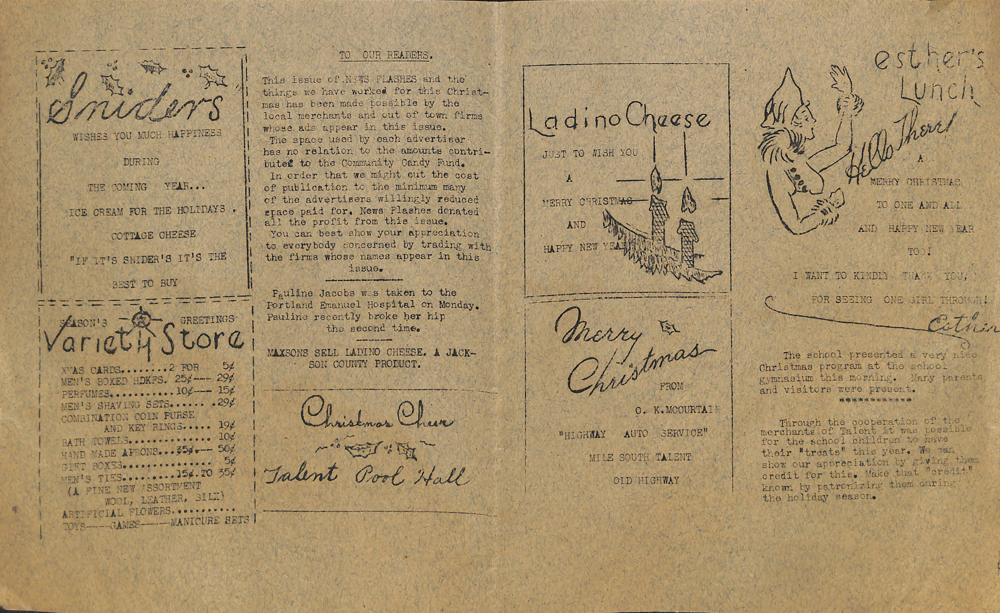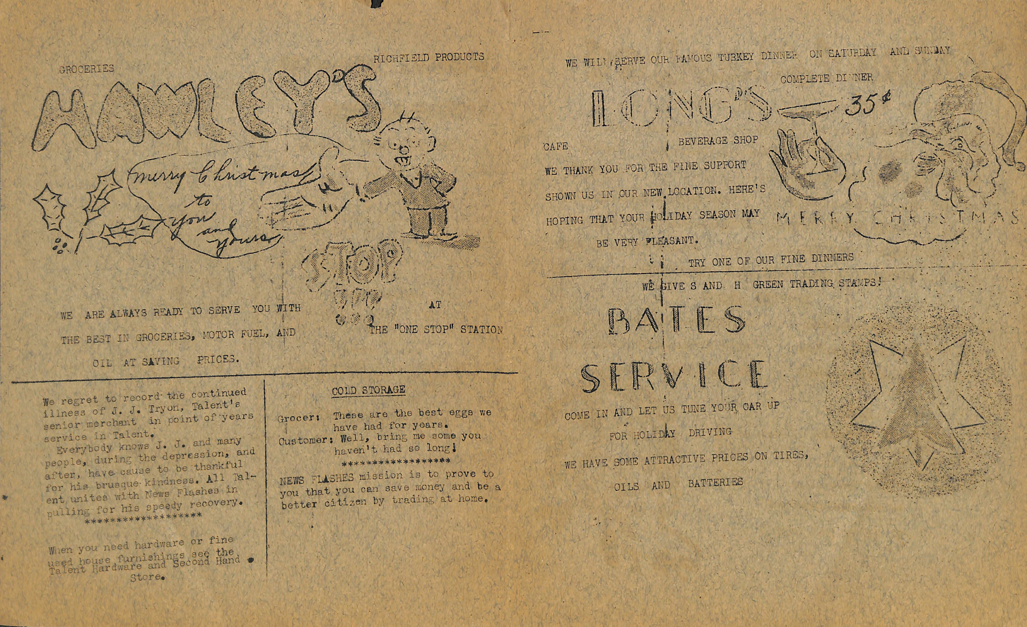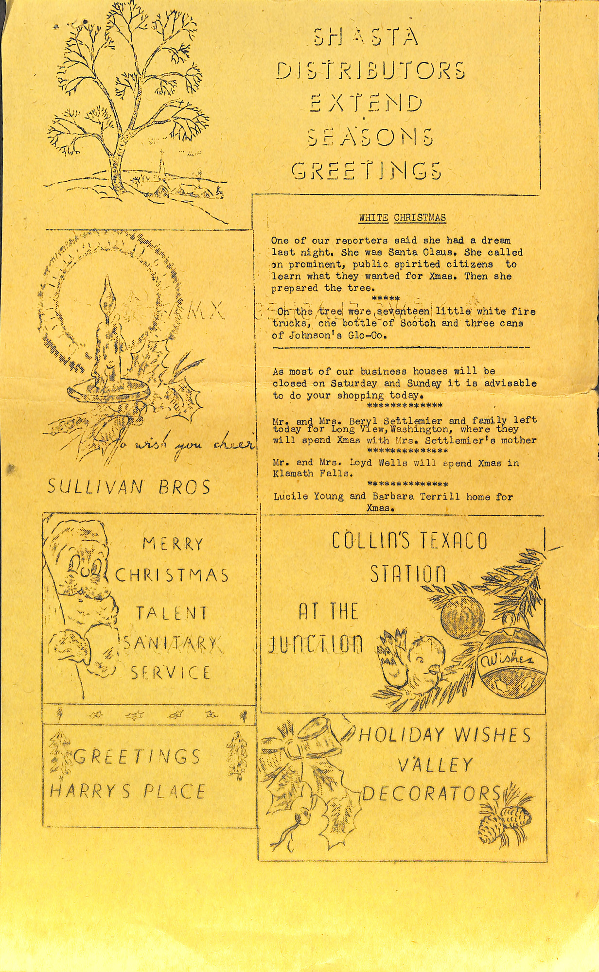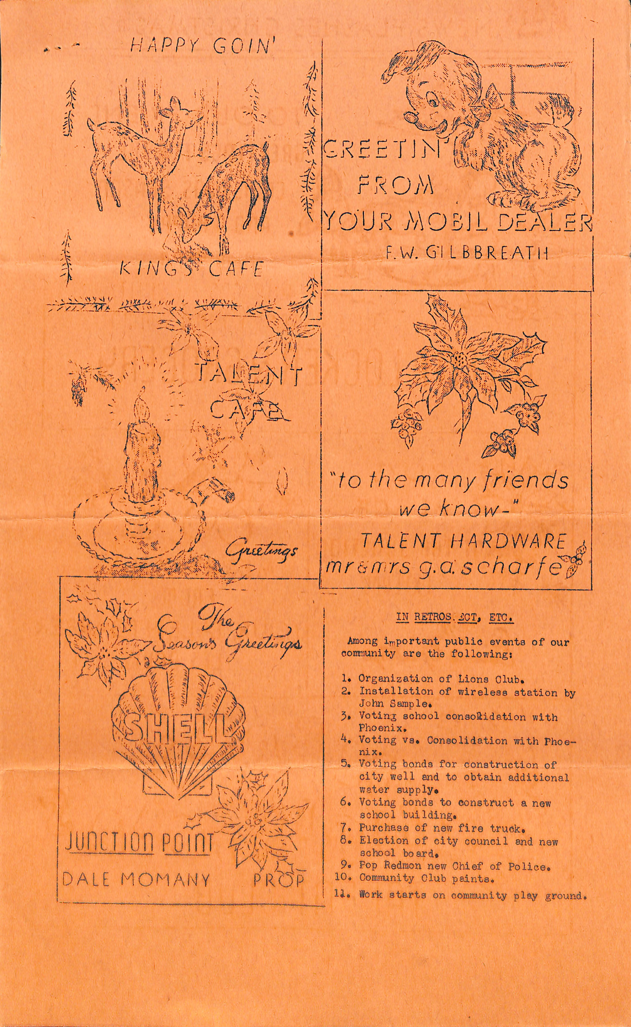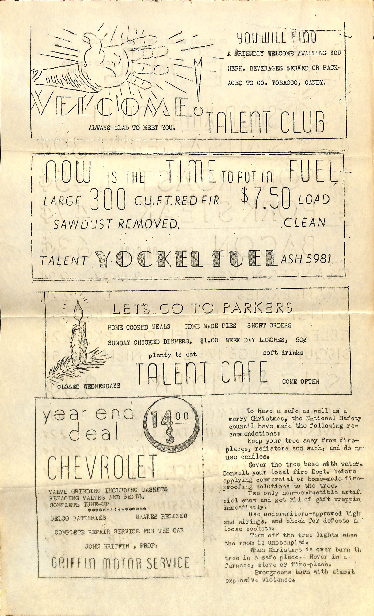 One of our reporters said she had a dream last night. She was Santa Claus. She called on prominent, public-spirited citizens to learn what they wanted for Xmas. Then she prepared the tree. On the tree were seventeen little white fire trucks, one bottle of Scotch and three cans of Johnson's Glo-Go. As most of our business houses will be closed on Saturday and Sunday it is advisable to do your shopping today. Mr. and Mrs. Beryl Settlemier and family left today for Longview, Washington, where they will spend Xmas with Mrs. Settlemier's mother. Mr. and Mrs. Lloyd Wells will spend Xmas in Klamath Falls. Lucile Young and Barbara Terrill home for Xmas. Page 12, Christmas greetings ads for: TALENT LOCKER & GROCERY ROY'S PLACE TALENT BARBER TALENT CLUB Page 13, Christmas greetings ads for: KING'S CAFÉ GILBREATH MOBIL TALENT CAFÉ TALENT HARDWARE JUNCTION POINT SHELL IN RETROS, ETC., ETC.