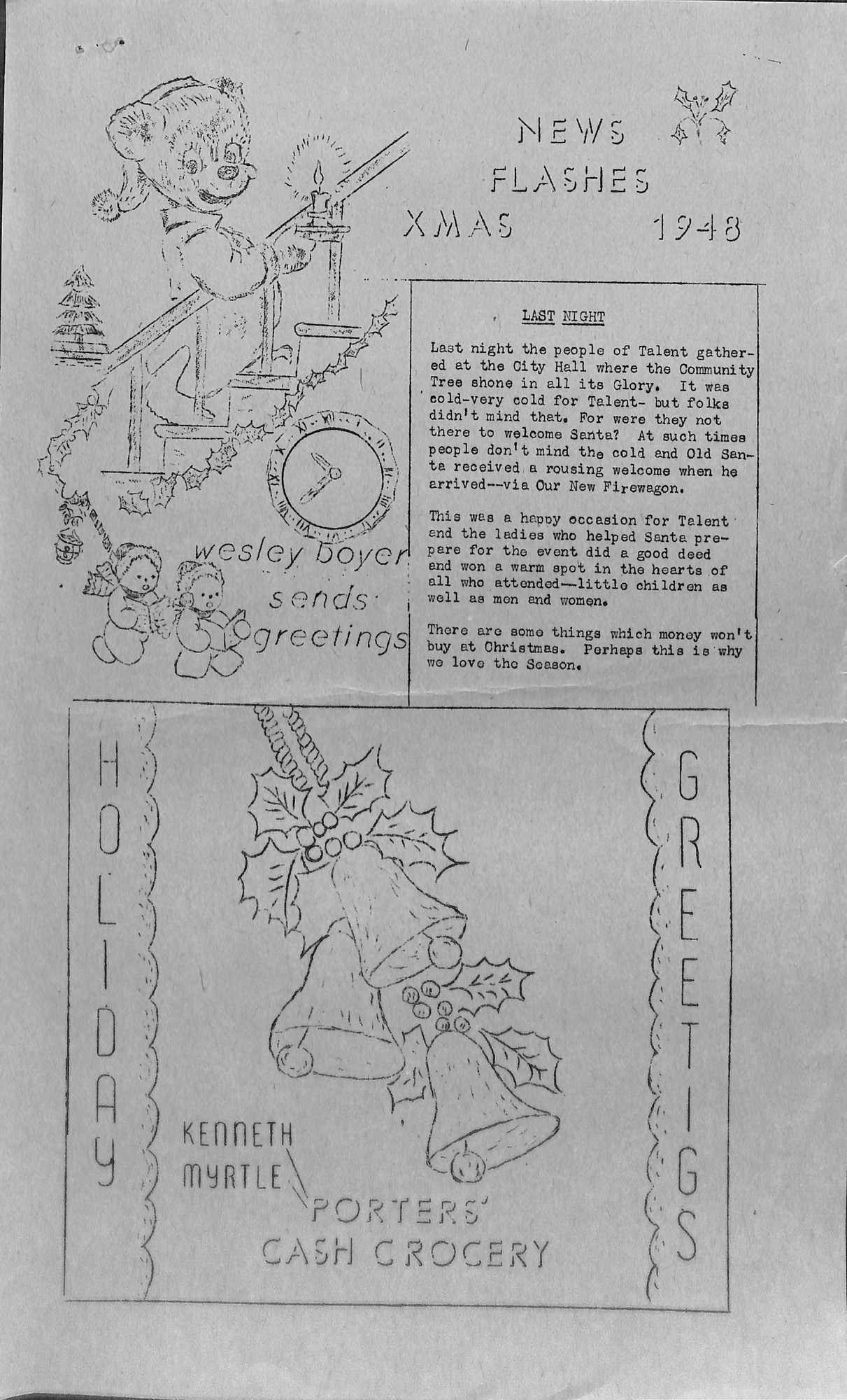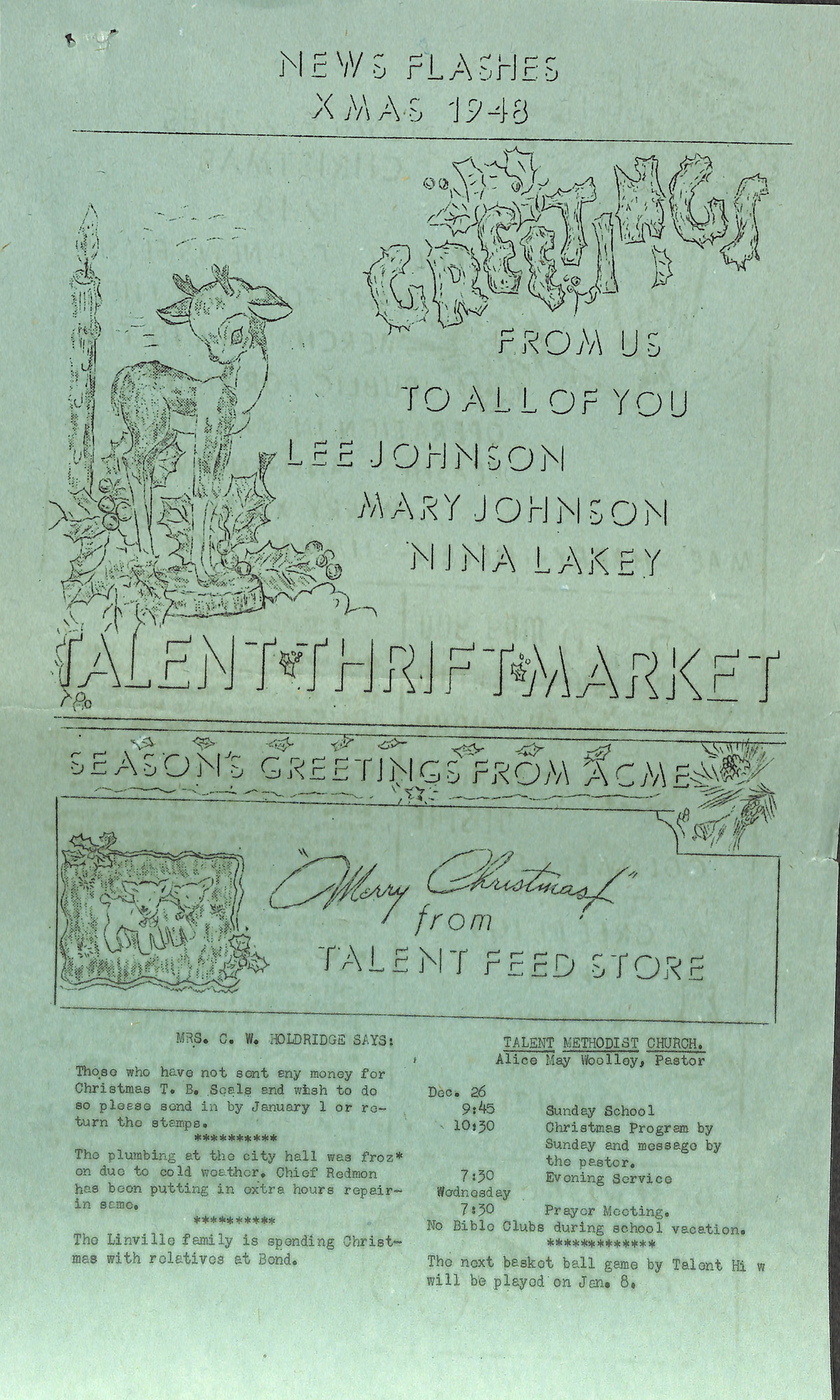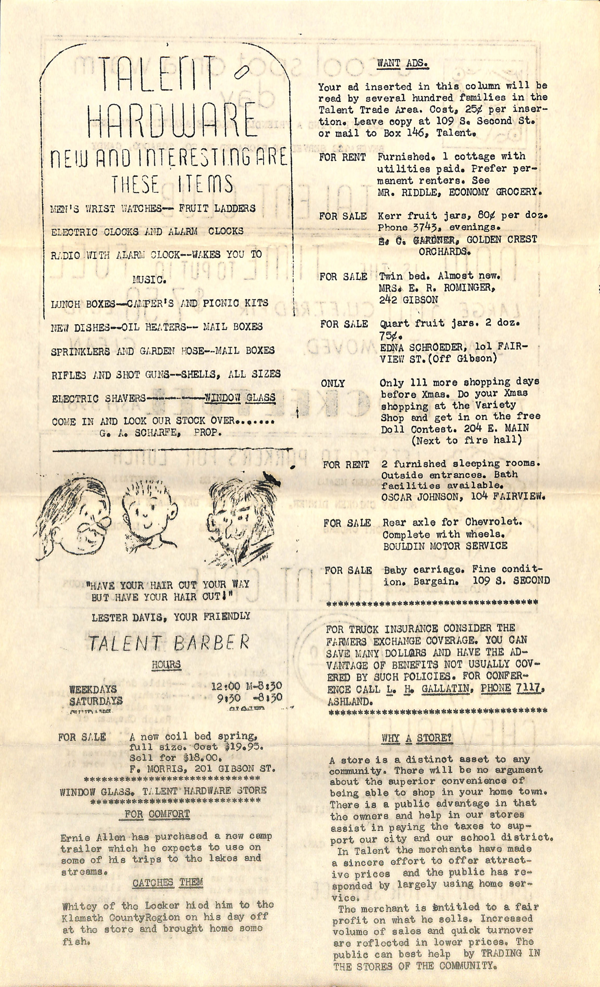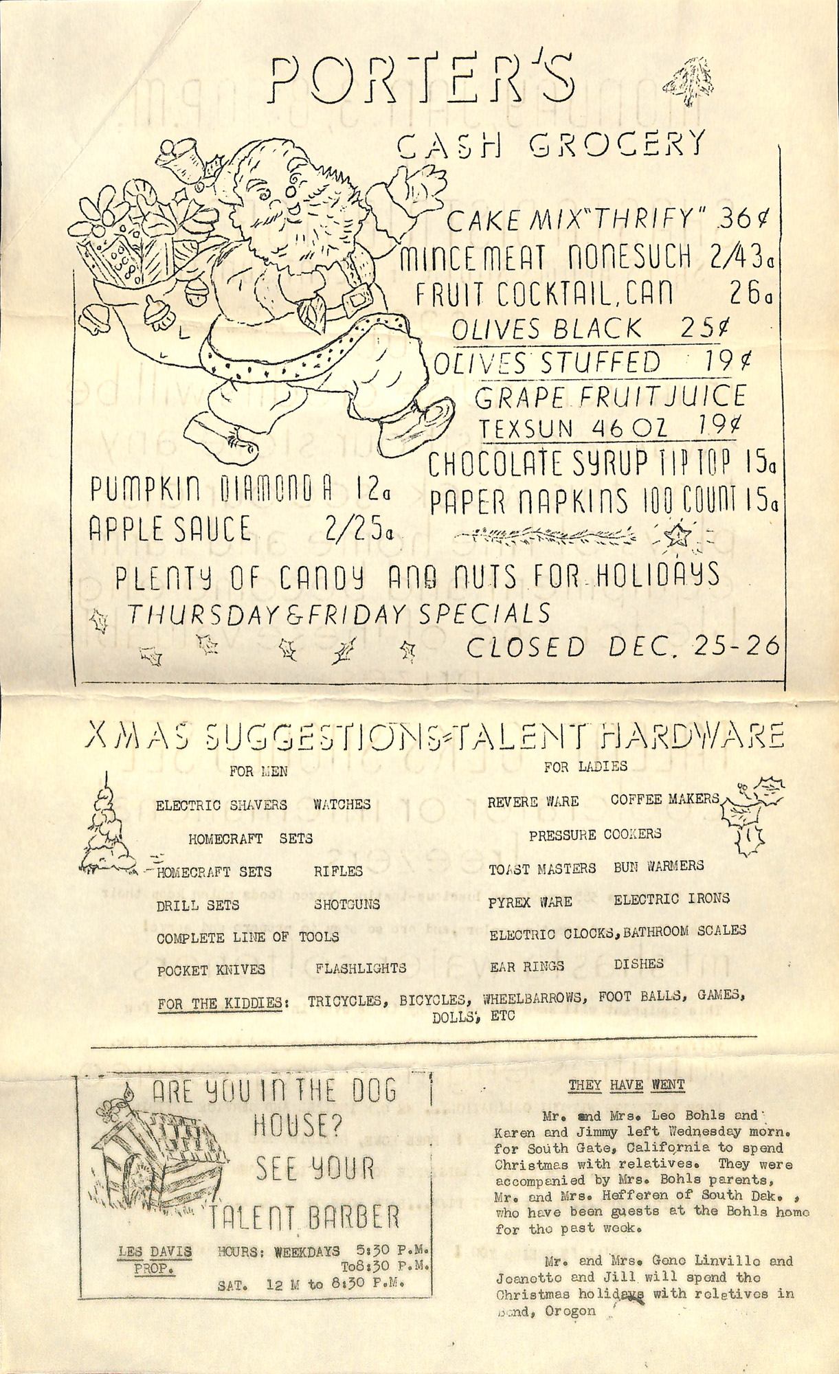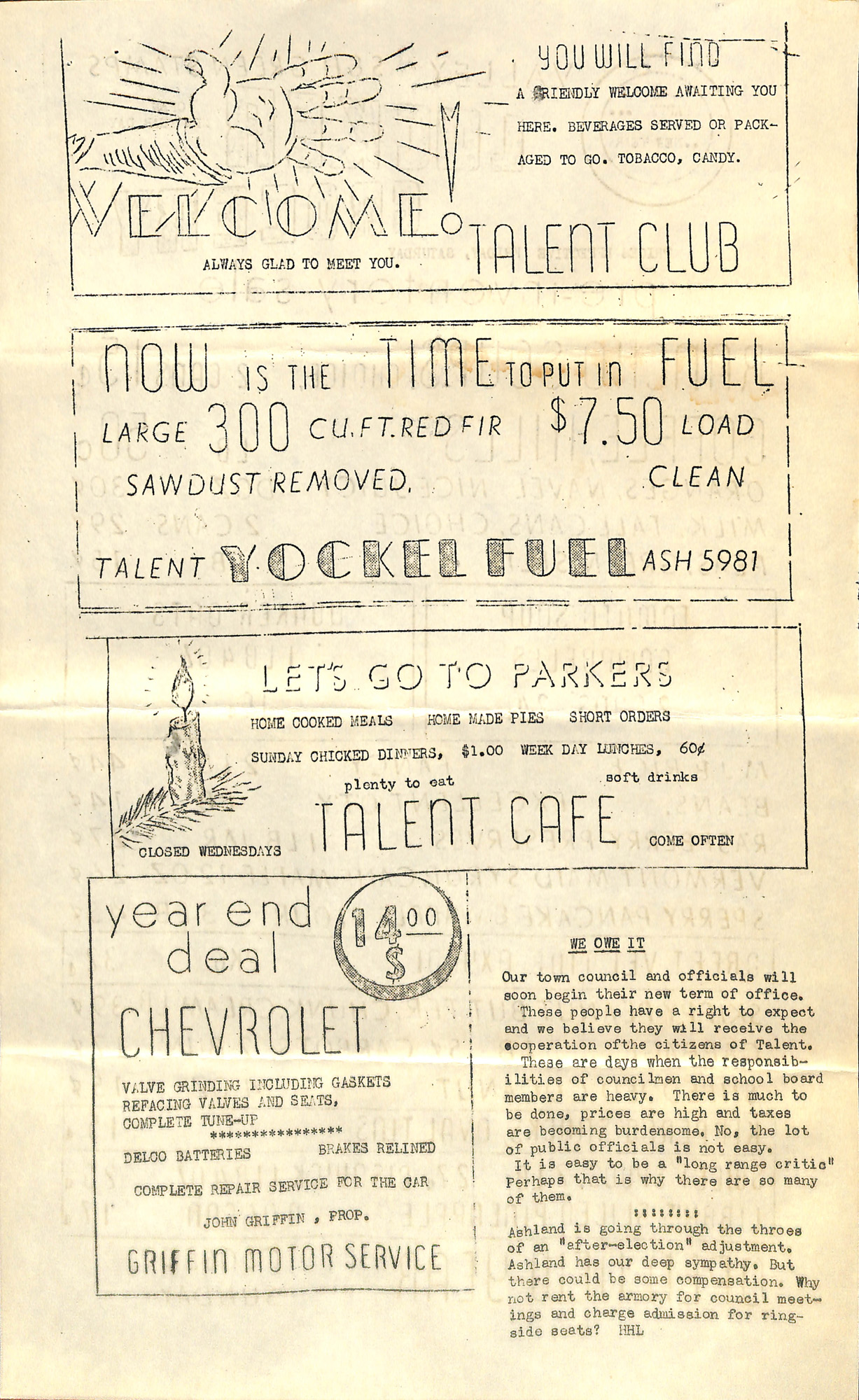 One of our reporters said she had a dream last night. She was Santa Claus. She called on prominent, public-spirited citizens to learn what they wanted for Xmas. Then she prepared the tree. On the tree were seventeen little white fire trucks, one bottle of Scotch and three cans of Johnson's Glo-Go. As most of our business houses will be closed on Saturday and Sunday it is advisable to do your shopping today. Mr. and Mrs. Beryl Settlemier and family left today for Longview, Washington, where they will spend Xmas with Mrs. Settlemier's mother. Mr. and Mrs. Lloyd Wells will spend Xmas in Klamath Falls. Lucile Young and Barbara Terrill home for Xmas. Page 12, Christmas greetings ads for: TALENT LOCKER & GROCERY ROY'S PLACE TALENT BARBER TALENT CLUB Page 13, Christmas greetings ads for: KING'S CAFÉ GILBREATH MOBIL TALENT CAFÉ TALENT HARDWARE JUNCTION POINT SHELL IN RETROS, ETC., ETC.