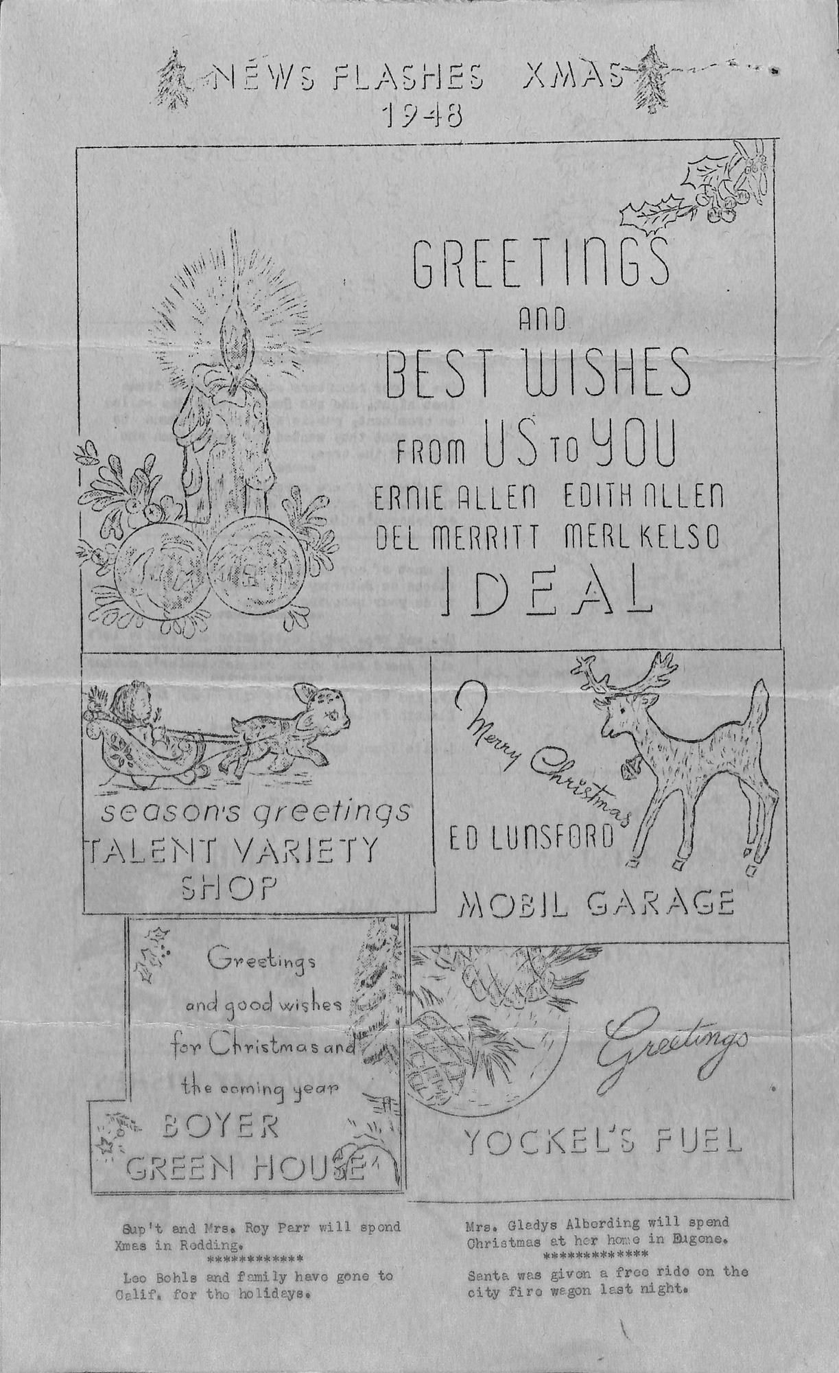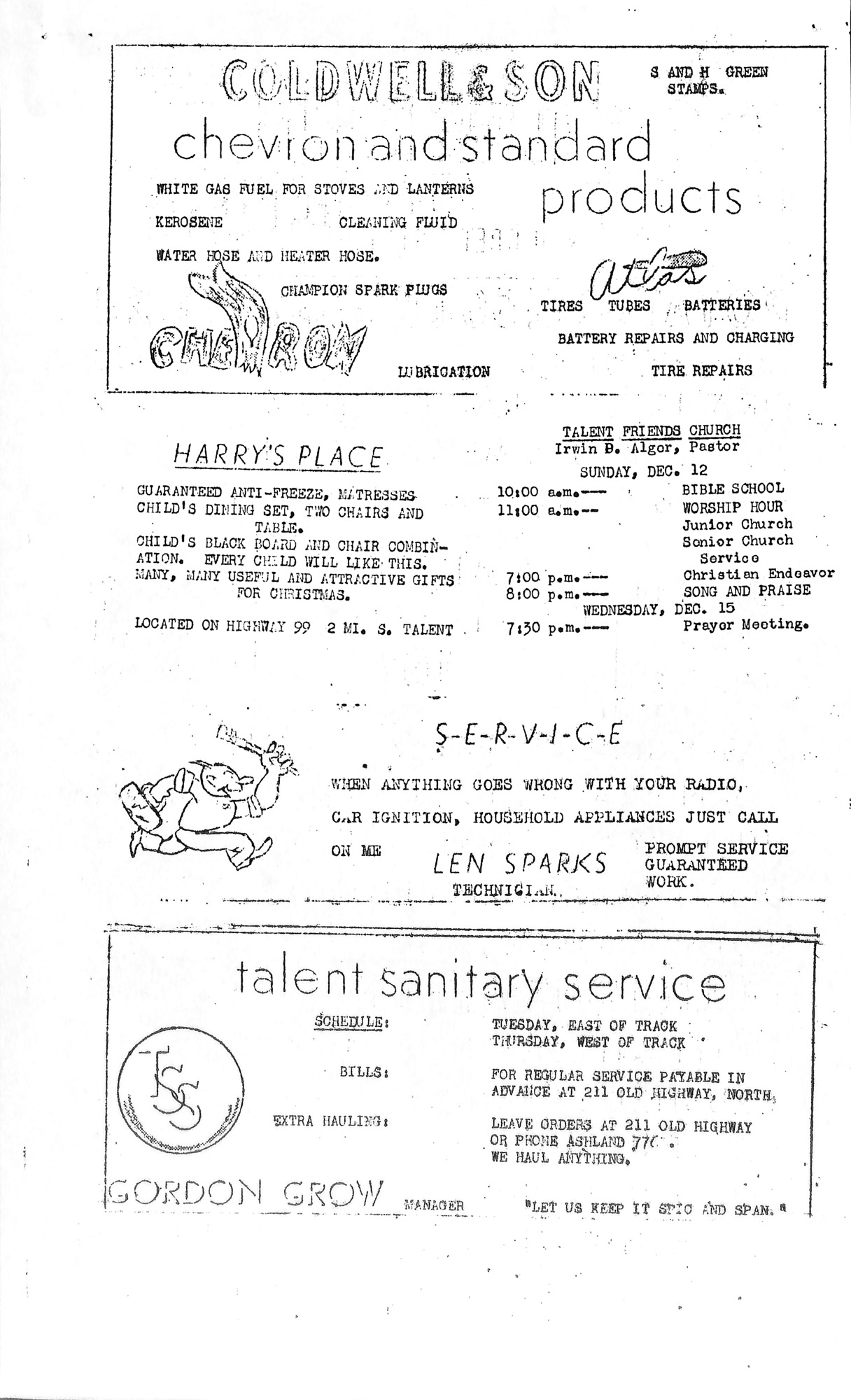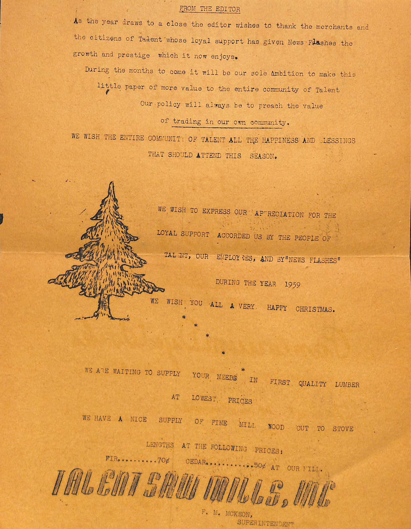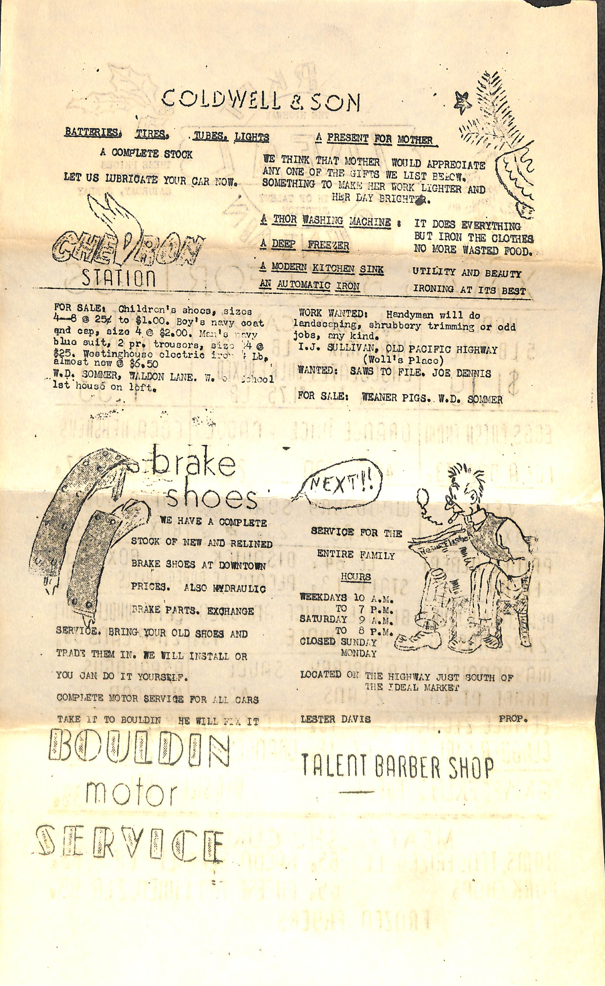 One of our reporters said she had a dream last night. She was Santa Claus. She called on prominent, public-spirited citizens to learn what they wanted for Xmas. Then she prepared the tree. On the tree were seventeen little white fire trucks, one bottle of Scotch and three cans of Johnson's Glo-Go. As most of our business houses will be closed on Saturday and Sunday it is advisable to do your shopping today. Mr. and Mrs. Beryl Settlemier and family left today for Longview, Washington, where they will spend Xmas with Mrs. Settlemier's mother. Mr. and Mrs. Lloyd Wells will spend Xmas in Klamath Falls. Lucile Young and Barbara Terrill home for Xmas. Page 12, Christmas greetings ads for: TALENT LOCKER & GROCERY ROY'S PLACE TALENT BARBER TALENT CLUB Page 13, Christmas greetings ads for: KING'S CAFÉ GILBREATH MOBIL TALENT CAFÉ TALENT HARDWARE JUNCTION POINT SHELL IN RETROS, ETC., ETC.