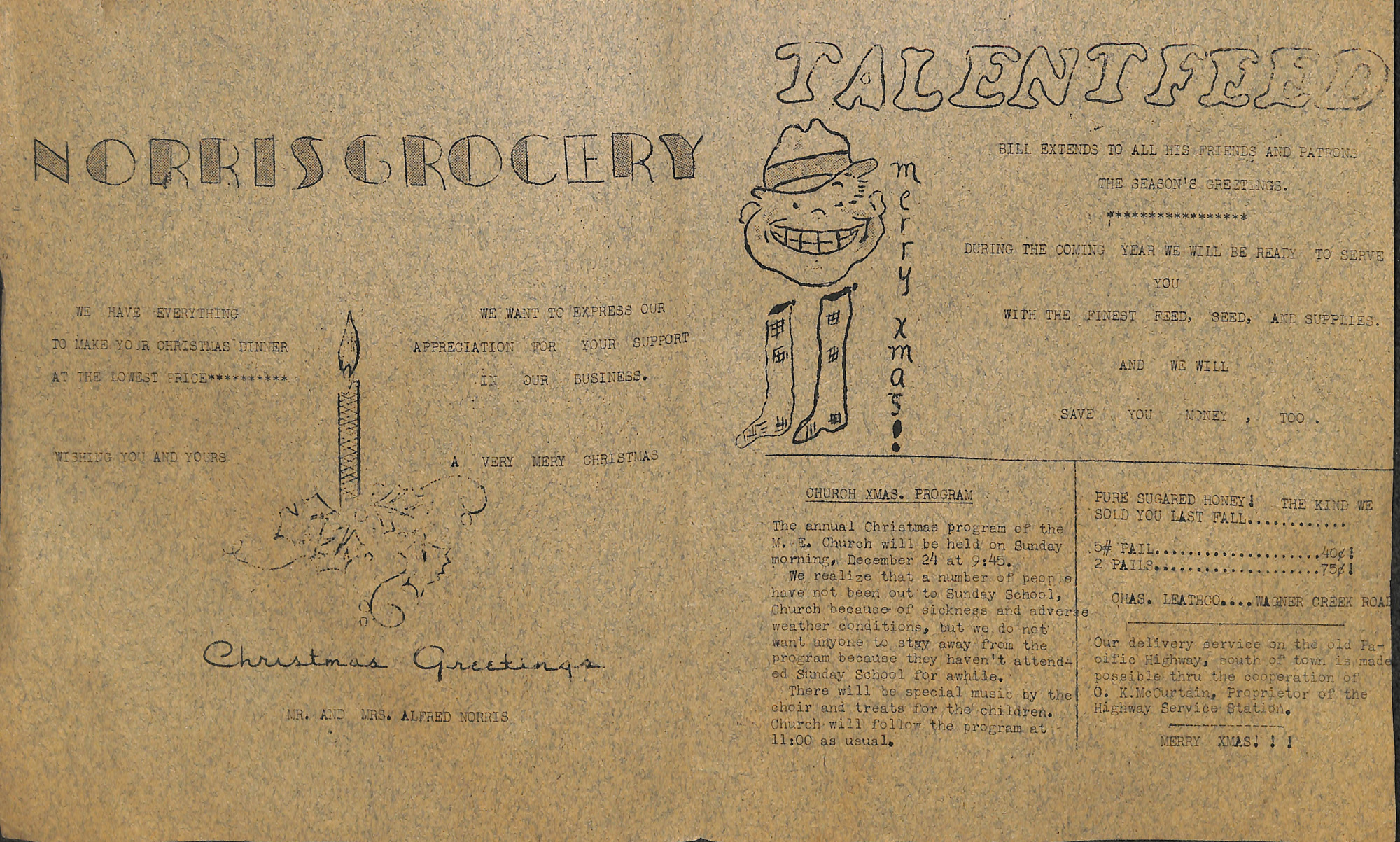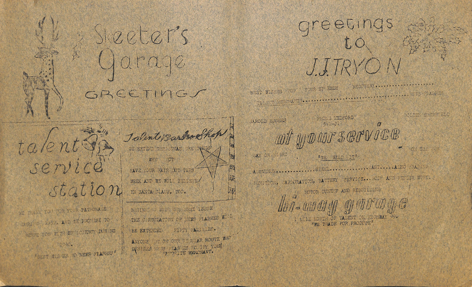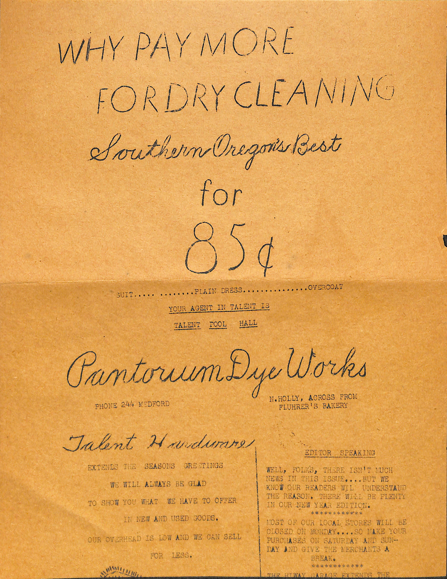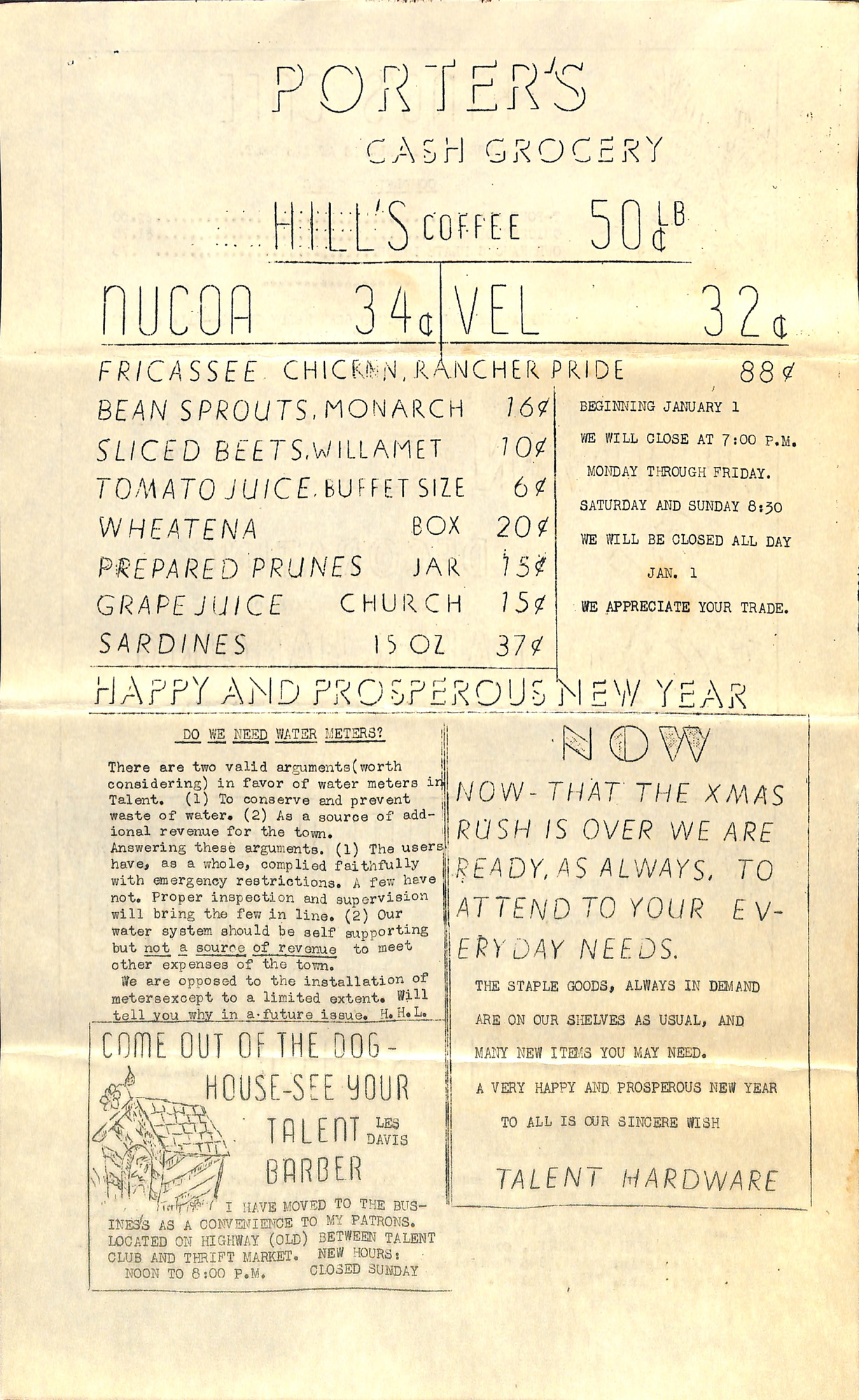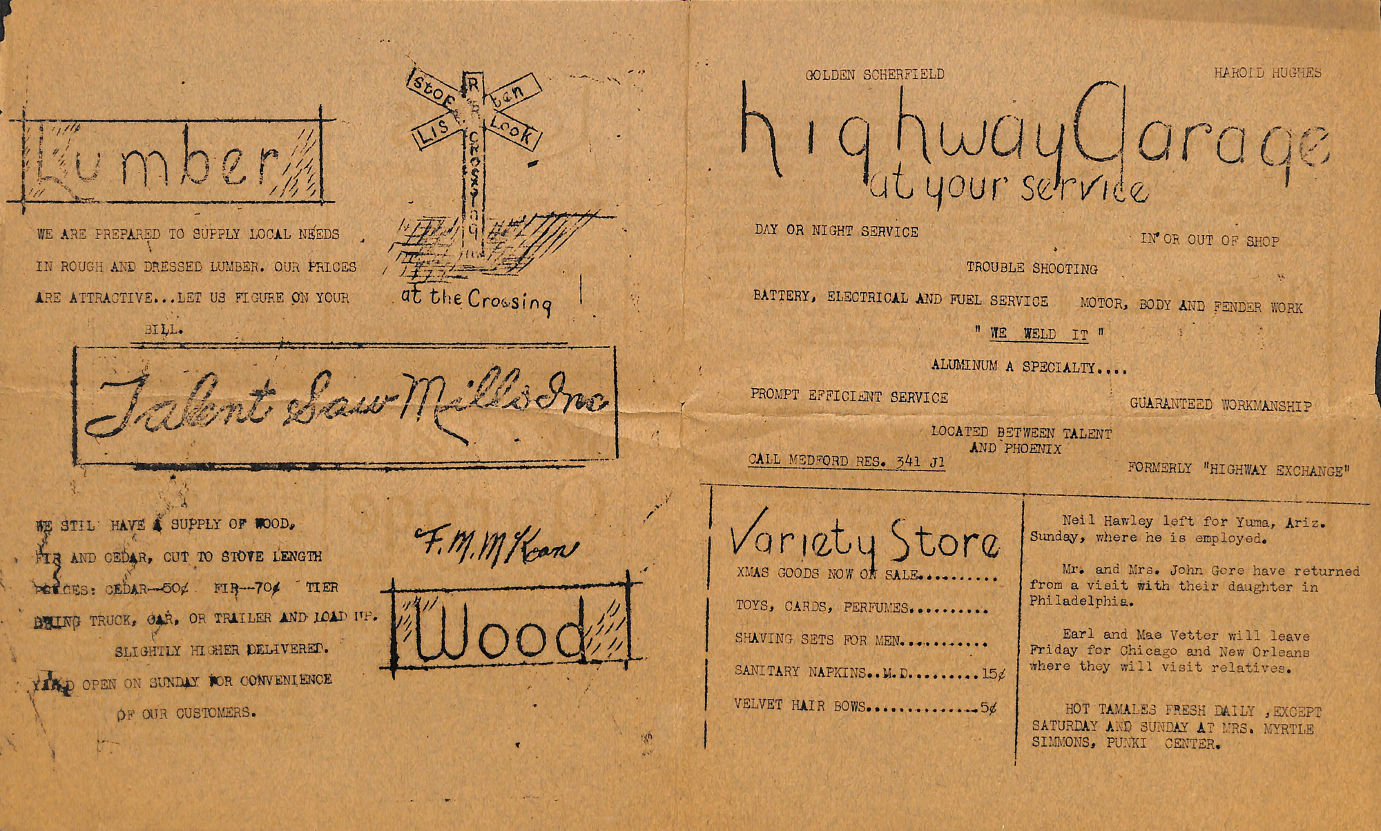 One of our reporters said she had a dream last night. She was Santa Claus. She called on prominent, public-spirited citizens to learn what they wanted for Xmas. Then she prepared the tree. On the tree were seventeen little white fire trucks, one bottle of Scotch and three cans of Johnson's Glo-Go. As most of our business houses will be closed on Saturday and Sunday it is advisable to do your shopping today. Mr. and Mrs. Beryl Settlemier and family left today for Longview, Washington, where they will spend Xmas with Mrs. Settlemier's mother. Mr. and Mrs. Lloyd Wells will spend Xmas in Klamath Falls. Lucile Young and Barbara Terrill home for Xmas. Page 12, Christmas greetings ads for: TALENT LOCKER & GROCERY ROY'S PLACE TALENT BARBER TALENT CLUB Page 13, Christmas greetings ads for: KING'S CAFÉ GILBREATH MOBIL TALENT CAFÉ TALENT HARDWARE JUNCTION POINT SHELL IN RETROS, ETC., ETC.