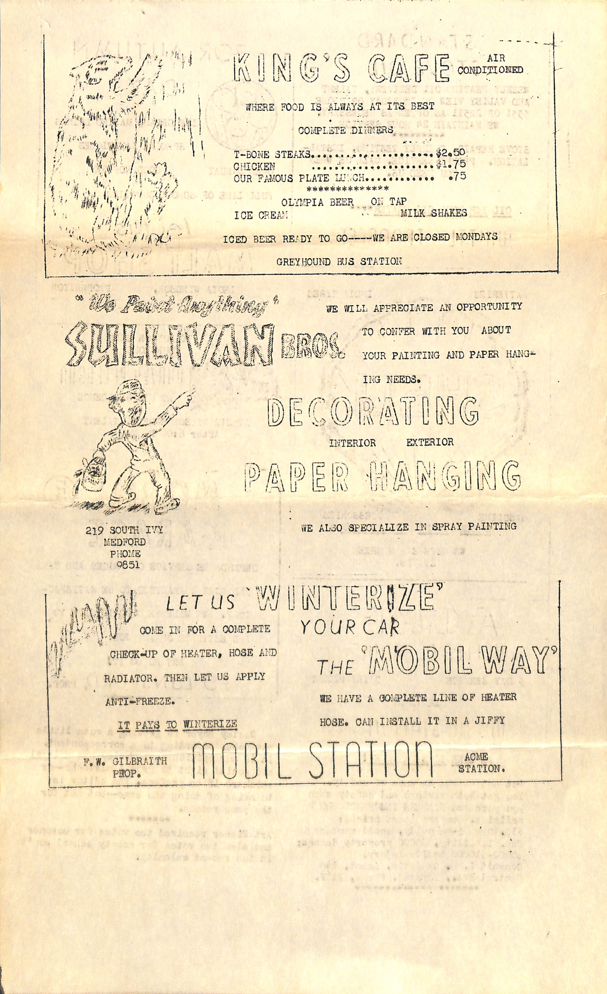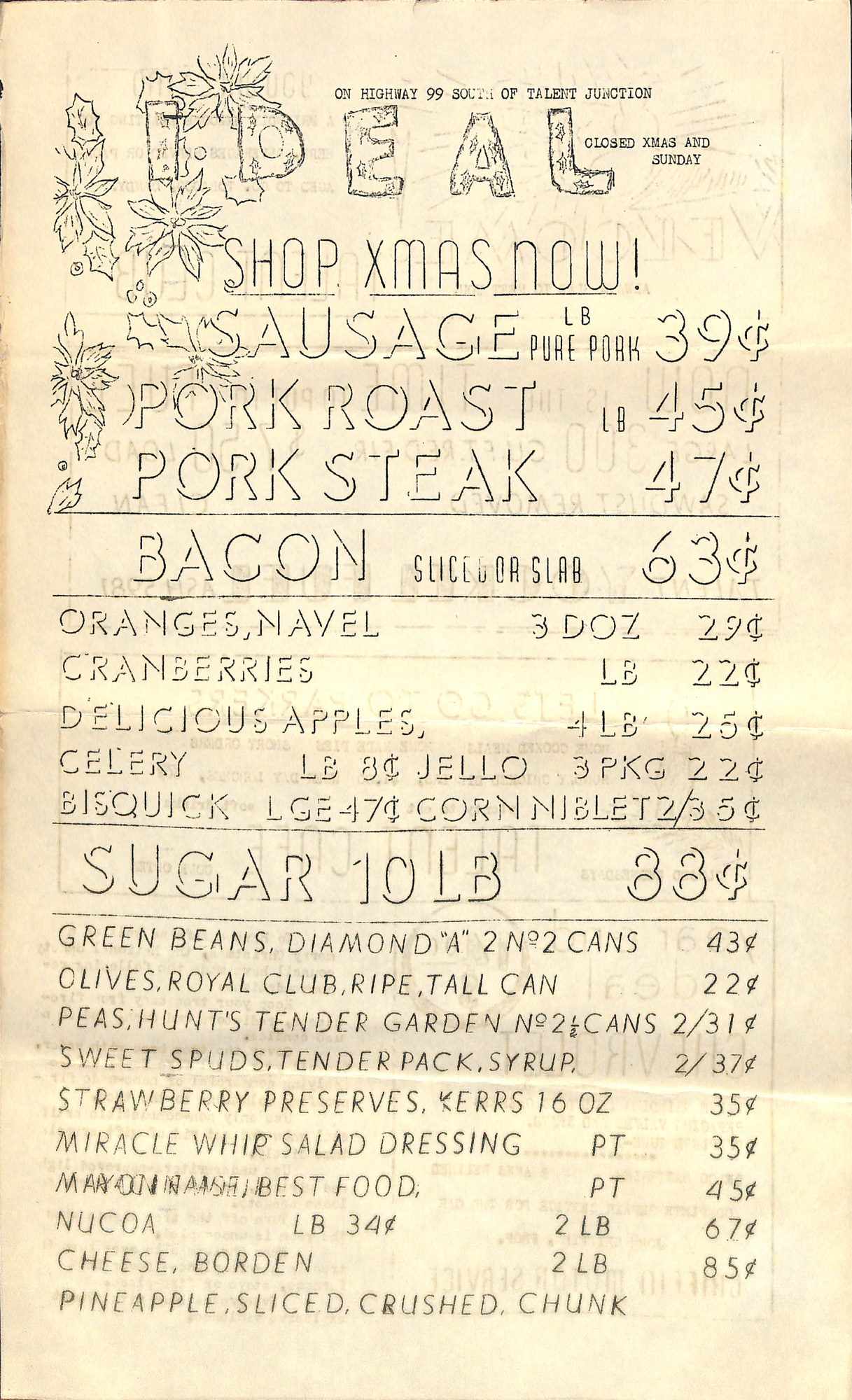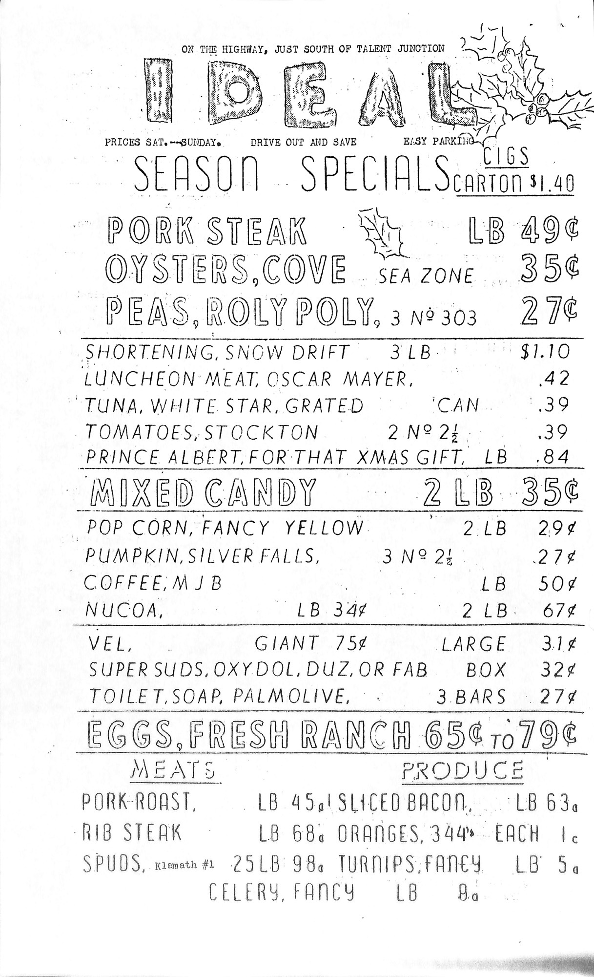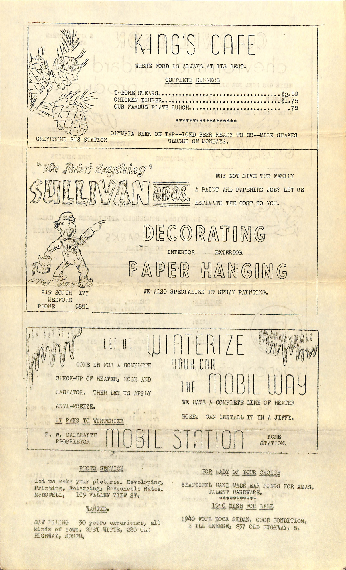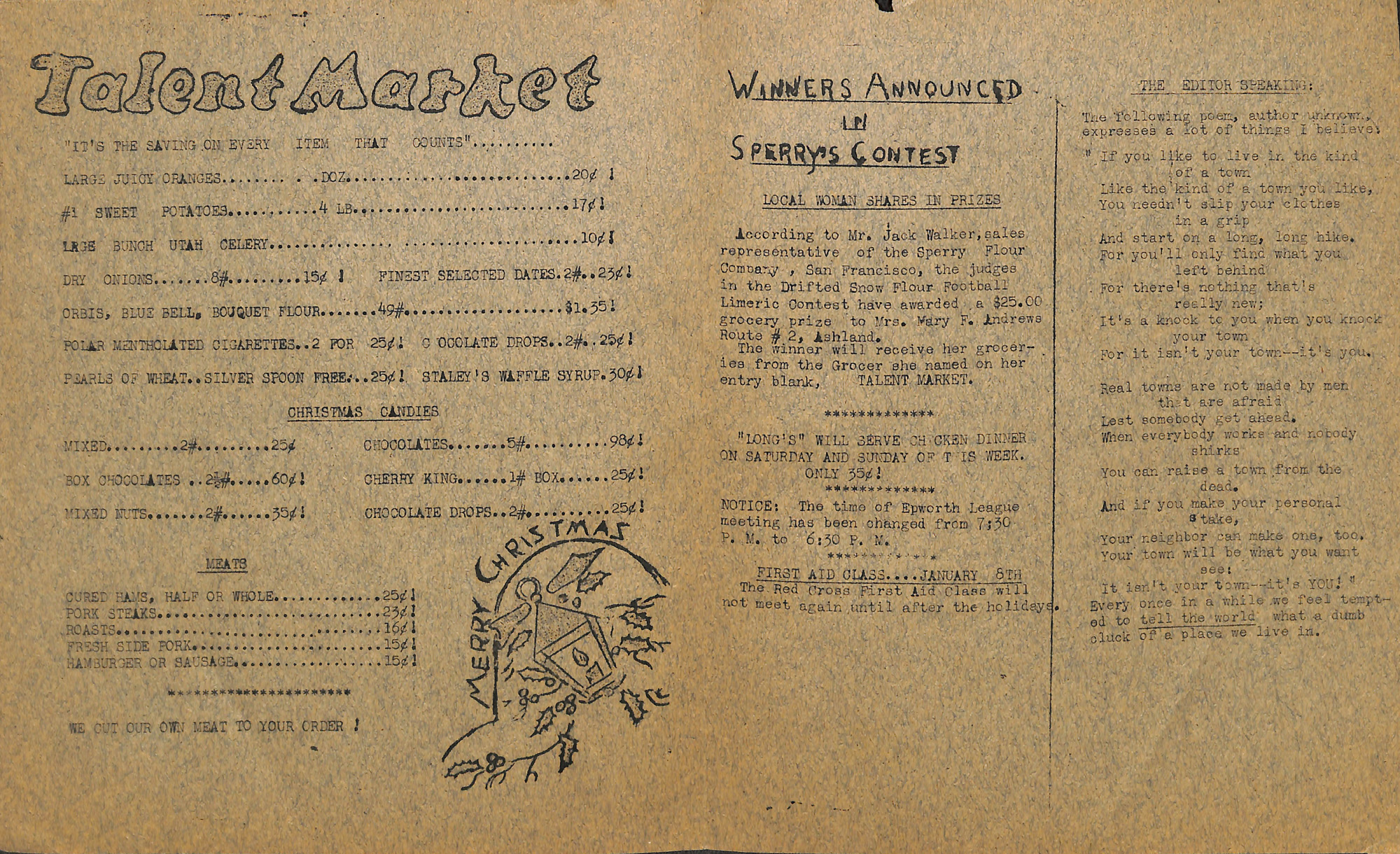 One of our reporters said she had a dream last night. She was Santa Claus. She called on prominent, public-spirited citizens to learn what they wanted for Xmas. Then she prepared the tree. On the tree were seventeen little white fire trucks, one bottle of Scotch and three cans of Johnson's Glo-Go. As most of our business houses will be closed on Saturday and Sunday it is advisable to do your shopping today. Mr. and Mrs. Beryl Settlemier and family left today for Longview, Washington, where they will spend Xmas with Mrs. Settlemier's mother. Mr. and Mrs. Lloyd Wells will spend Xmas in Klamath Falls. Lucile Young and Barbara Terrill home for Xmas. Page 12, Christmas greetings ads for: TALENT LOCKER & GROCERY ROY'S PLACE TALENT BARBER TALENT CLUB Page 13, Christmas greetings ads for: KING'S CAFÉ GILBREATH MOBIL TALENT CAFÉ TALENT HARDWARE JUNCTION POINT SHELL IN RETROS, ETC., ETC.