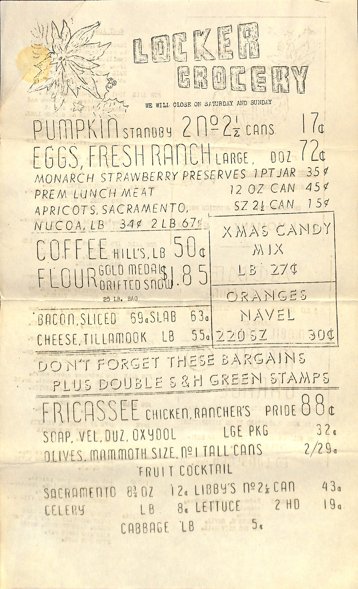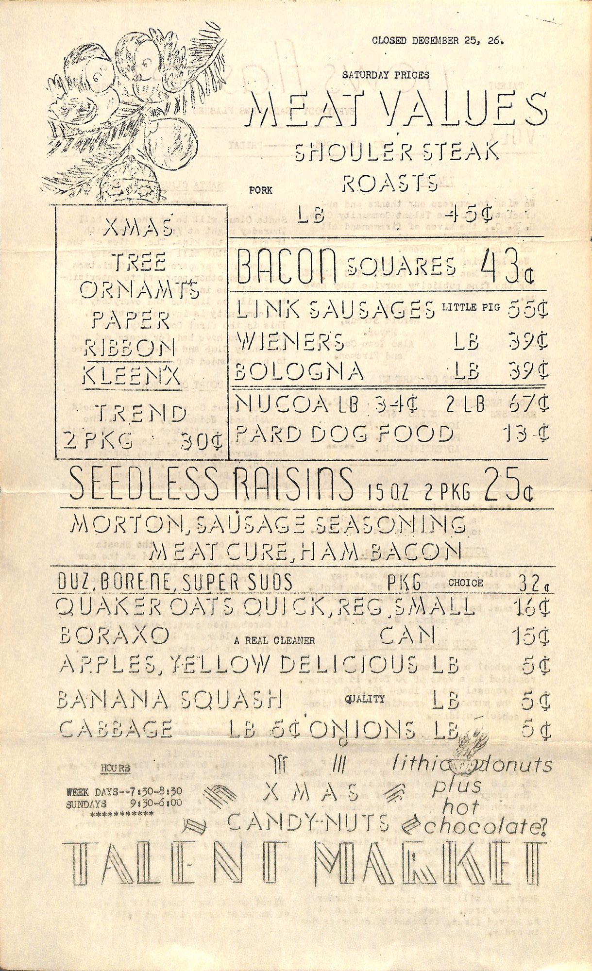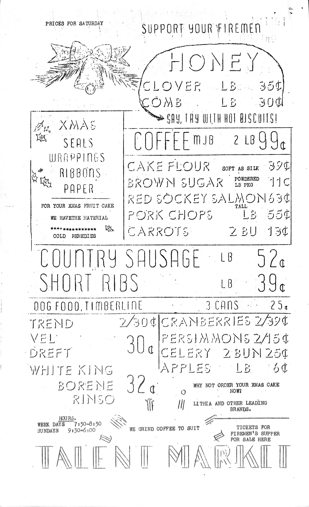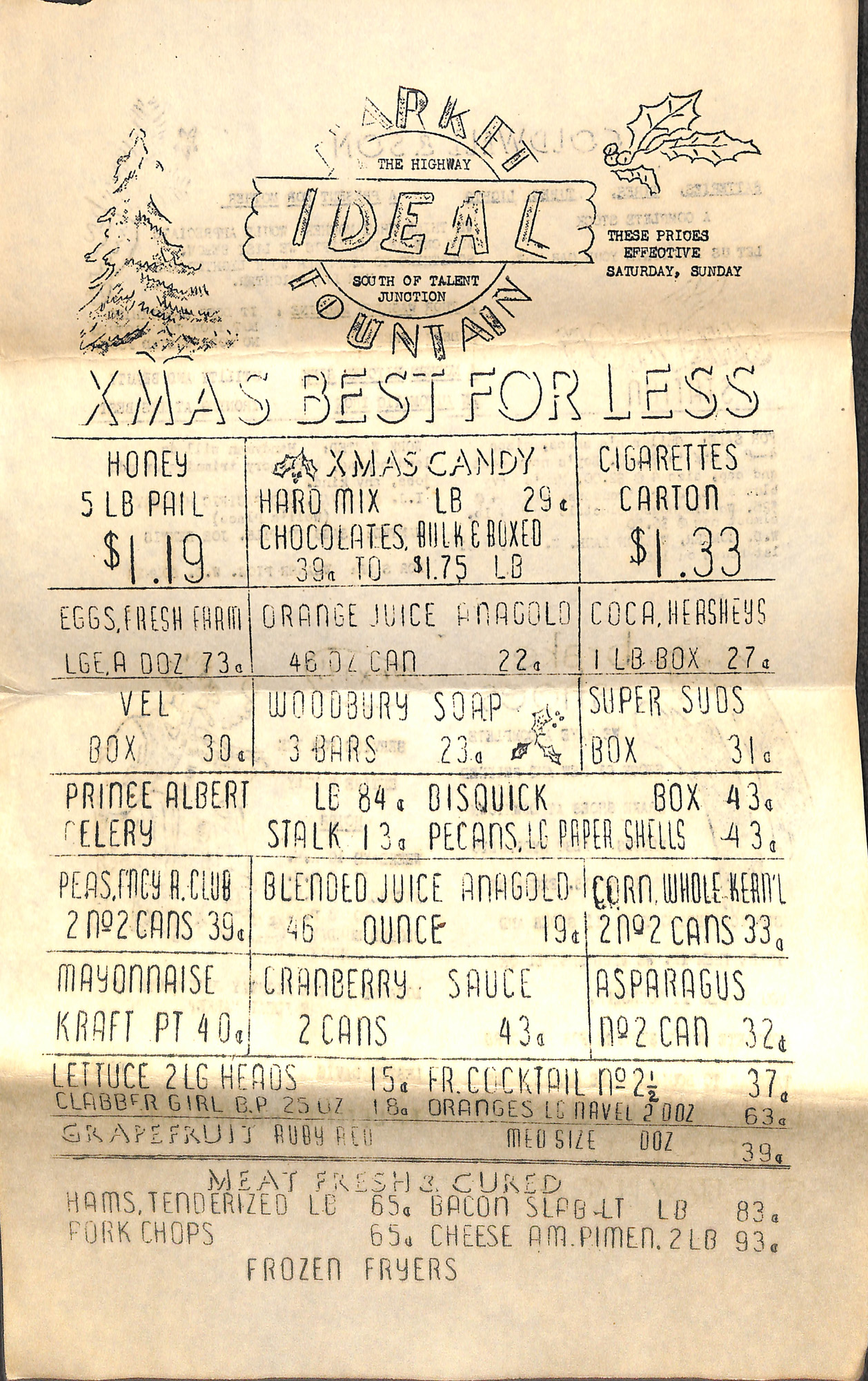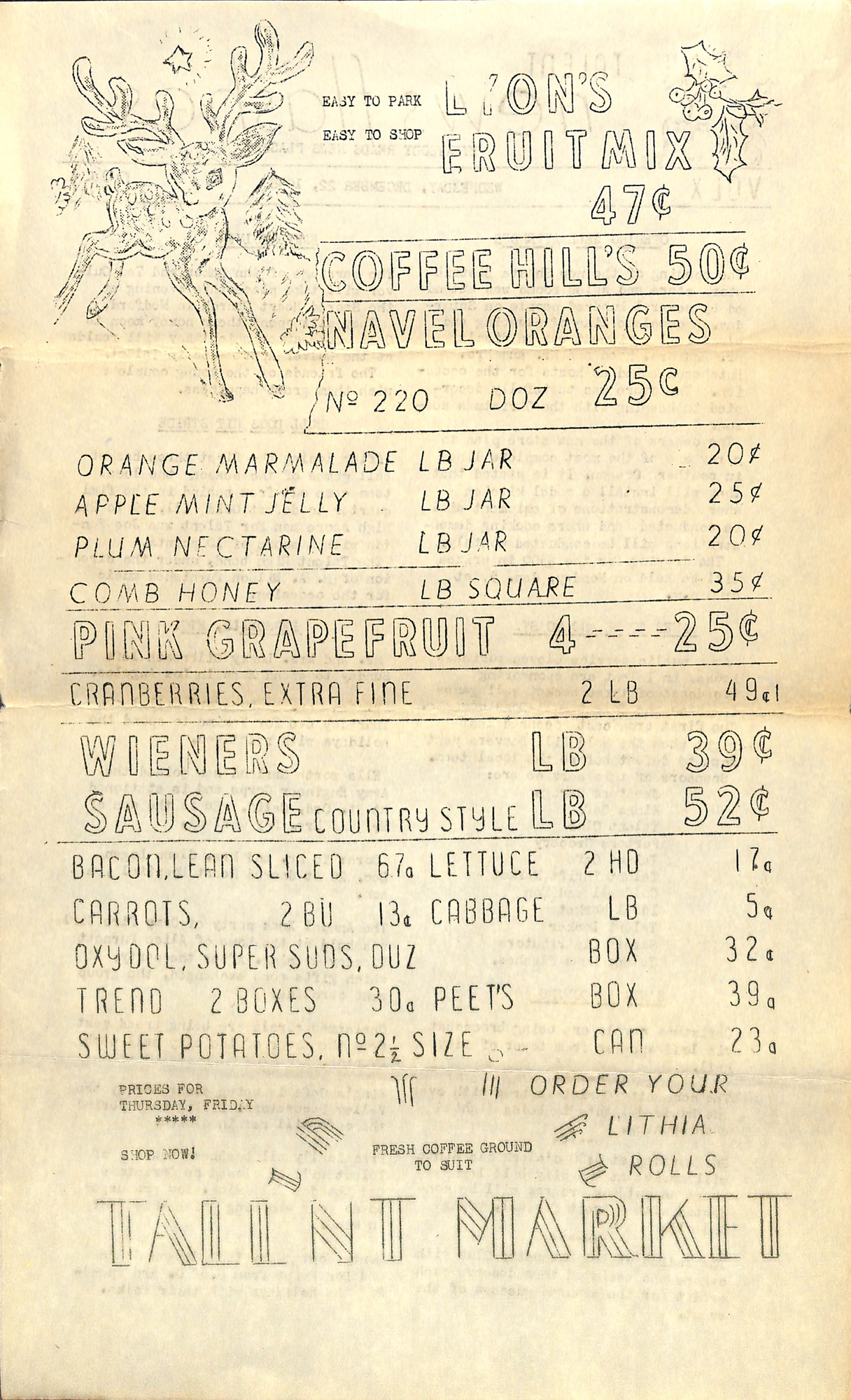 One of our reporters said she had a dream last night. She was Santa Claus. She called on prominent, public-spirited citizens to learn what they wanted for Xmas. Then she prepared the tree. On the tree were seventeen little white fire trucks, one bottle of Scotch and three cans of Johnson's Glo-Go. As most of our business houses will be closed on Saturday and Sunday it is advisable to do your shopping today. Mr. and Mrs. Beryl Settlemier and family left today for Longview, Washington, where they will spend Xmas with Mrs. Settlemier's mother. Mr. and Mrs. Lloyd Wells will spend Xmas in Klamath Falls. Lucile Young and Barbara Terrill home for Xmas. Page 12, Christmas greetings ads for: TALENT LOCKER & GROCERY ROY'S PLACE TALENT BARBER TALENT CLUB Page 13, Christmas greetings ads for: KING'S CAFÉ GILBREATH MOBIL TALENT CAFÉ TALENT HARDWARE JUNCTION POINT SHELL IN RETROS, ETC., ETC.