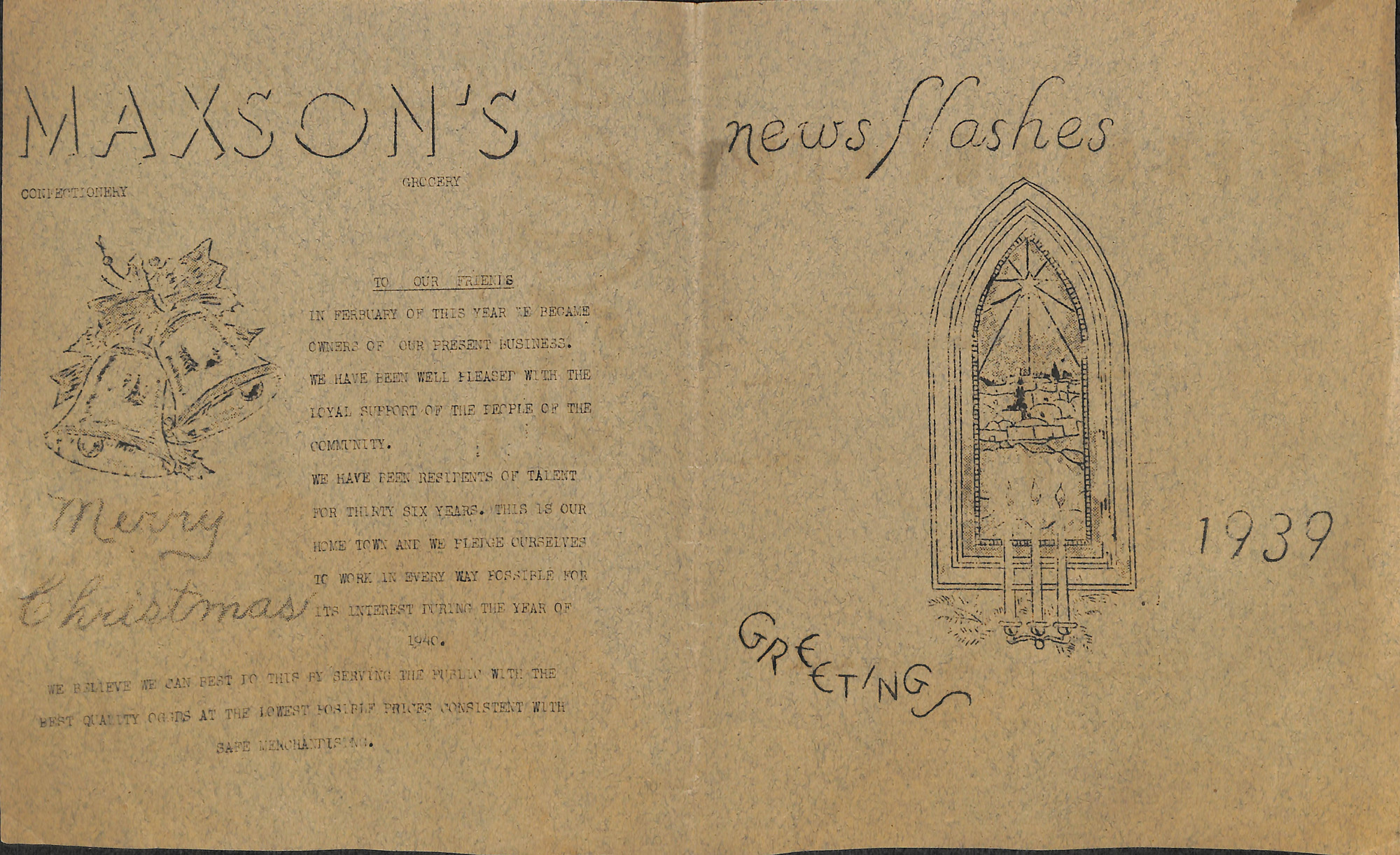 It was back in the dying days of 1934. Ray Schumacher owned the Thrift Market and had established News Flashes as his advertising medium. The present editor was employed to edit, print and distribute the paper. We were glad to do this since those were depression days and, boy, we needed the money. Schumacher decided at the last moment that he needed a XMAS EDITION and it was up to us to print it. It was the 23 of December. We spent the day cutting the two stencils that made up the paper. In the evening Ray Burnette dropped in to spend the evening. HE DID! When we brought out the mimeograph he volunteered to assist. The mimeograph was an old machine. It had a top speed of about sixty impressions an hour--when we were lucky! That night we were not lucky. We had more trouble than we have ever had, before or since. It was 2:30 A.M. before we said "30" and put 110 copies of News Flashes to bed. Ray stuck it out and wouldn't go home until the last sheet was printed. He was as proud as the editor when the job was done. And that, our friends, is the story of the origin of the Christmas Edition of News Flashes. And each year (except during war years) News Flashes has printed the special holiday edition for the purpose of drawing the merchants and the public together in a closer bond of understanding and sympathy. Christmas issue, 1949 The 1934 Christmas issue is lost. ----------------------------------------------------------------------------- Ray's News Flashes VOLUME II NO. 1 THURSDAY, JAN. 3, 1935 CITY COUNCIL MEETS The city council met at the city hall on Wednesday evening of this week. Routine business was transacted. It was announced that, with the payment of the last installment on the city well warrant, the town was completely out of debt with a cash balance on hand of more than $600. The city recorder reported that approximately $150 back water rent was on the books. About two thirds of this is in good accounts which will soon be cleared up. The newly elected city council and officers were then sworn in by the recorder. Mayor Wm. Hart, City record. Edith Cochran, Treas. Ed. Anderson, Councilmen Earl Withrow, Harry Lowe, Harry Hamilton, Clarence Homes, Claude Jones. Joe Spitzer was absent. TALENT, COMING, GOING. Mrs. Ira Williams is spending her Christmas vacation visiting her sister in Sacramento. Mrs. F. C. Young, who was recently seriously injured by an auto truck, is improving. Mrs. Glenn White, who has been spending the holidays in Portland, will return tomorrow. J. R. G. Haynes of Ashland was a Talent visitor on Wednesday. Mrs. Rosetta Wilson, who has been visiting her father, G. W. Burnette, has returned to her home in Ashland. START THE NEW YEAR RIGHT. TRADE
