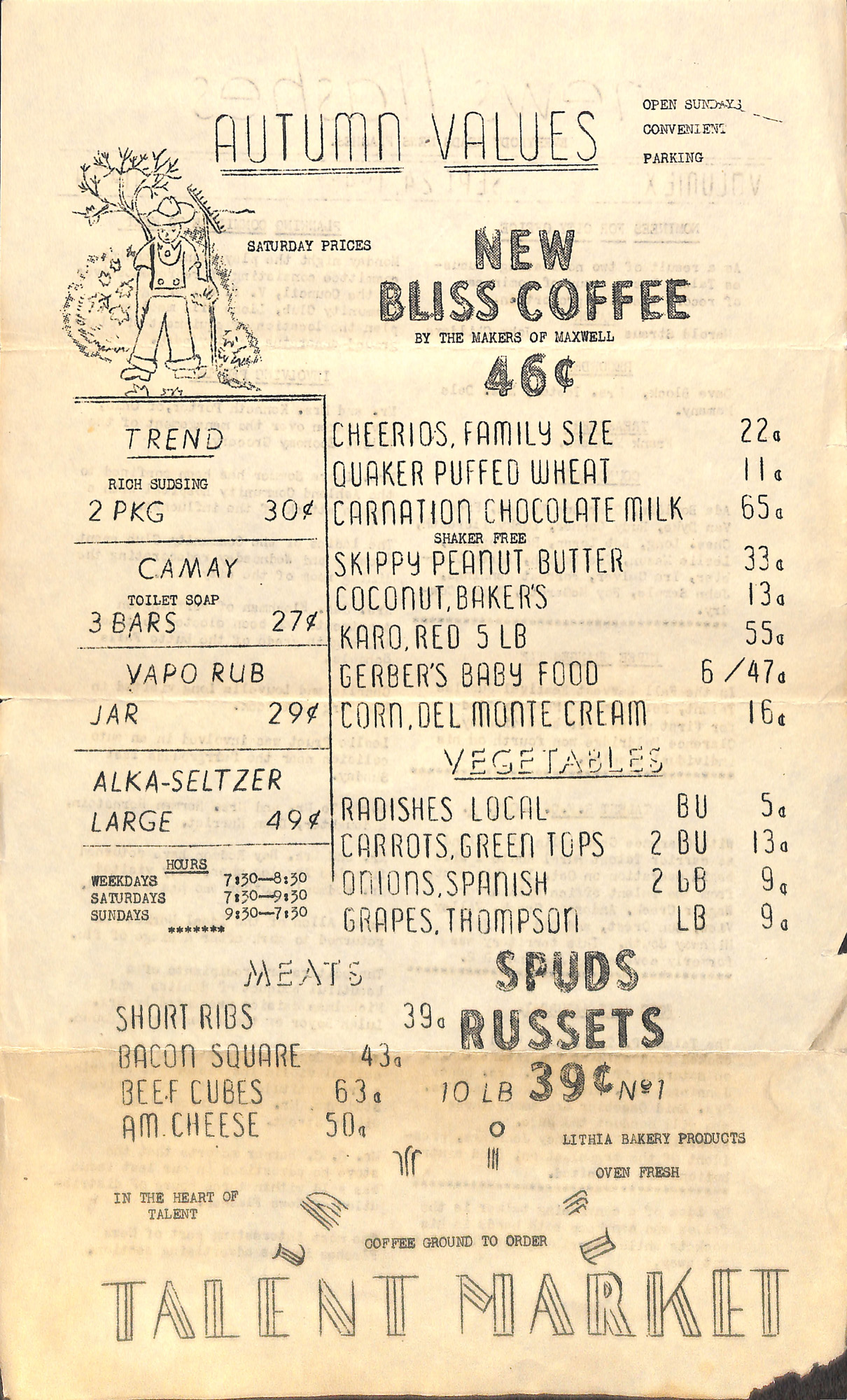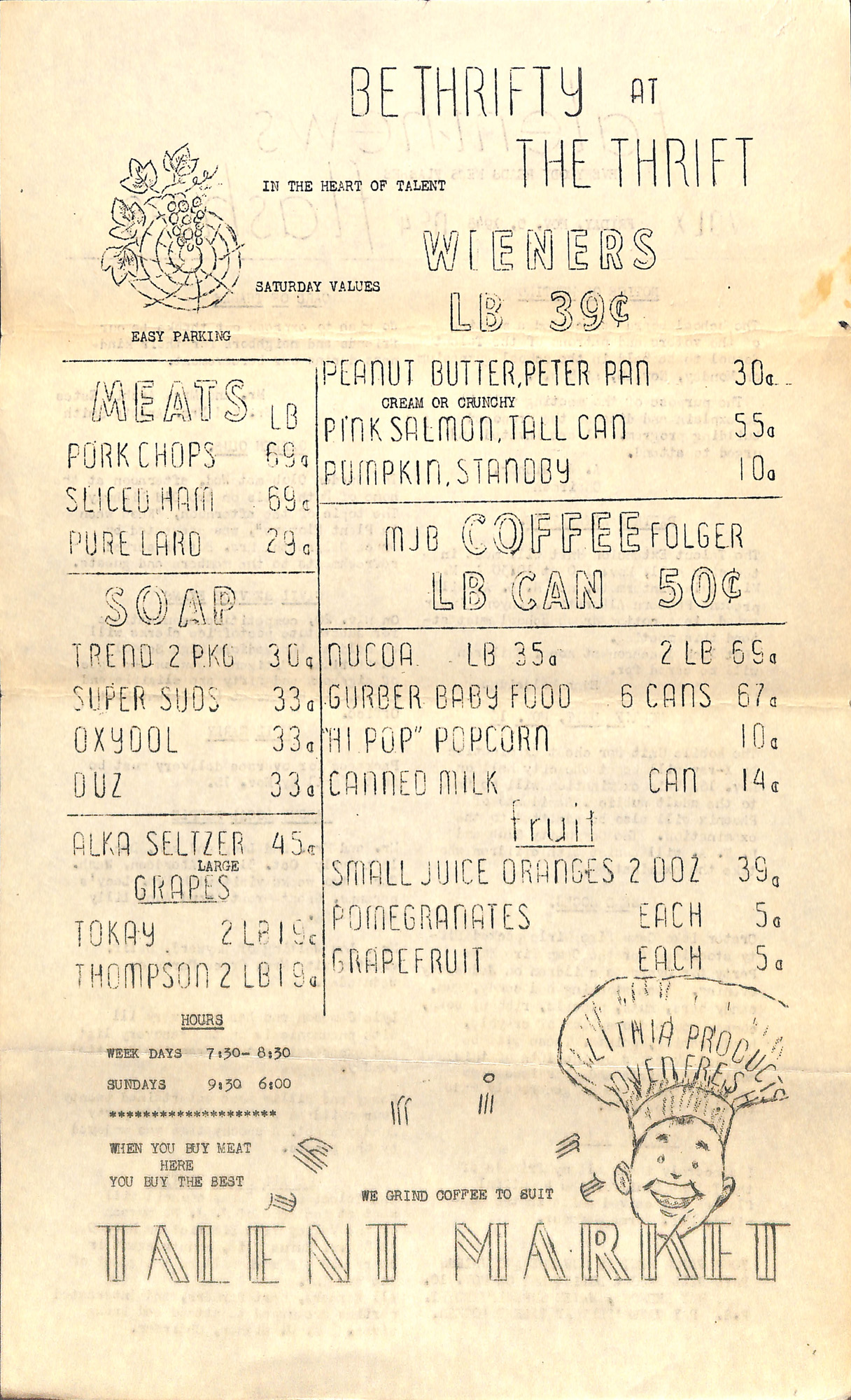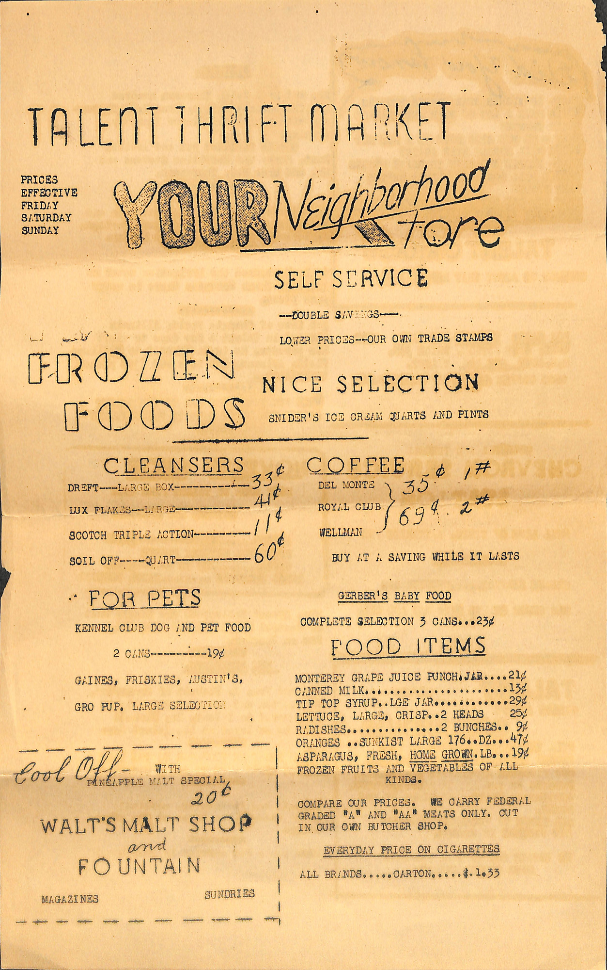CANNING KITCHENS BUSY The canning kitchens operating under the directions of the SERA and located in various parts of the county report that over 25,000 cans of food have been canned to date. The food canned consists of vegetables and several varieties of meat. The tomatoes are just coming on in volume, and this will be one of the major features of the canning kitchens and will increase the amount of food already canned greatly. PROTEST CONSIDERED The protest of the residents of Valley View against routing the mail out of Talent instead of Ashland is being considered by the P.O. Department. In the meantime, the change, which was to have been made Sept. 1, is being held in abeyance. RAY OPENS PHOENIX STORE Under the name of Ray's MARKET, Ray Schumacher will open a modern, well-equipped grocery and meat market in Phoenix on Saturday of this week. This store will feature the same service and the same quality merchandise and low prices and will be under the management of Mr. Wendell Tolle. PRICES FROM OUR FILES OF SEPT. '34 BOUQUET FLOUR…49 lbs. $1.58….Soap Chips…large size 19¢…Golden West Coffee…1 lb. tin…29¢…1 lb. jar, 30¢…2 lb. jar…57¢…Beef steak…15¢…Veal stew…5¢ lb…Beef roast, 9¢…Pineapple #2½ can, 19¢… Talent News Flashes September 6, 1934, now lost. Reprinted in the September 2, 1960 News Flashes -----------------------------------------------------------------------------