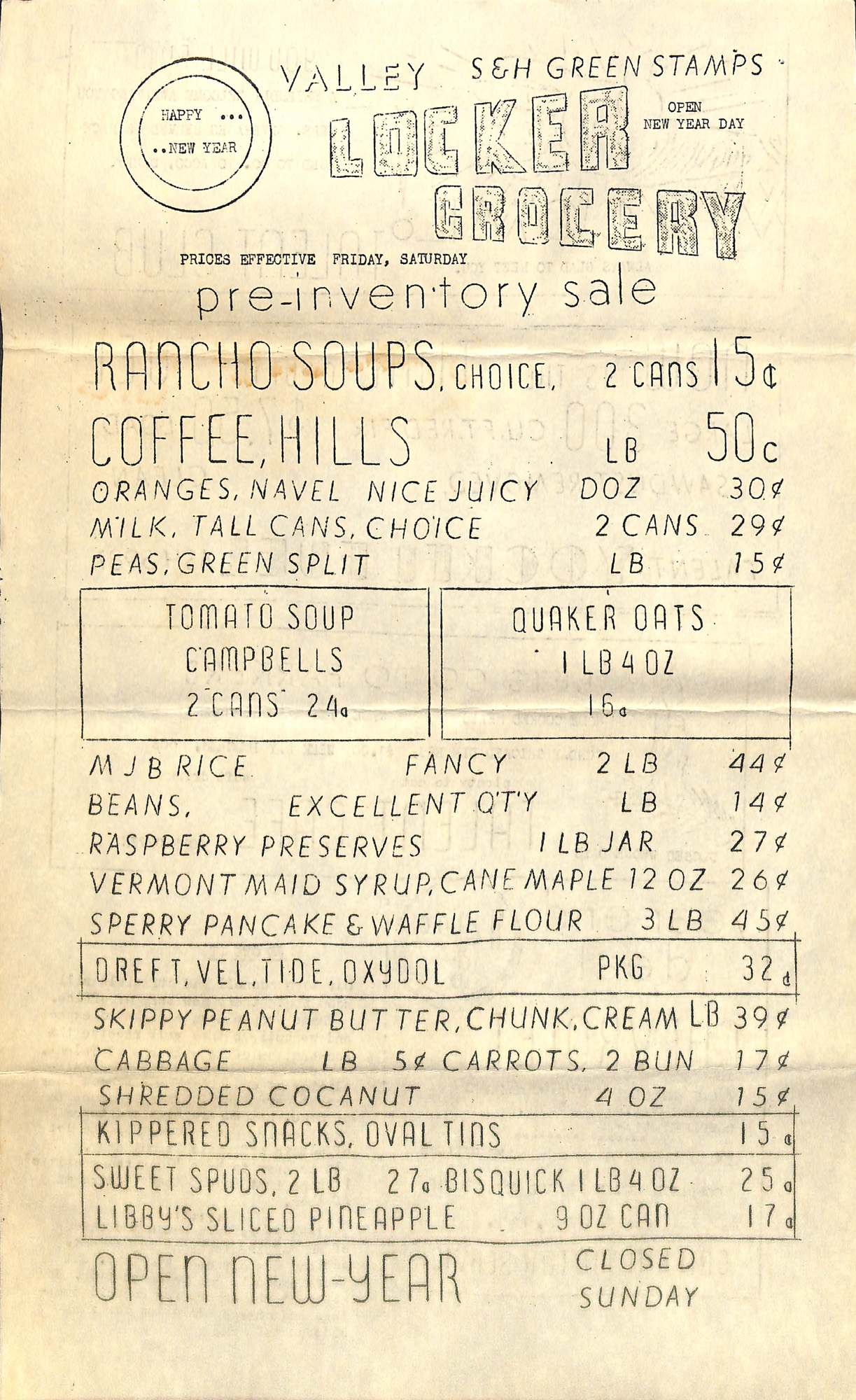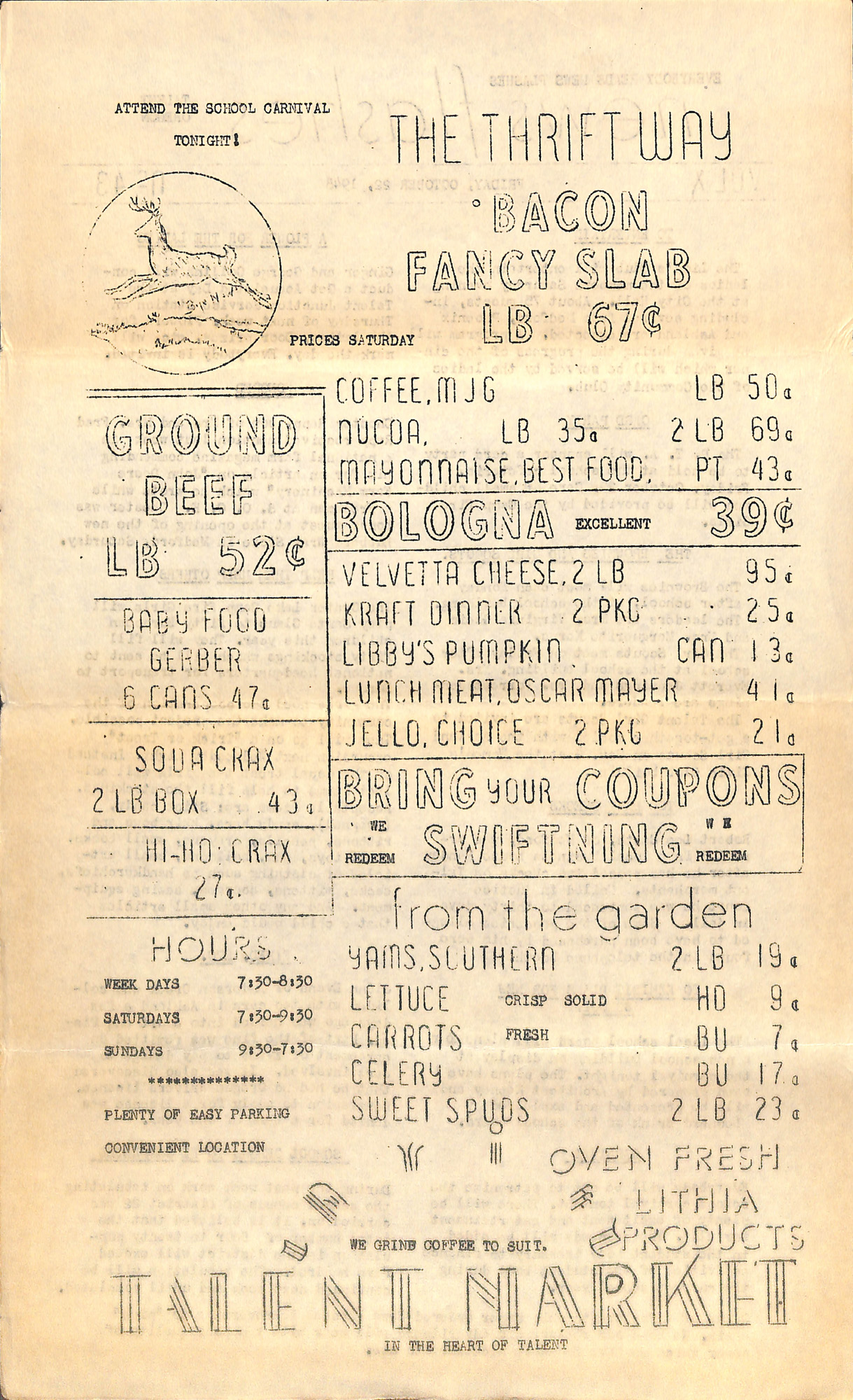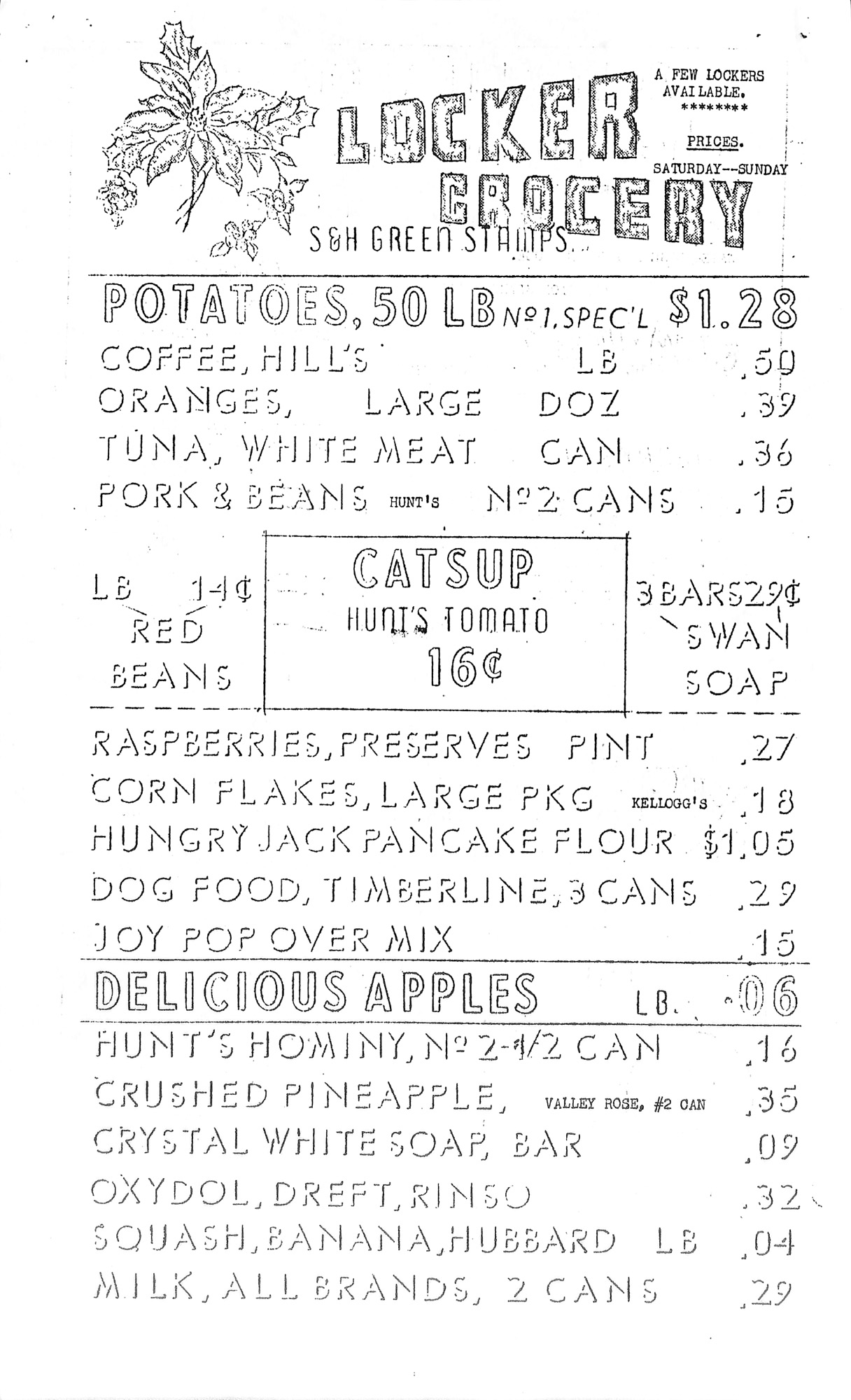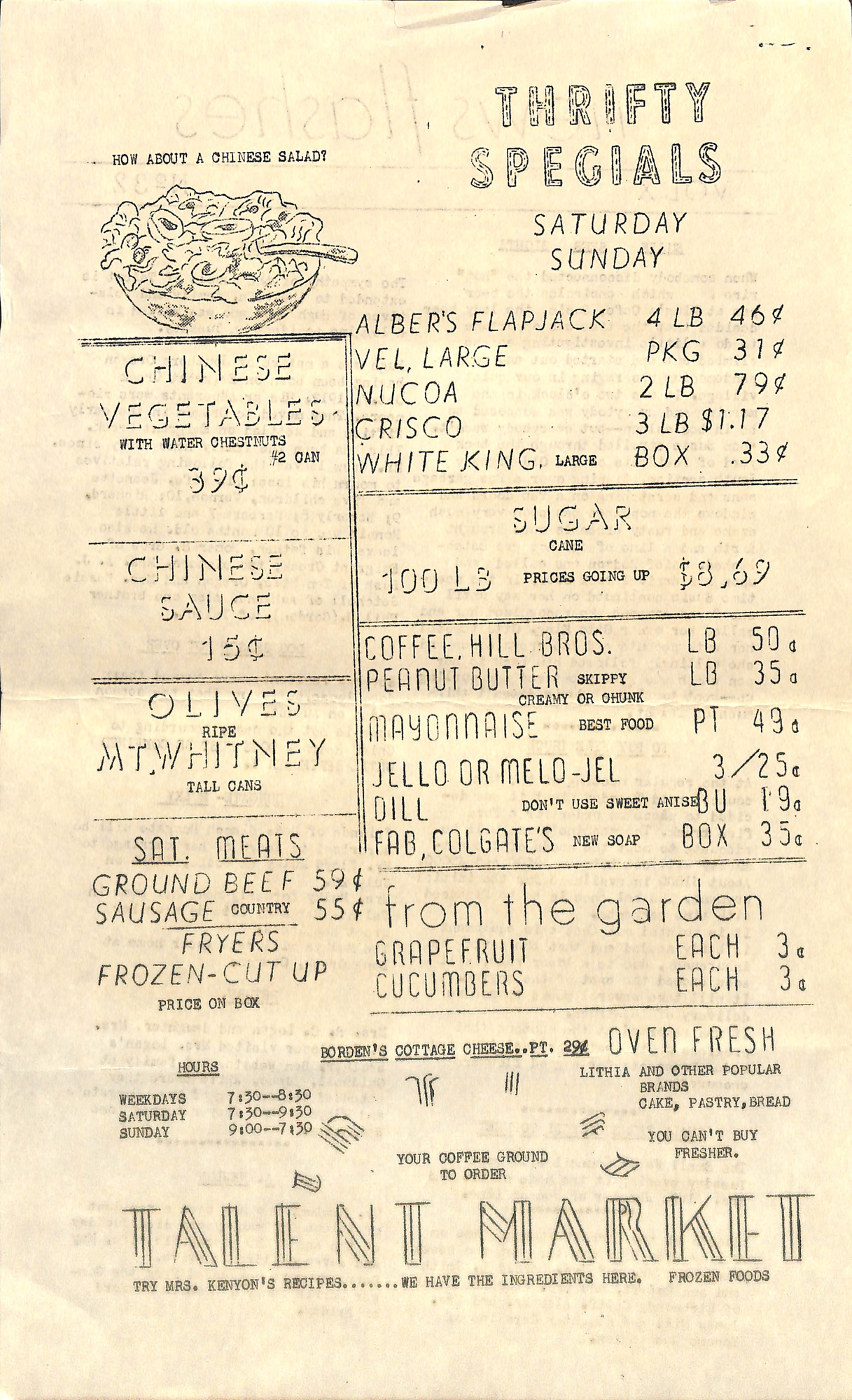 CANNING KITCHENS BUSY The canning kitchens operating under the directions of the SERA and located in various parts of the county report that over 25,000 cans of food have been canned to date. The food canned consists of vegetables and several varieties of meat. The tomatoes are just coming on in volume, and this will be one of the major features of the canning kitchens and will increase the amount of food already canned greatly. PROTEST CONSIDERED The protest of the residents of Valley View against routing the mail out of Talent instead of Ashland is being considered by the P.O. Department. In the meantime, the change, which was to have been made Sept. 1, is being held in abeyance. RAY OPENS PHOENIX STORE Under the name of Ray's MARKET, Ray Schumacher will open a modern, well-equipped grocery and meat market in Phoenix on Saturday of this week. This store will feature the same service and the same quality merchandise and low prices and will be under the management of Mr. Wendell Tolle. PRICES FROM OUR FILES OF SEPT. '34 BOUQUET FLOUR…49 lbs. $1.58….Soap Chips…large size 19¢…Golden West Coffee…1 lb. tin…29¢…1 lb. jar, 30¢…2 lb. jar…57¢…Beef steak…15¢…Veal stew…5¢ lb…Beef roast, 9¢…Pineapple #2½ can, 19¢… Talent News Flashes September 6, 1934, now lost. Reprinted in the September 2, 1960 News Flashes -----------------------------------------------------------------------------