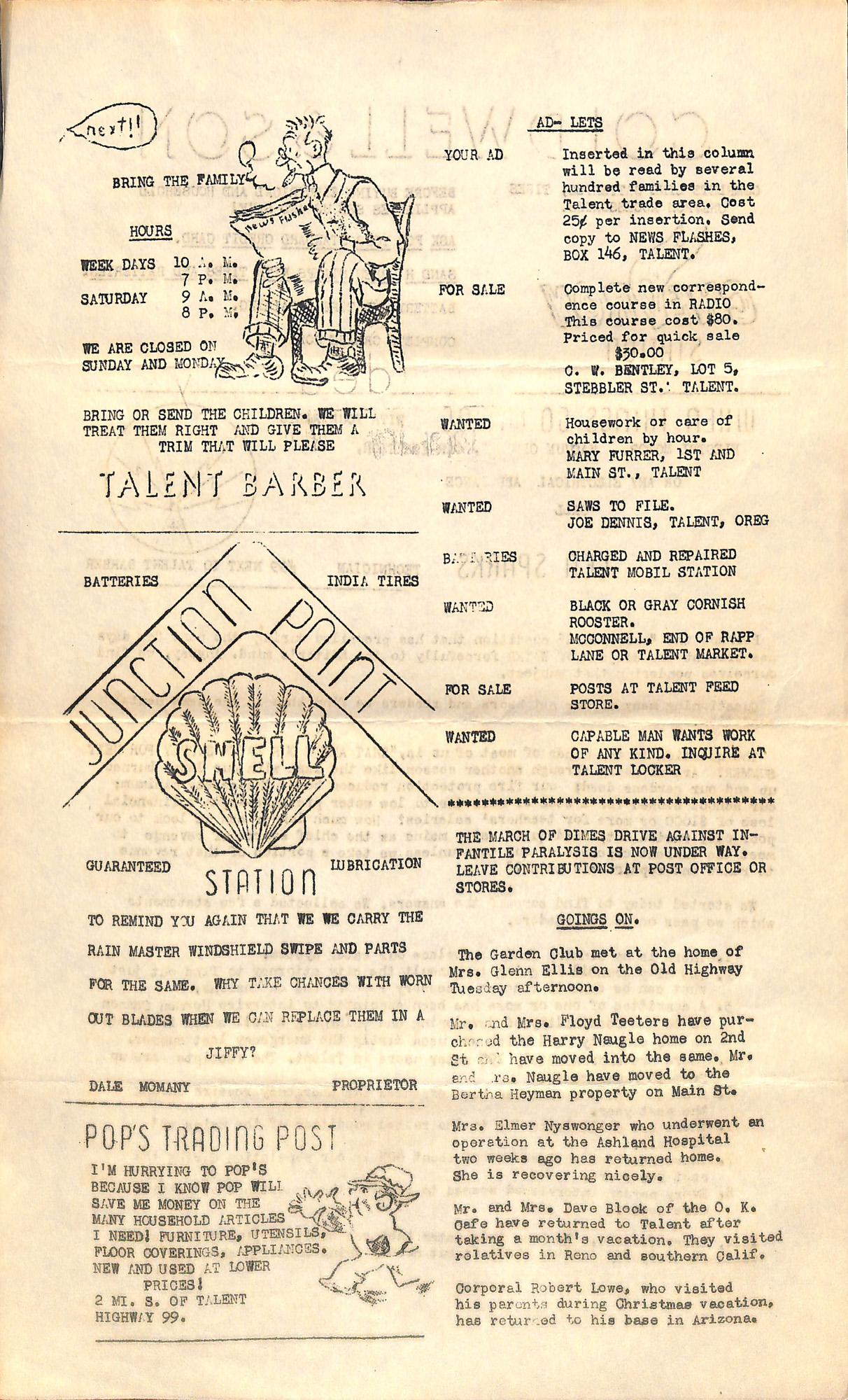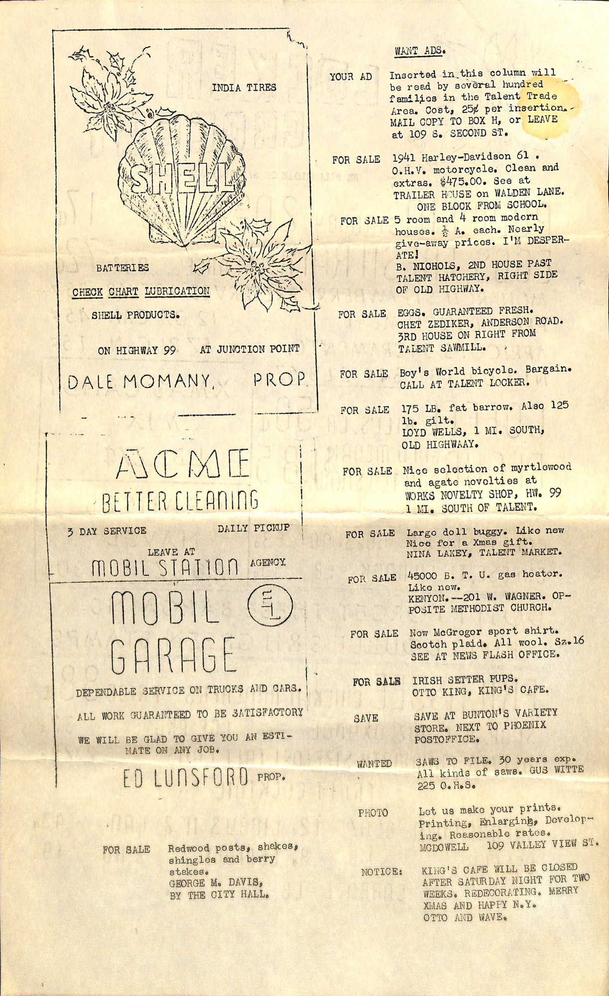 Alice May Woolley, Pastor Dec. 26 9:45--Sunday School 10:30--Christmas Program by Sunday and message by the pastor. 7:30--Evening Service Wednesday 7:30--Prayer Meeting. No Bible Clubs during school vacation. The next basketball game by Talent Hi will be played on Jan. 8. To have a safe as well as a merry Christmas, the National Safety Council have made the following recommendations: Keep your tree away from fireplaces, radiators and such, and do not use candles. Cover the tree base with water. Consult your local Fire Dept. before applying commercial or homemade fire-proofing solutions to the tree. Use only non-combustible artificial snow and get rid of gift wrapping immediately. Use underwriters-approved light and wirings, and check for defects or loose sockets. Turn off the tree lights when the room is unoccupied. When Christmas is over burn the tree in a safe place--Never in a furnace, stove or fireplace. Evergreens burn with almost explosive violence. Page 4, full-page ad for: IDEAL MARKET Page 5, full-page ad for: TALENT LOCKER GROCERY Page 6, ads for: SHELL STATION AT JUNCTION POINT, MOMANY, PROP. ACME CLEANING LUNSFORD MOBIL GARAGE FOR SALE--Redwood posts, shakes, shingles and berry stakes. GEORGE M. DAVIS, BY THE CITY HALL WANT ADS YOUR AD--Inserted in this column will be read by several hundred families in the Talent trade area. Cost, 25¢ per insertion. MAIL COPY TO BOX H, or LEAVE at 109 S. SECOND ST. FOR SALE--1941 Harley-Davidson 61, O.H.V. motorcycle. Clean and extras. $475.00. See at TRAILER HOUSE on WALDEN LANE. ONE BLOCK FROM SCHOOL. FOR SALE--5 room and 4 room modern houses. ½ A. each. Nearly give-away prices. I'M DESPERATE! B. NICHOLS, 2ND HOUSE PAST TALENT HATCHERY, RIGHT SIDE OF OLD HIGHWAY. FOR SALE--EGGS. GUARANTEED FRESH. CHET ZEDIKER, ANDERSON ROAD. 3RD HOUSE ON RIGHT FROM TALENT SAWMILL. FOR SALE--Boy's World bicycle. Bargain. CALL AT TALENT LOCKER. FOR SALE--175 LB. fat barrow. Also 125 lb. gilt. LLOYD WELLS, 1 MI. SOUTH, OLD HIGHWAY. FOR SALE--Nice selection of myrtlewood and agate novelties at WORKS NOVELTY SHOP, HWY. 99 1 MI. SOUTH OF TALENT. FOR SALE--Large doll buggy. Like new. Nice for a Xmas gift. NINA LAKEY, TALENT MARKET. FOR SALE--45000 B.T.U. gas heater. Like new. KENYON--201 W. WAGNER. OPPOSITE METHODIST CHURCH. FOR SALE--New McGregor sport shirt. Scotch plaid. All wool. Sz. 16. SEE AT NEWS FLASHES OFFICE. FOR SALE--IRISH SETTER PUPS. OTTO KING, KING'S CAFÉ. SAVE--SAVE AT BUNTON'S VARIETY STORE. NEXT TO PHOENIX POST OFFICE. WANTED--SAWS TO FILE. 30 years exp. All kinds of saws. GUS WHITE 225 O.H.S. PHOTO--Let us make your prints. Printing, Enlarging, Developing. Reasonable rates. McDOWELL. 109 VALLEY VIEW ST. NOTICE: KING'S CAFÉ WILL BE CLOSED AFTER SATURDAY NIGHT FOR TWO WEEKS. REDECORATING. MERRY XMAS AND HAPPY N.Y. OTTO AND WAVE. THEY HAVE WENT Mr. and Mrs. Leo Bohls and Karen and Jimmy left Wednesday morn. For South Gate, California to spend Christmas with relatives. They were accompanied by Mrs. Bohls' parents, Mr. and Mrs. Heffernan of South Dak., who have been guests at the Bohls home for the past week. Mr. and Mrs. Gene Linville and Jeanette and Jill will spend the Christmas holidays with relatives in Bend, Oregon. Page 8, full-page ad for: SHASTA DISTRIBUTORS, INC. Page 9, ads for: IDEAL MARKET TALENT VARIETY SHOP LUNSFORD MOBIL GARAGE BOYER GREEN HOUSE YOCKEL'S FUEL