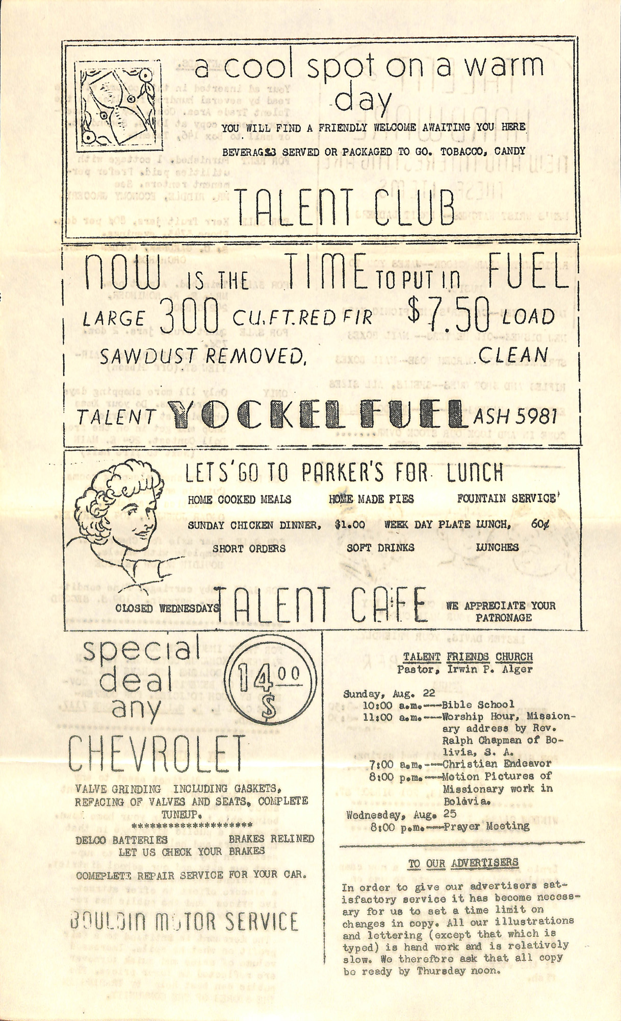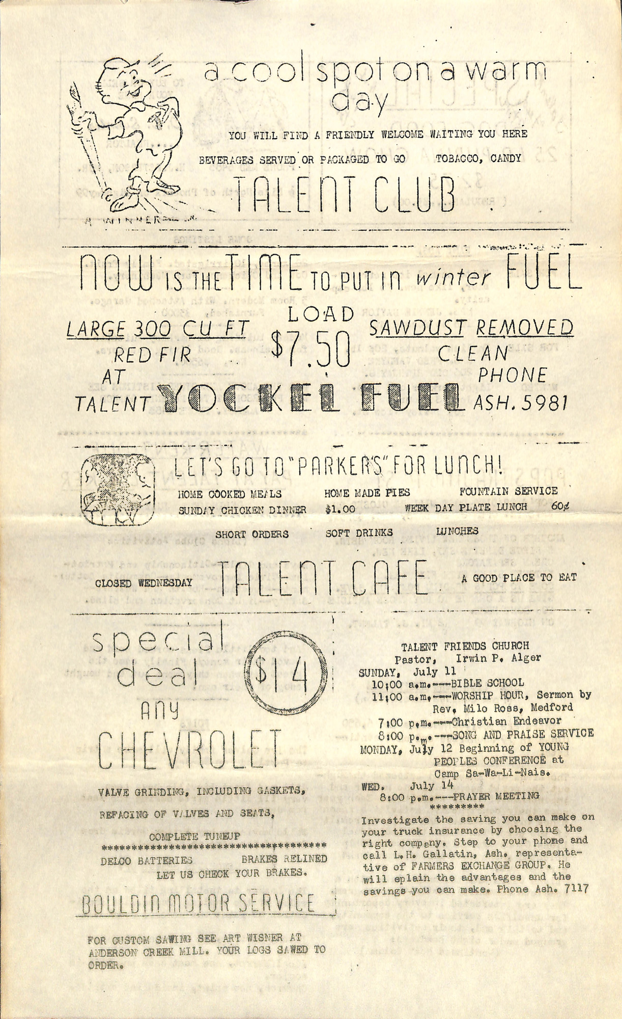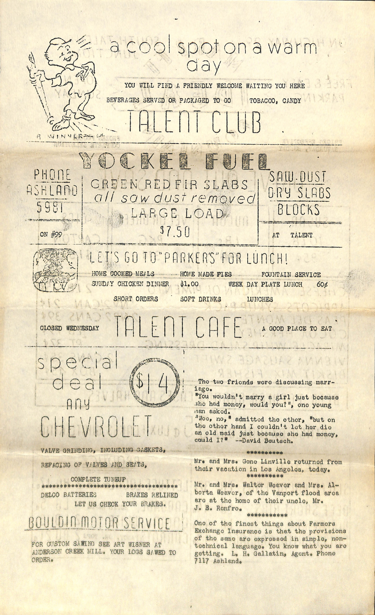 Aluminum sale, many useful items…your choice…10¢ Gas range--$11.00 Clothes wringer, crutches, turpentine, linseed oil, hay forks, shovels TALENT SERVICE STATION Where your credit is good for tires and accessories. Ask about it. Courteous, efficient service at all times. We are here to serve you. A TRUE STORY IN VERSE. I put a nickel in a pinball game, And got three nickels out. I put three dollars in the gosh-durned thing, And got a nickel out! T.E.W.