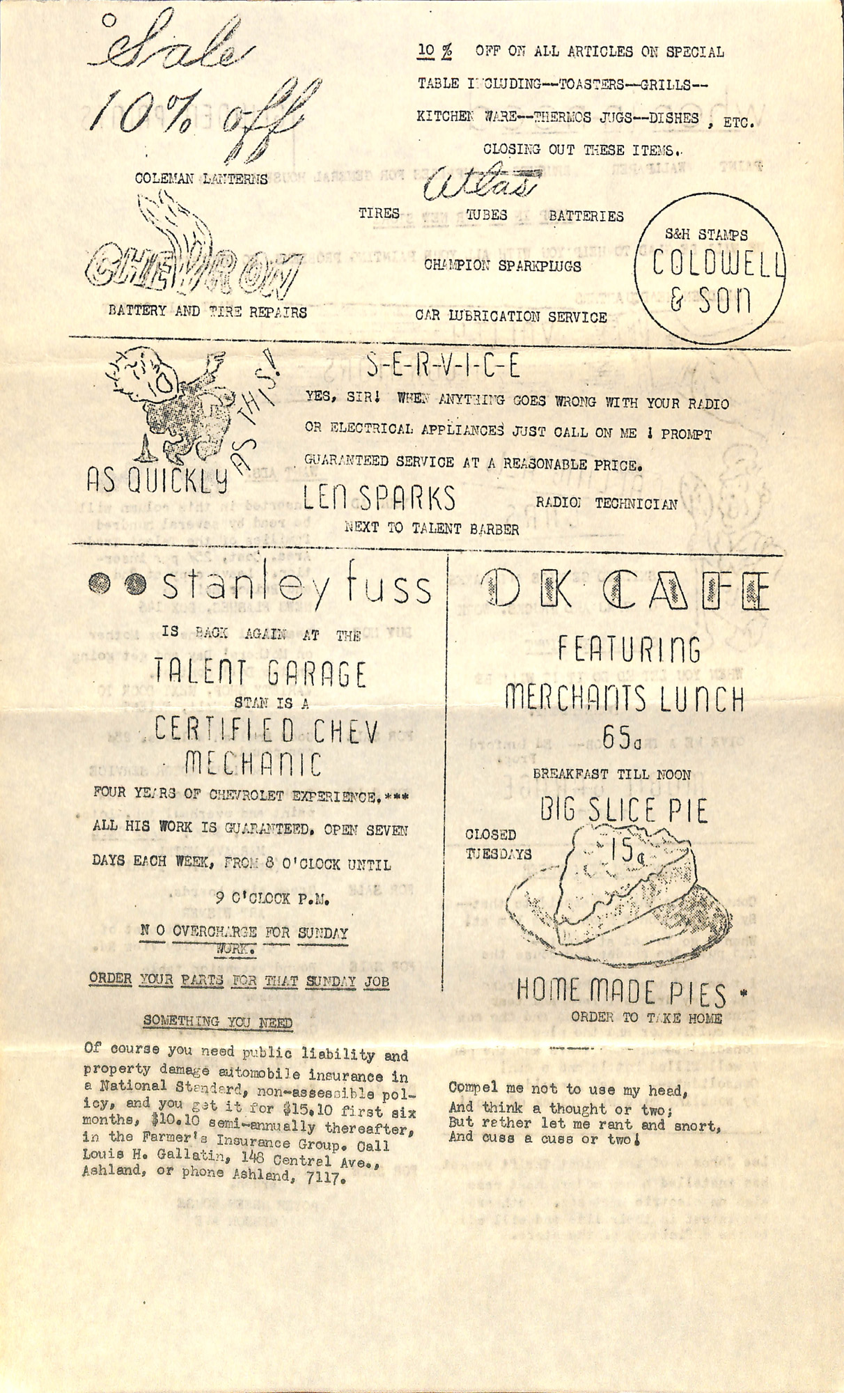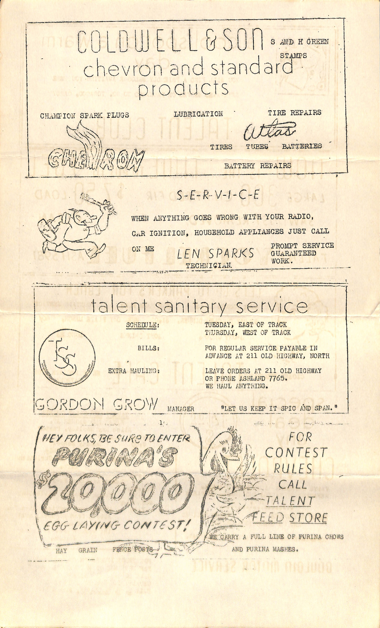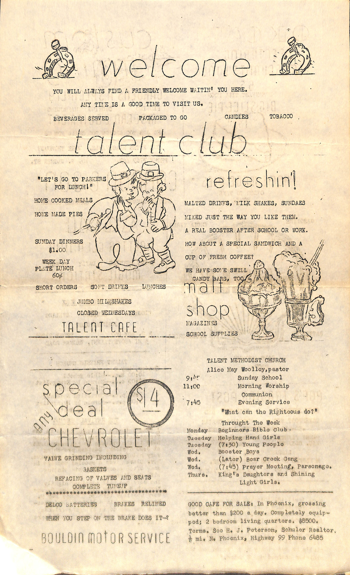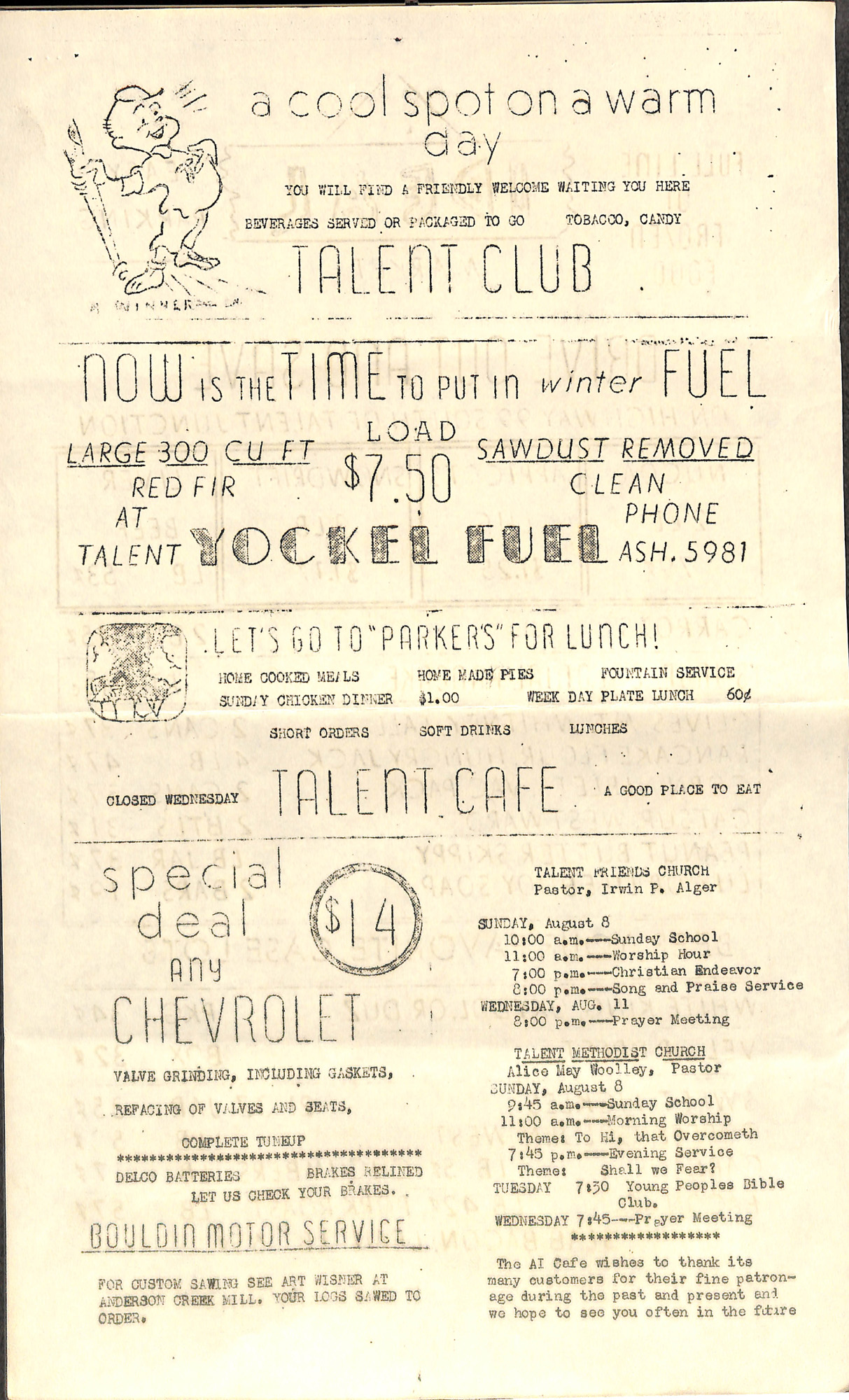 Aluminum sale, many useful items…your choice…10¢ Gas range--$11.00 Clothes wringer, crutches, turpentine, linseed oil, hay forks, shovels TALENT SERVICE STATION Where your credit is good for tires and accessories. Ask about it. Courteous, efficient service at all times. We are here to serve you. A TRUE STORY IN VERSE. I put a nickel in a pinball game, And got three nickels out. I put three dollars in the gosh-durned thing, And got a nickel out! T.E.W.