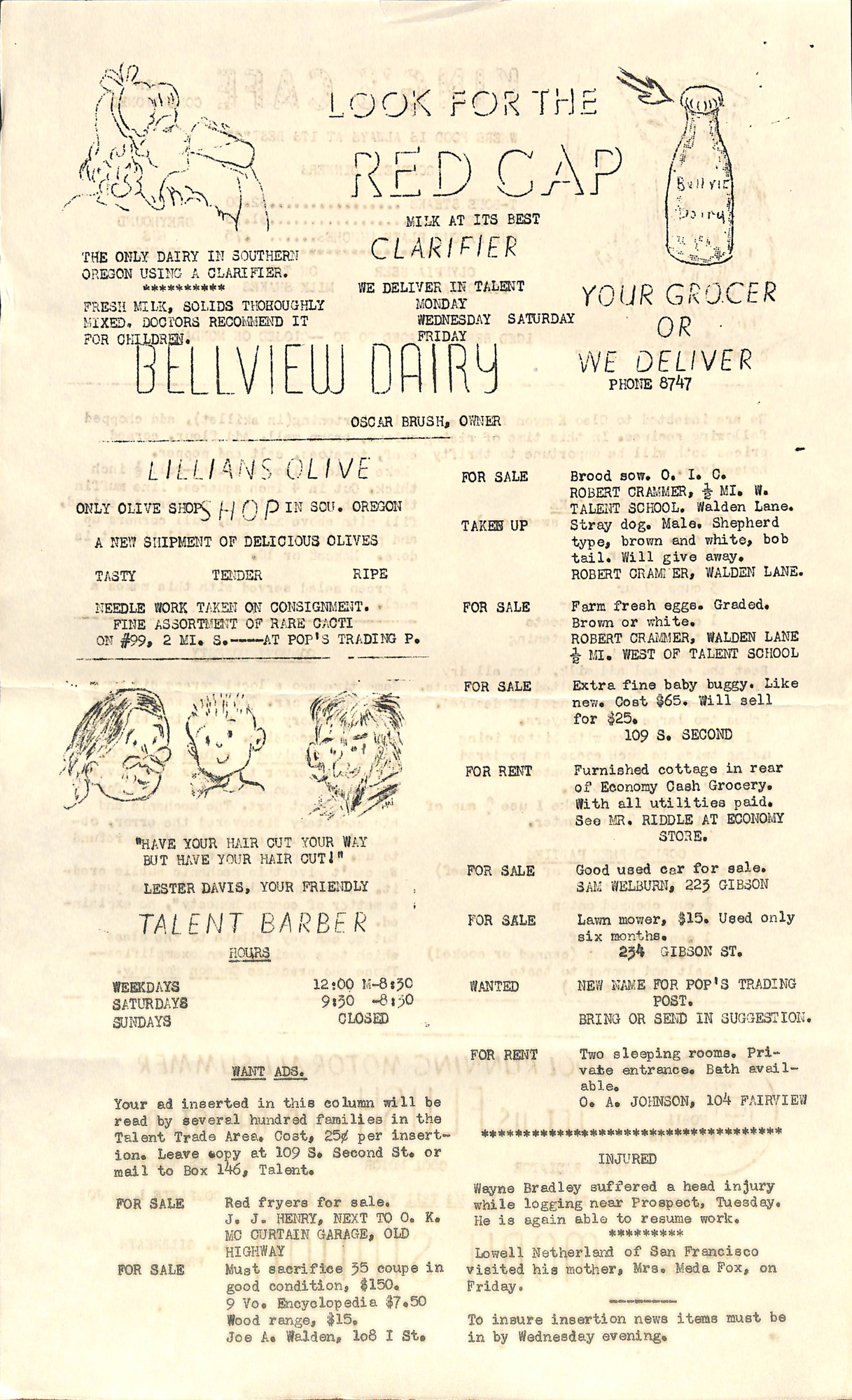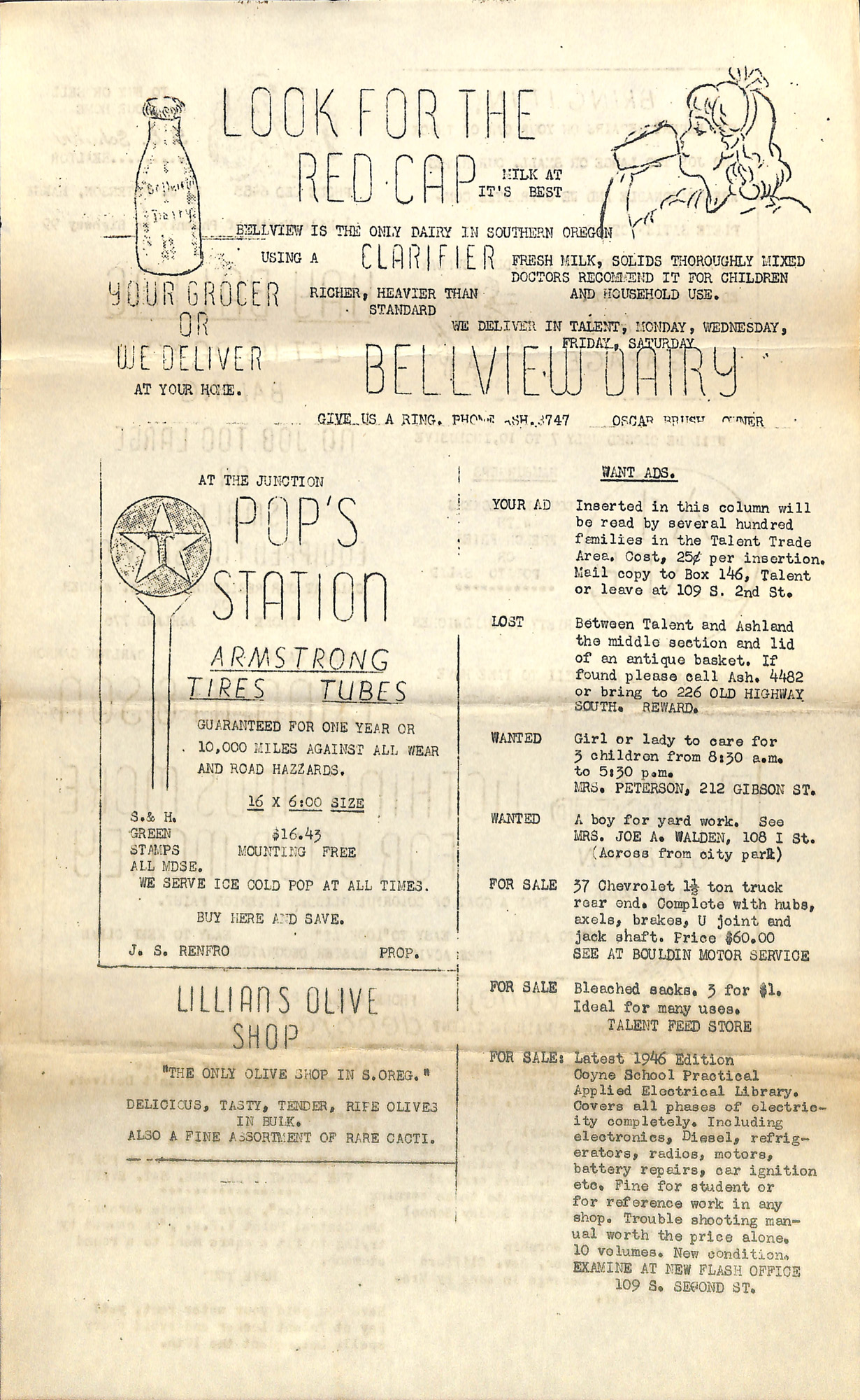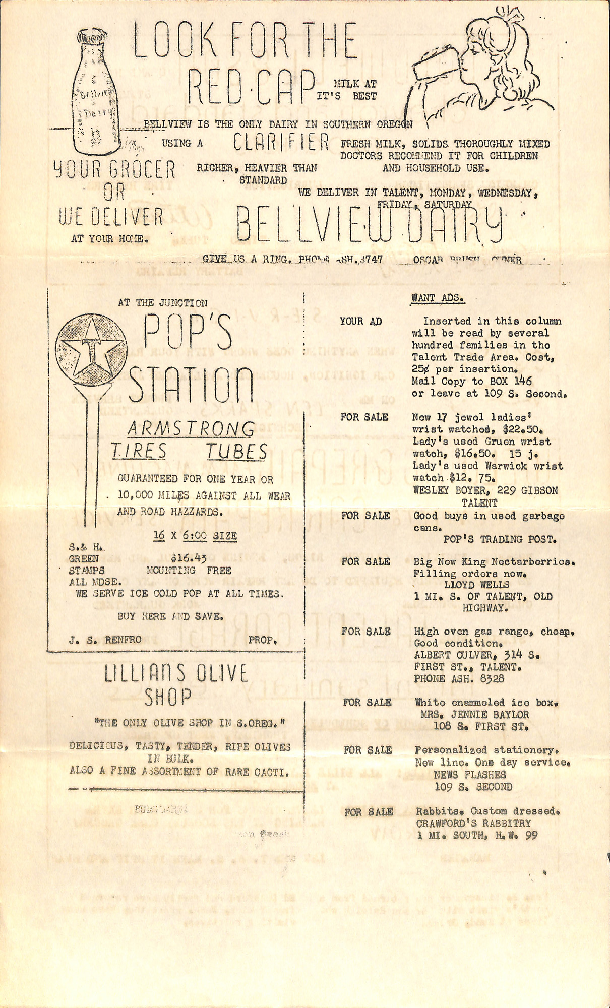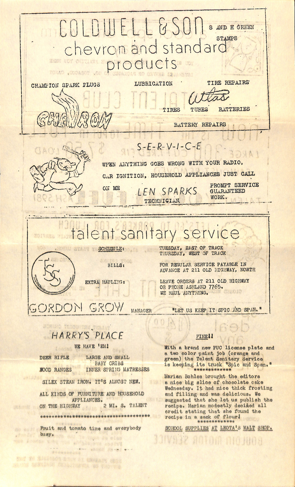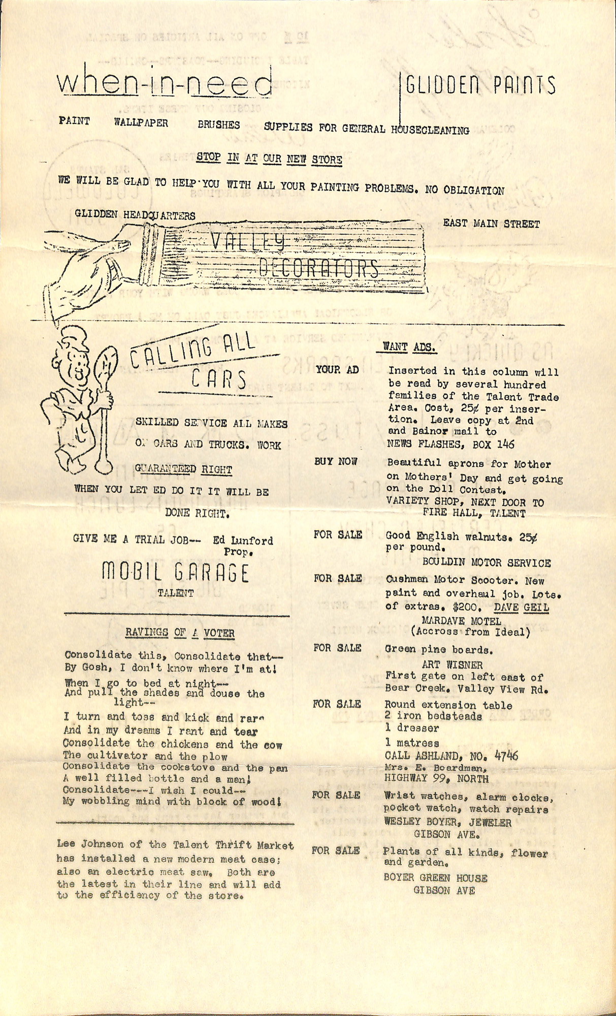 News Flashes EVERYBODY READS NEWS FLASHES VOLUME X NO. 39 SEPT. 24, 1948 NOMINEES FOR CITY OFFICE As a result of two nominating caucuses Talent has a group of nominees of record breaking proportion. MAYOR Harold Straus John Childers RECORDER Dave Block, Mrs. Teeter, Mrs. Dale Momany. TREASURER Frank Manness COUNCILMEN Ada Bouldin, Clarence Walden, Fred Van Dyke, Rudy Conner, Lucky Gilbreath, Chas. Long, Bob Logan, Roy Coghill, Leslie Mason, Joe Hosich, Loran Casebier, Ira Culver, Forrest Jennings, John Sample, Roy McGarety, Wayne Cowdrey. THREE GRANGES TIE In the Fall Harvest Festival Jubilee Talent, Bellview and Phoenix tied for first place for best display. Clarence Holdridge won fourth on his individual display. TALENT R.F.D.--OCT. 1. With Clarence Chamberlin of Ashland as carrier Talent Rural Route 1 will begin operation on Oct. 1. This route from the Talent office will cover Wagner Creek, Anderson Creek, Valley View, Sun Crest, and Old and New Highway South. This territory was formerly covered by Ashland, R 2. FOOD SALE SATURDAY. The Talent P.T.A. will hold a cooked food sale at the Talent Locker on Saturday of this week. Mrs. Nancy Jennings, Mrs. Ruth Zediker, and Mrs. Enid Casebier are among those who will conduct the sale. According to Mrs. Nancy Jennings, president of the organization, food contributions are solicited. My idea of a convincing talker is the fellow who can keep both hands in his pockets while describing the fish that got away. PLANNING COMMITTEE TO MEET Monday night the playground planning committee consisting of representatives of the Council, V.F.W., Grange, Community Club, Lions will meet and plan the location of equipment of playground apparatus in city park. INVOLVING PEOPLE Mr. and Mrs. Kenneth Porter, of Ohio, have taken over the management of the Talent Economy Grocery. Mrs. Leora Sommer has been confined to the Ashland Community Hospital with a severe attack of the influenza. The ladies of the Community Club spent Tuesday and Wednesday redecorating the dining room of the city hall. Mrs. Jas. Fleshman of Worthington Apartments has been elected to teach the eighth grade of the Butte Falls Schools. Charlie and Louvella Long visited in Roseburg last week. Leslie Pruett was involved in an auto collision near the fairgrounds last Sunday. Born: To Mr. and Mrs. Herman Bernstein, a daughter, Dawn Harriet. Mr. and Mrs. Ray Redmon have returned from Los Angeles where they visited Mr. Redmon's mother who has been ill. Ernie Allen of the Ideal Market has returned to work after a siege of flu. The editors are recipients of a beautiful bouquet of dahlias and Michelmas daisies presented by Mrs. Lulah Boyer of the Talent Green House. Wesley Boyer an experienced and successful violin instructor is offering a free aptitude test to prospective students. Mr. Boyer lives at 229 Gibson Street. Mr. C. C. Harper reports that the stove he advertised in our last issue was sold within three hours of distribution of News Flashes. The most interesting part of News Flashes is the advertising section. Page 2, full-page ad for: TALENT MARKET Page 3, ads for: COLDWELL & SON LEN SPARKS ELECTRICIAN TALENT GARAGE TALENT SANITARY SERVICE Mrs. E. Nieswonger has returned from a month's visit with her son Raleigh who lives at Bend, Oregon. Ed Lunsford and family have returned from Yakima, Wash. where they have been visiting relatives. WANT ADS. YOUR AD--Inserted in this column will be read by several hundred families in the Talent trade area. Cost, 25¢ per insertion. Mail copy to BOX 146 or leave at 109 S. SECOND. FOR SALE--New 17 jewel ladies' wrist watches, $22.50. Lady's used Gruen wrist watch, $16.50. 15 j. Lady's used Warwick wrist watch $12.75. WESLEY BOYER, 229 GIBSON, TALENT FOR SALE--Good buys in used garbage cans. POP'S TRADING POST. FOR SALE--Big New King Nectarberries. Filling orders now. LLOYD WELLS, 1 MI. S. OF TALENT, OLD HIGHWAY. FOR SALE--High oven gas range, cheap. Good condition. ALBERT CULVER, 314 S. FIRST ST., TALENT. PHONE ASH. 8328 FOR SALE--White enameled ice box. MRS. JENNIE BAYLOR, 108 S. FIRST ST. FOR SALE--Personalized stationery. New line, One day service. NEWS FLASHES. 109 S. SECOND FOR SALE--Rabbits. Custom dressed. CRAWFORD'S RABBITRY. 1 MI. SOUTH, H.W. 99 Page 5, ad for: PORTER'S CASH GROCERY BYGONE DAYS IN TALENT FROM FILES OF NEWS FLASHES MR. AND MRS. O. M. GODDARD