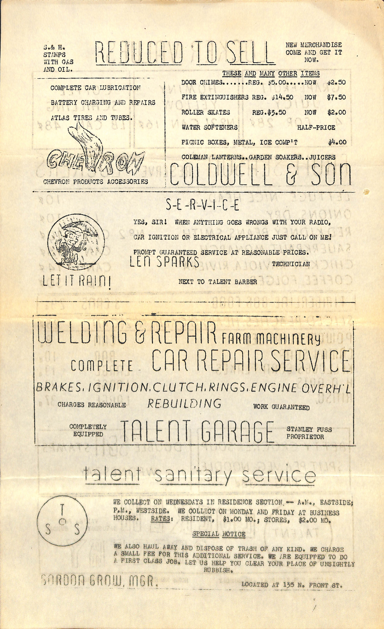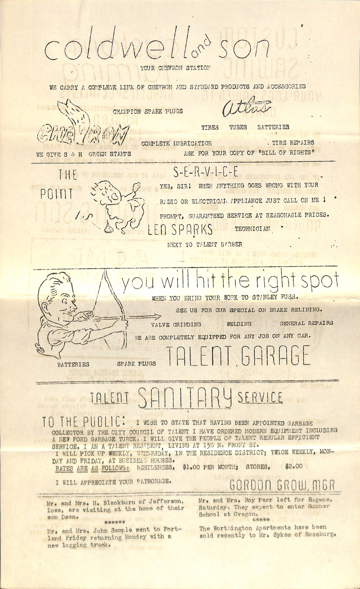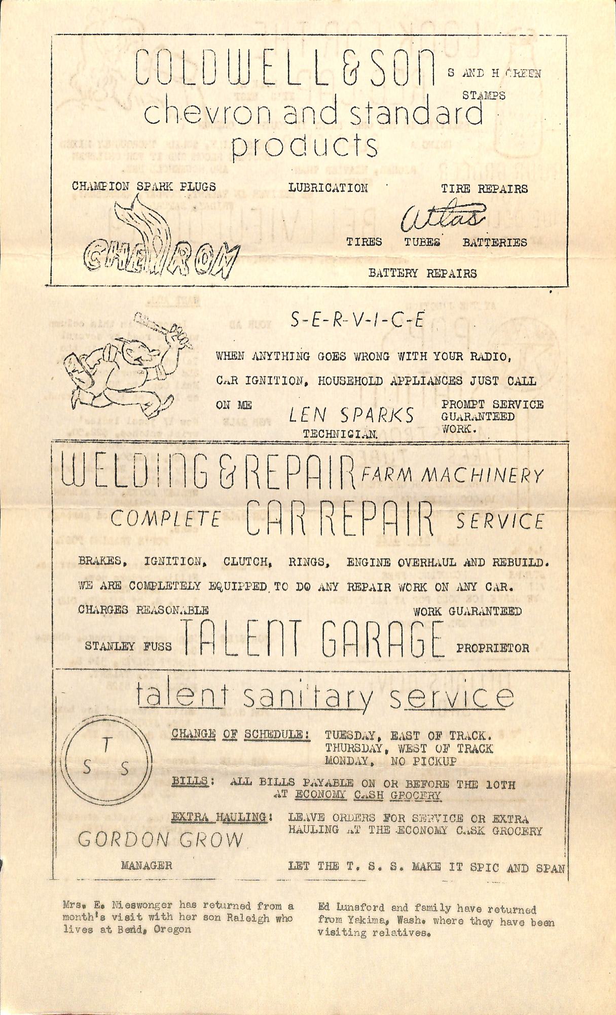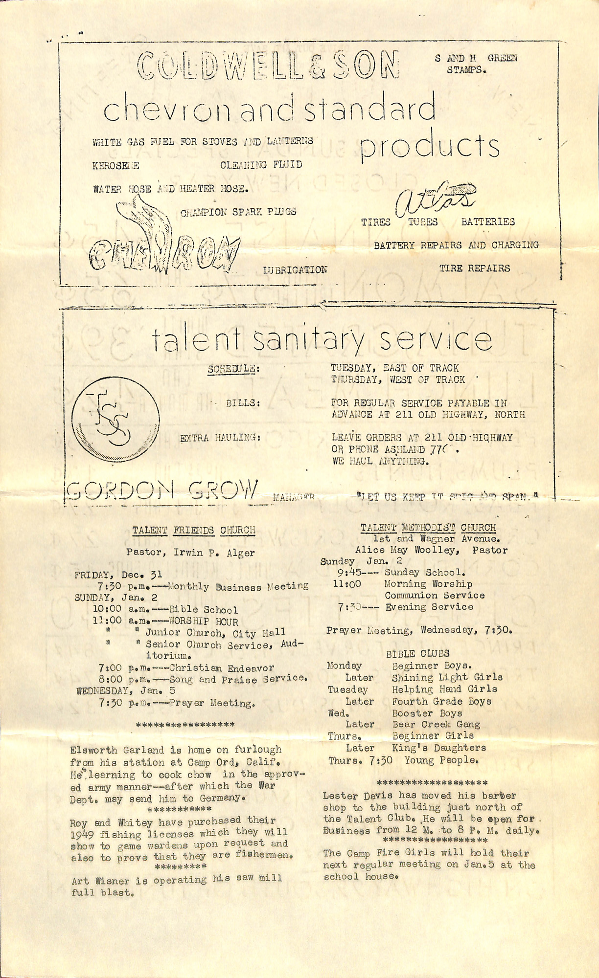 Page 7, ads for: COLDWELL & SON TALENT SANITARY SERVICE TALENT FRIENDS CHURCH Pastor, Irwin P. Alger FRIDAY, Dec. 31 7:30 p.m.--Monthly Business Meeting SUNDAY, Jan. 2 10:00 a.m.--Bible School 11:00 a.m.--WORSHIP HOUR 11:00 a.m.--Junior Church, City Hall 11:00 a.m.--Senior Church Service, Auditorium. 7:00 p.m.--Christian Endeavor 8:00 p.m.--Song and Praise Service WEDNESDAY, Jan. 5 7:30 p.m.--Prayer Meeting Ellsworth Garland is home on furlough from his station at Camp Ord, Calif. He is learning to cook chow in the approved army manner--after which the War Dept. may send him to Germany. Roy and Whitey have purchased their 1949 fishing licenses which they will show to game wardens upon request and also to prove that they are fishermen. Art Wisner is operating his saw mill full blast. TALENT METHODIST CHURCH
