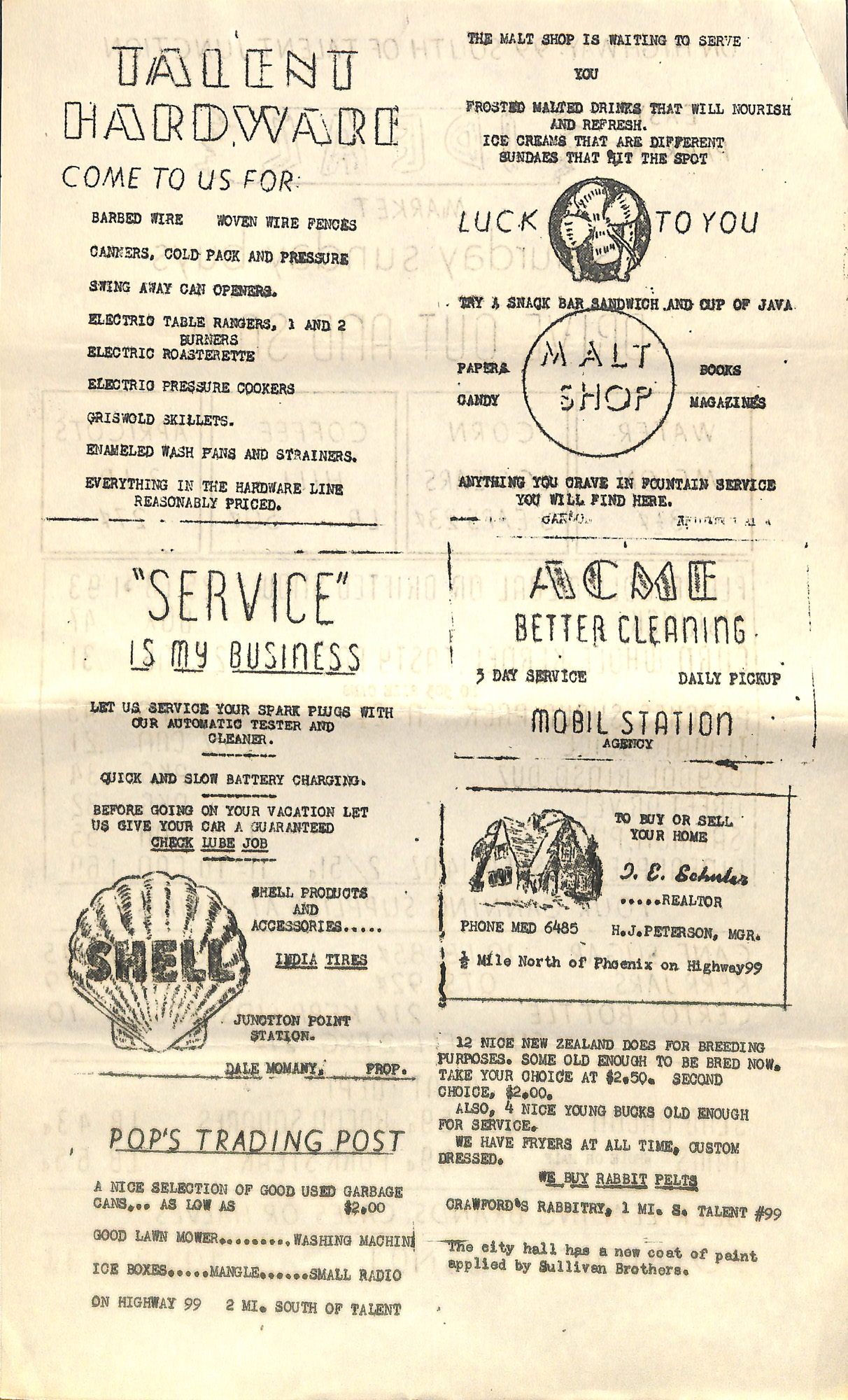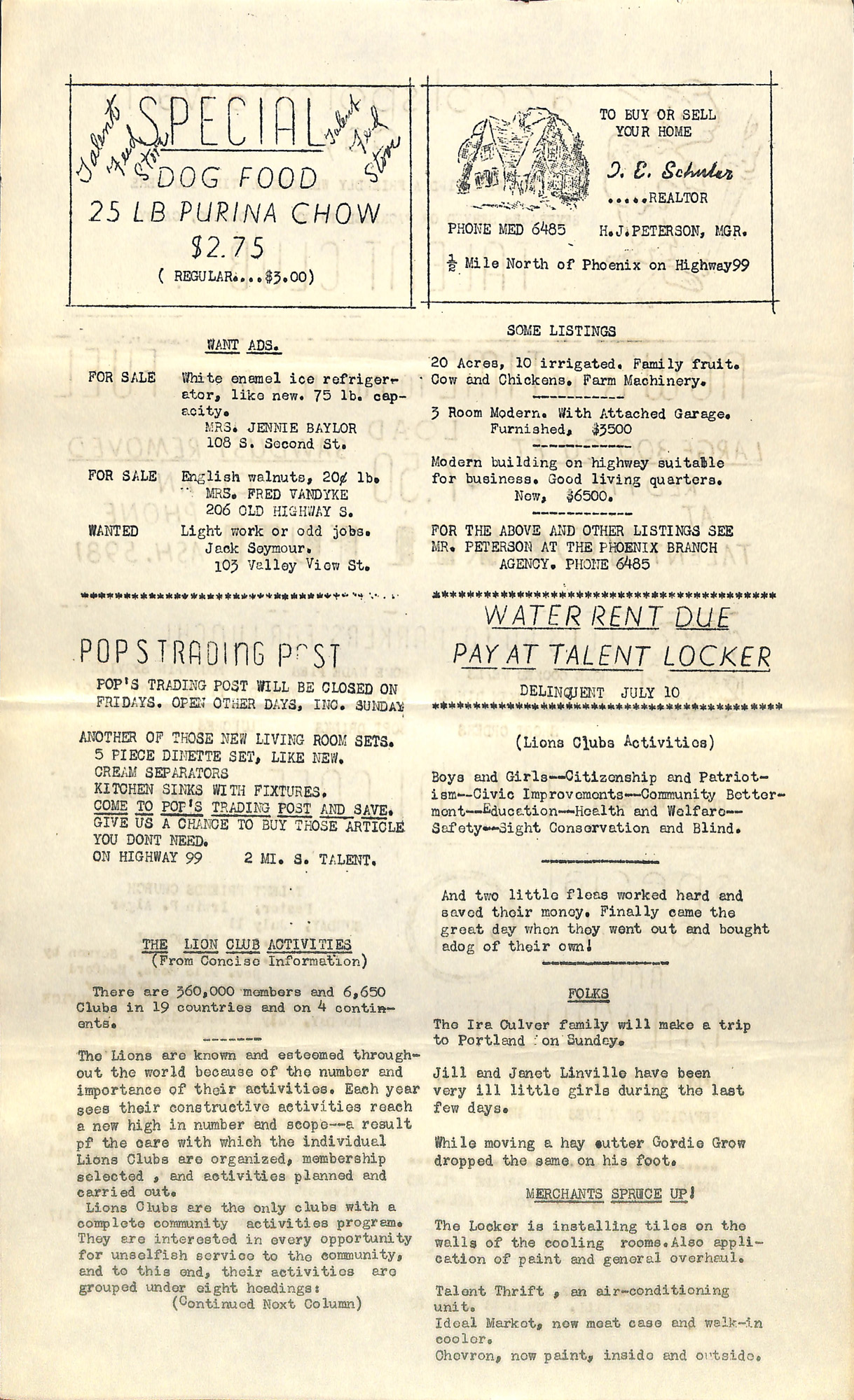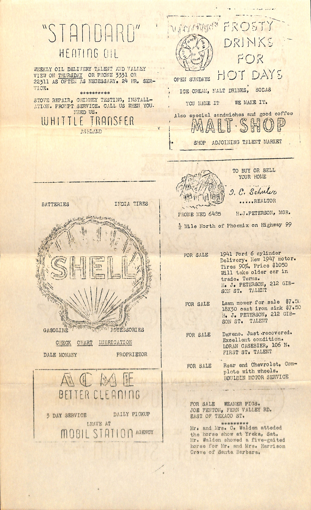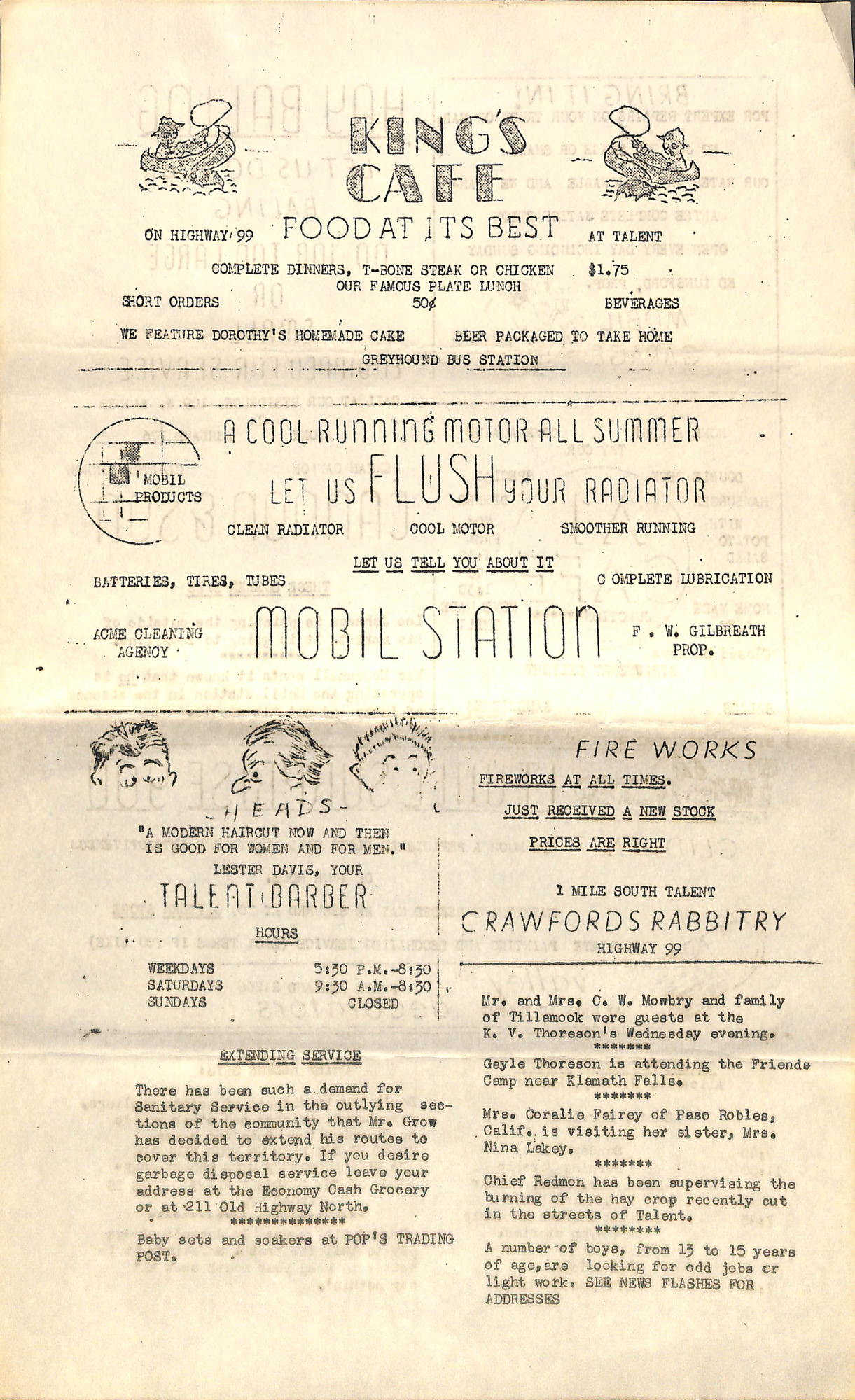 Page 4, full-page ad for: VALLEY LOCKER GROCERY Page 5, ads for: KING'S CAFÉ SULLIVAN BROTHERS GILBREATH MOBIL STATION FARMERS EXCHANGE INSURANCE SAVE YOUR TAGS. The Talent Boy Scout Troop is collecting 1947 and 1948 auto license plates. These plates will be salvaged for the aluminum of which they are made. You can help the local scouts by seeing that a Talent Boy Scout receives your discarded plates. DO WE NEED WATER METERS? There are two valid arguments (worth considering) in favor of water meters in Talent. (1) To conserve and prevent waste of water. (2) As a source of additional revenue for the town. Answering these arguments. (1) The users have, as a whole, complied faithfully with emergency restrictions. A few have not. Proper inspection and supervision will bring the few in line. (2) Our water system should be self-supporting but not a source of revenue to meet other expenses of the town. We are opposed to the installation of meters except to a limited extent. Will tell you why in a future issue. H.H.L.