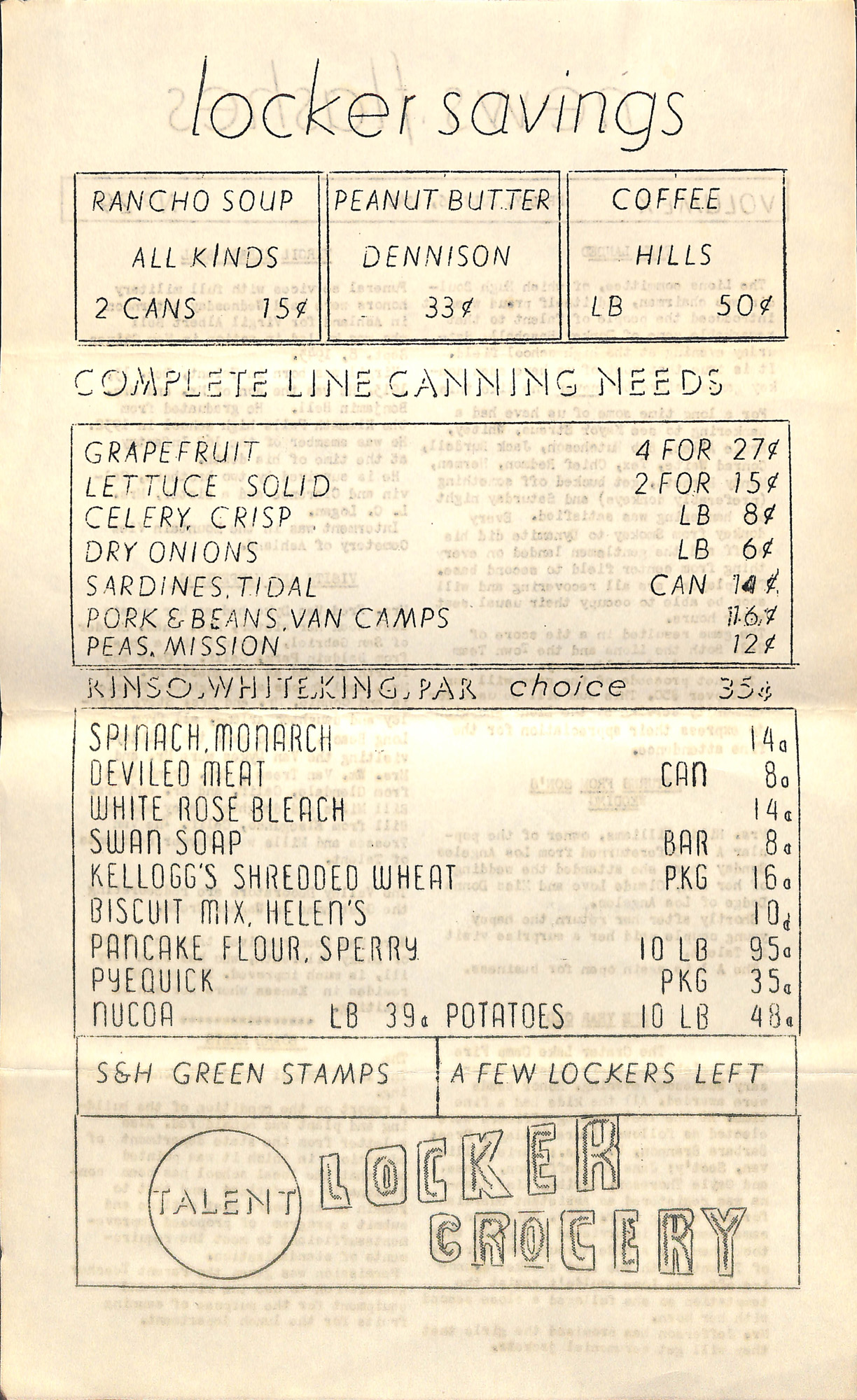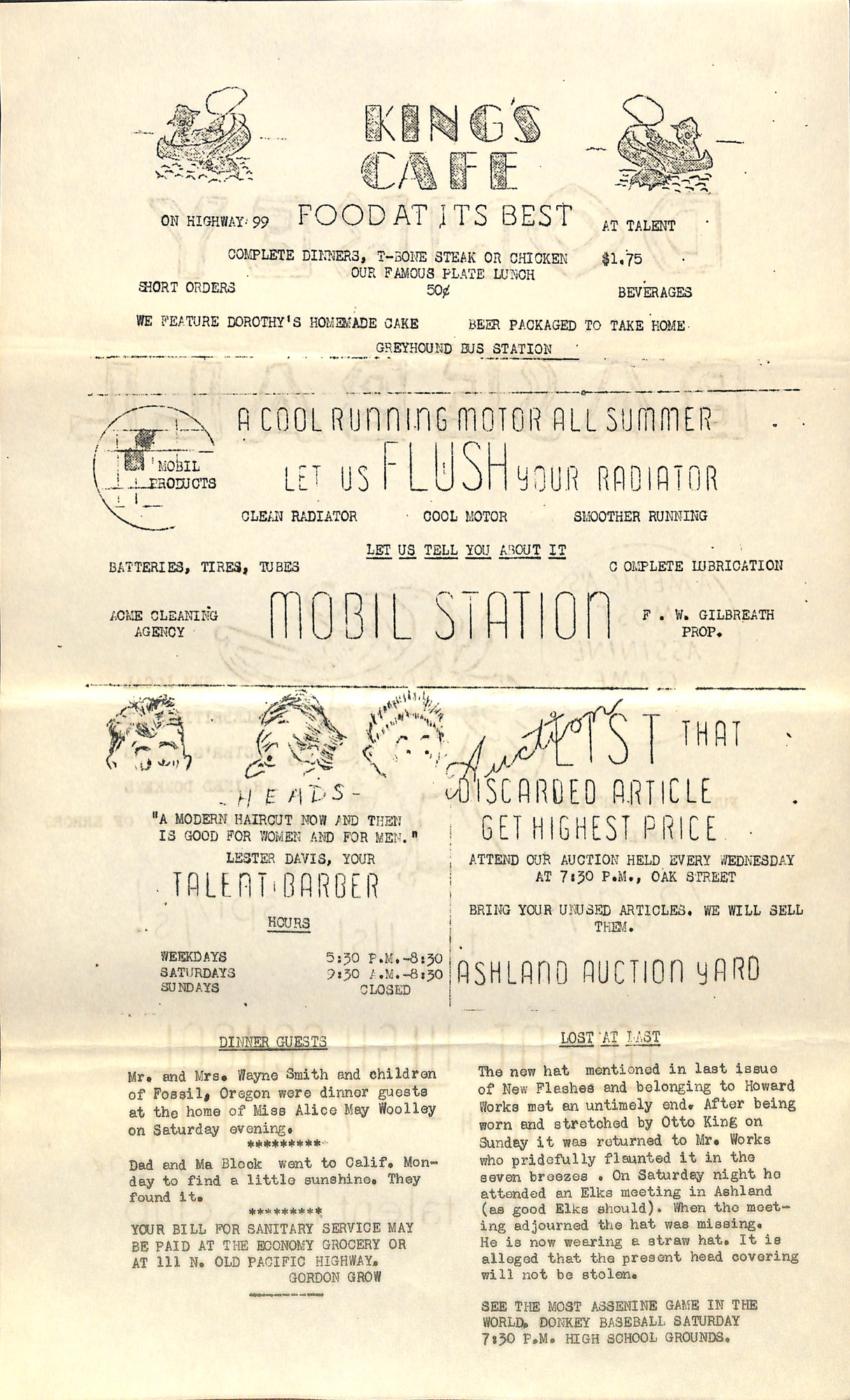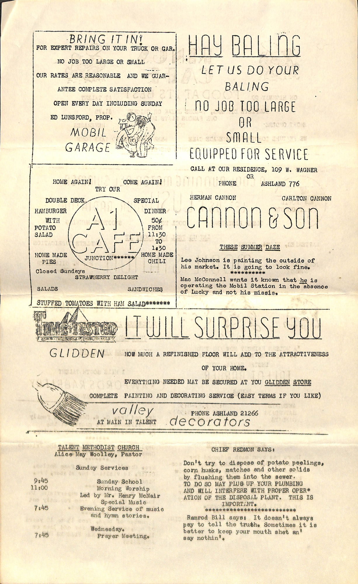 Page 4, full-page ad for: VALLEY LOCKER GROCERY Page 5, ads for: KING'S CAFÉ SULLIVAN BROTHERS GILBREATH MOBIL STATION FARMERS EXCHANGE INSURANCE SAVE YOUR TAGS. The Talent Boy Scout Troop is collecting 1947 and 1948 auto license plates. These plates will be salvaged for the aluminum of which they are made. You can help the local scouts by seeing that a Talent Boy Scout receives your discarded plates. DO WE NEED WATER METERS? There are two valid arguments (worth considering) in favor of water meters in Talent. (1) To conserve and prevent waste of water. (2) As a source of additional revenue for the town. Answering these arguments. (1) The users have, as a whole, complied faithfully with emergency restrictions. A few have not. Proper inspection and supervision will bring the few in line. (2) Our water system should be self-supporting but not a source of revenue to meet other expenses of the town. We are opposed to the installation of meters except to a limited extent. Will tell you why in a future issue. H.H.L.