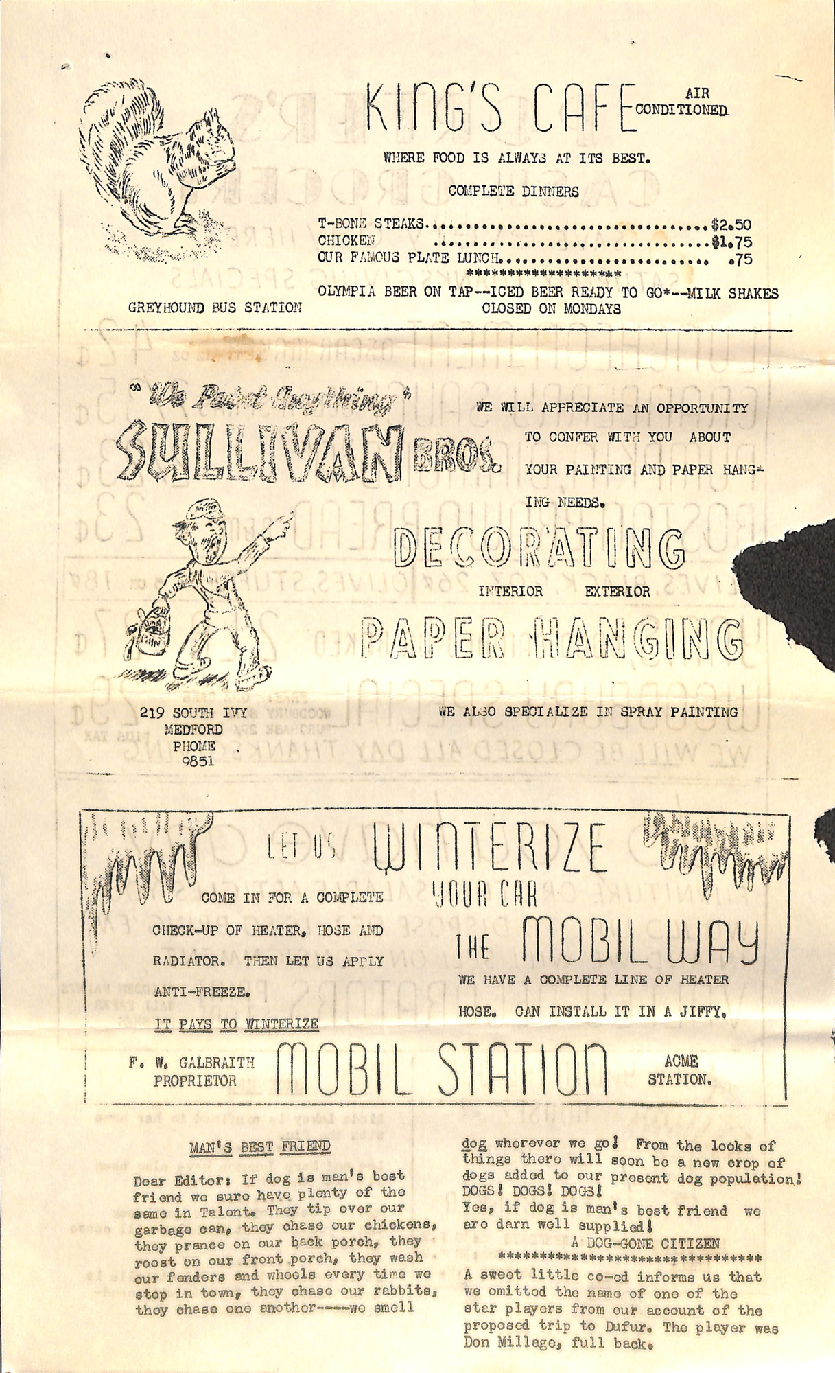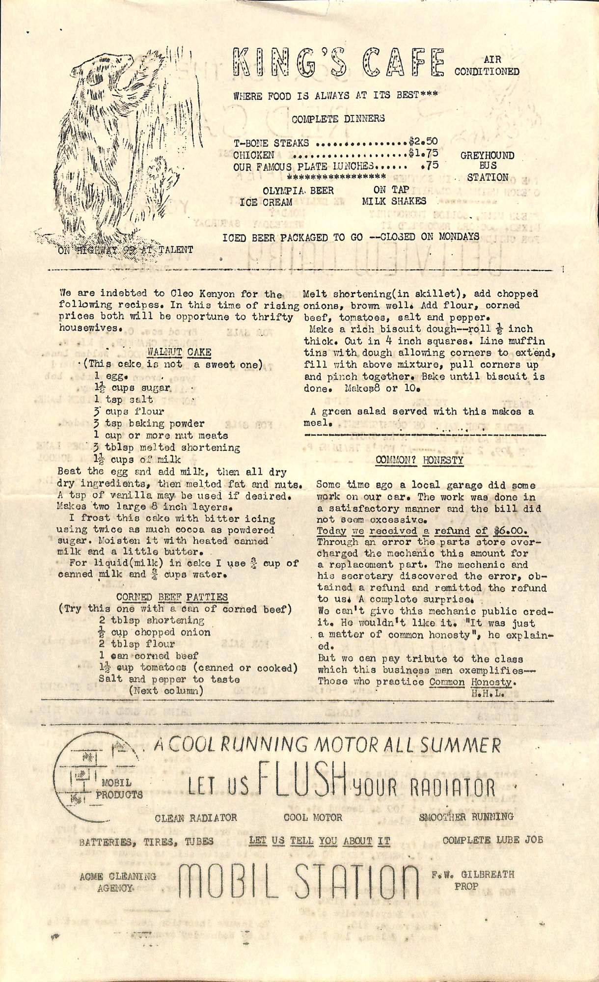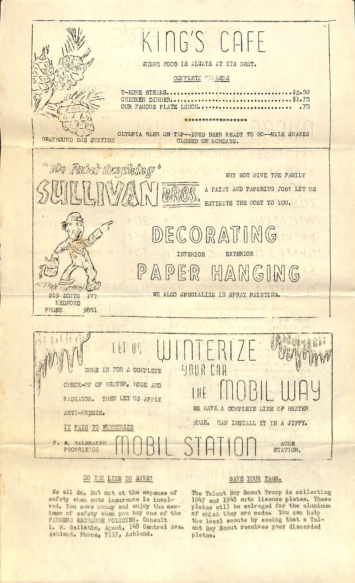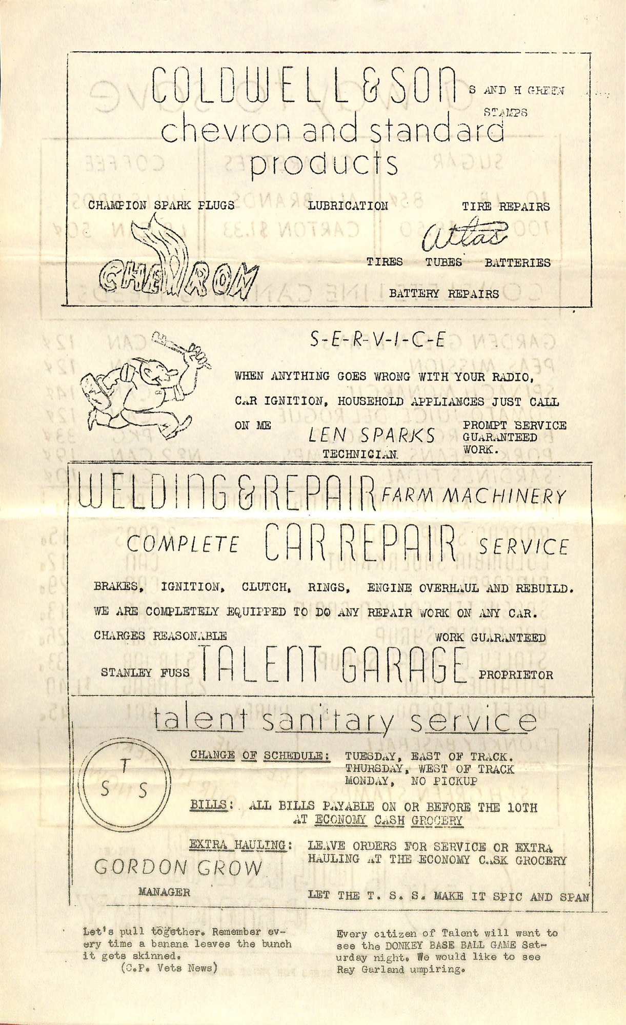Page 4, full-page ad for: VALLEY LOCKER GROCERY Page 5, ads for: KING'S CAFÉ SULLIVAN BROTHERS GILBREATH MOBIL STATION FARMERS EXCHANGE INSURANCE SAVE YOUR TAGS. The Talent Boy Scout Troop is collecting 1947 and 1948 auto license plates. These plates will be salvaged for the aluminum of which they are made. You can help the local scouts by seeing that a Talent Boy Scout receives your discarded plates. DO WE NEED WATER METERS? There are two valid arguments (worth considering) in favor of water meters in Talent. (1) To conserve and prevent waste of water. (2) As a source of additional revenue for the town. Answering these arguments. (1) The users have, as a whole, complied faithfully with emergency restrictions. A few have not. Proper inspection and supervision will bring the few in line. (2) Our water system should be self-supporting but not a source of revenue to meet other expenses of the town. We are opposed to the installation of meters except to a limited extent. Will tell you why in a future issue. H.H.L.