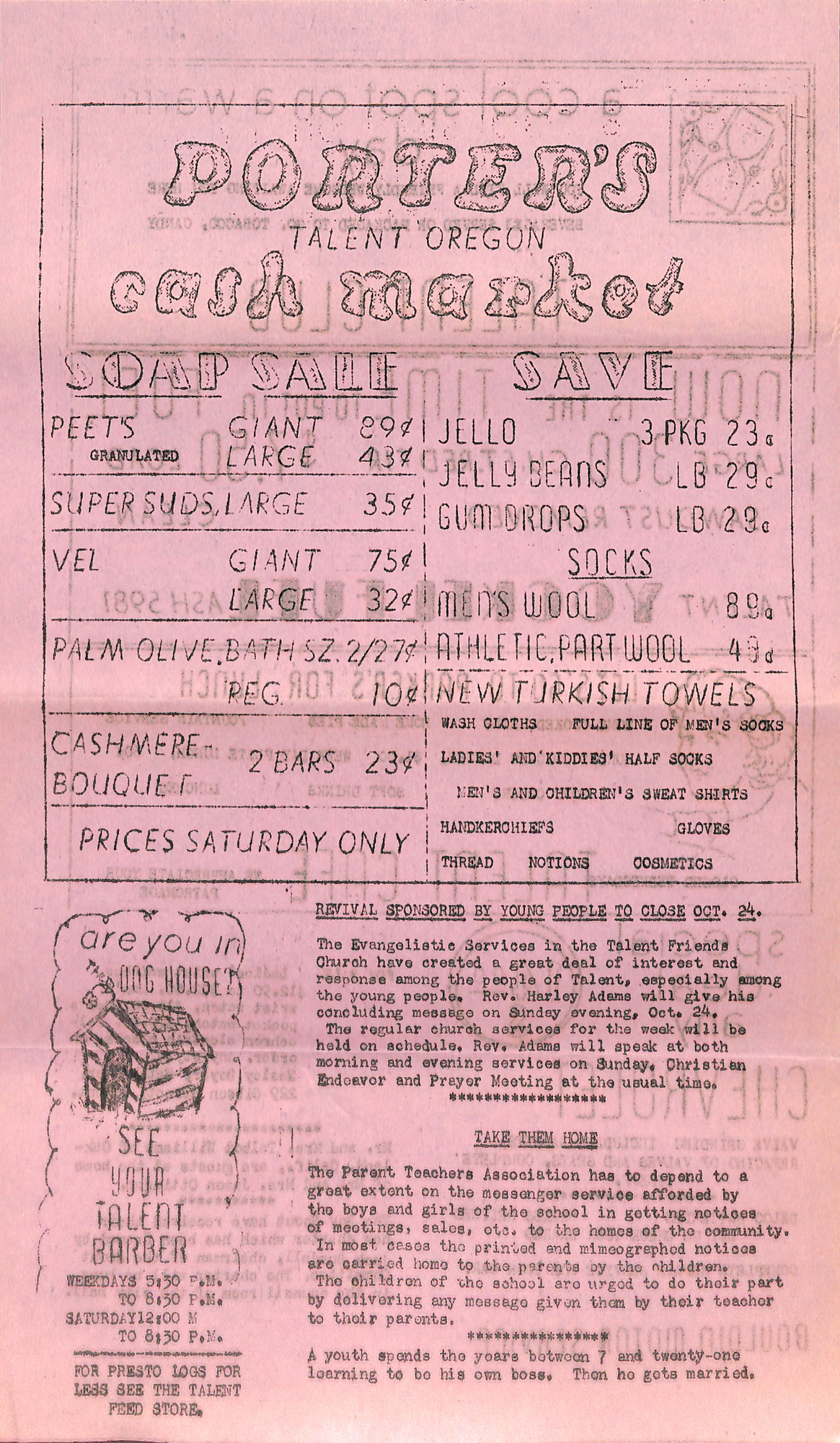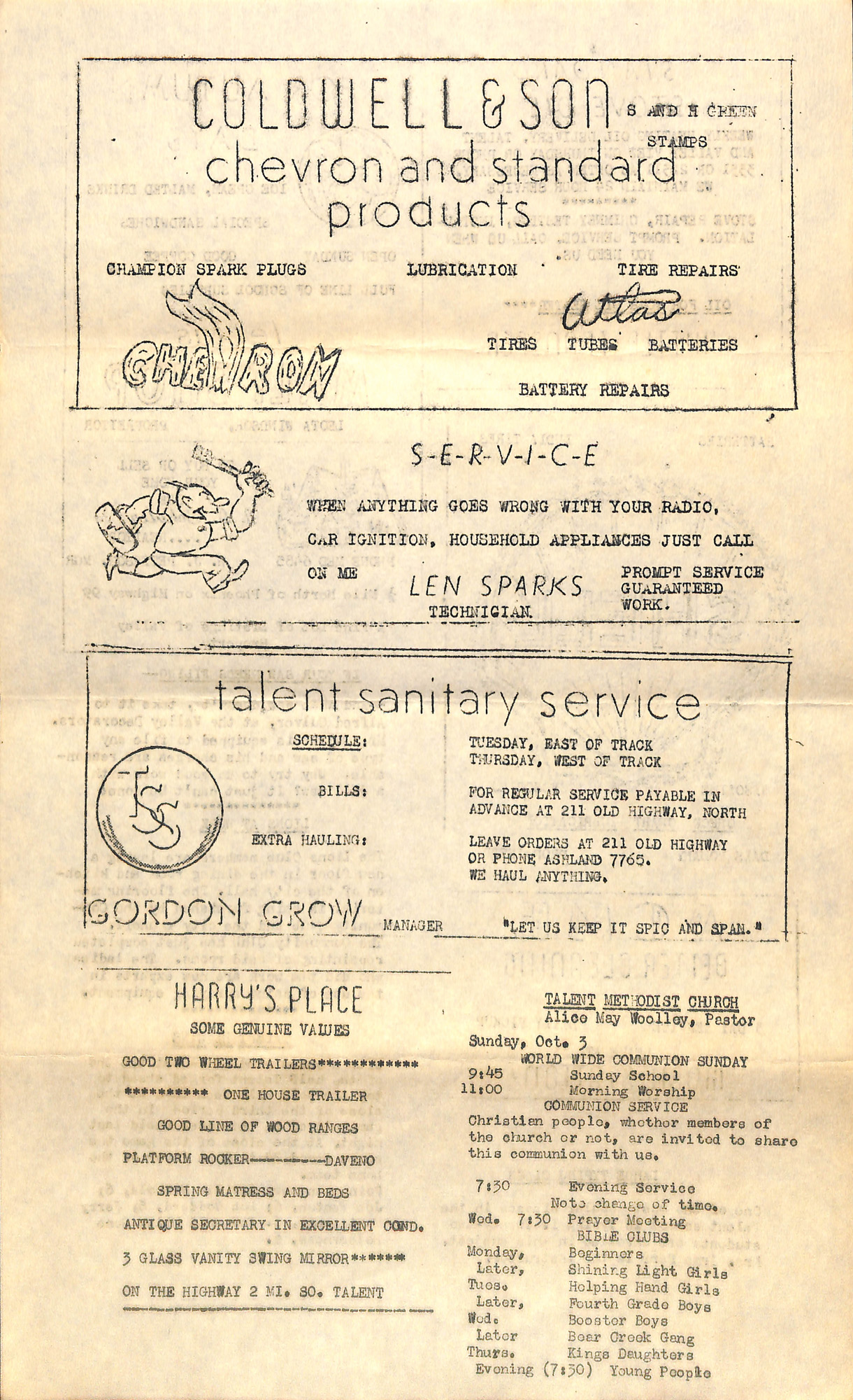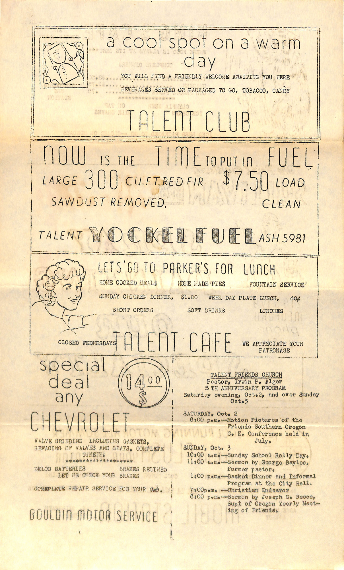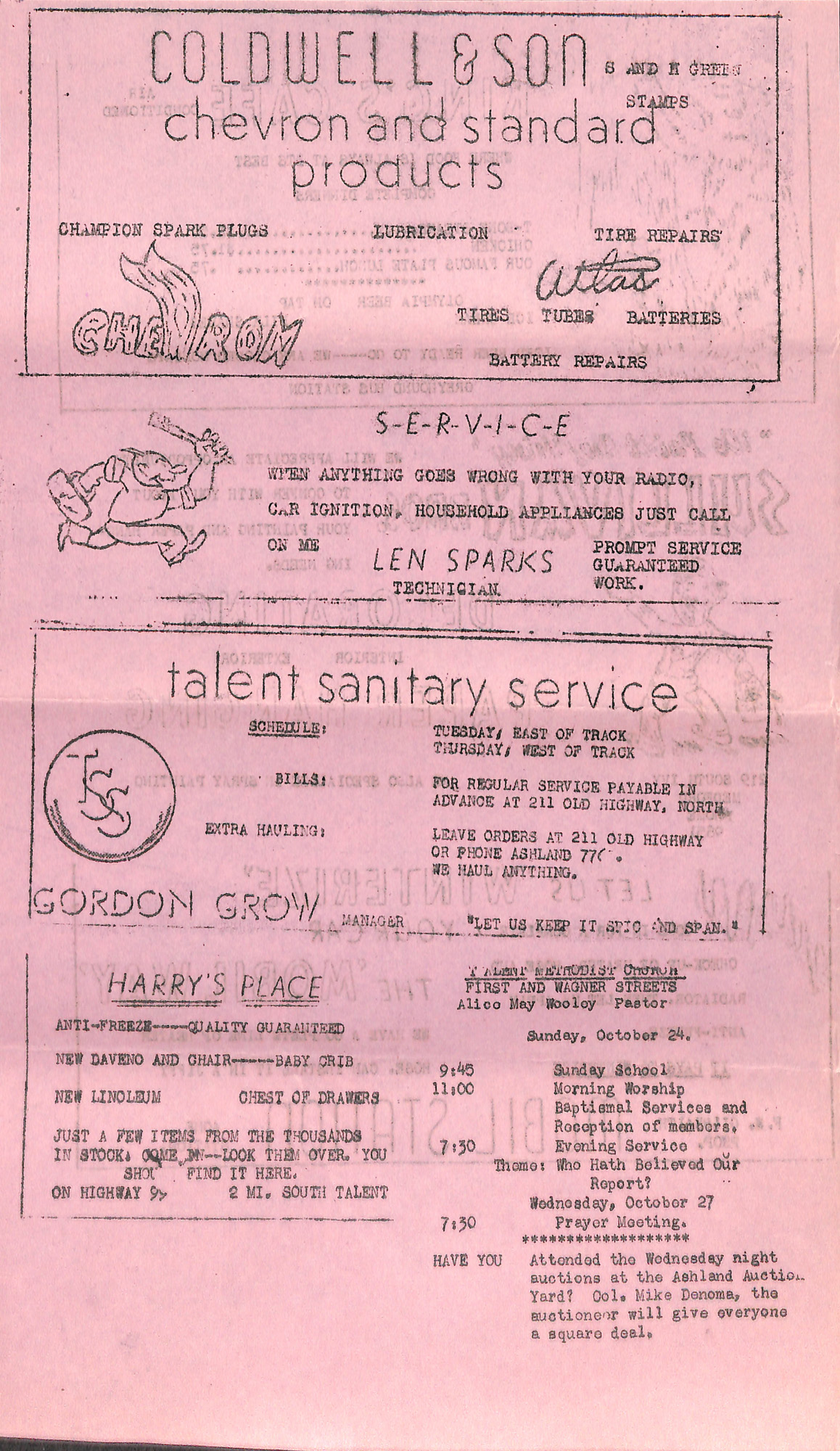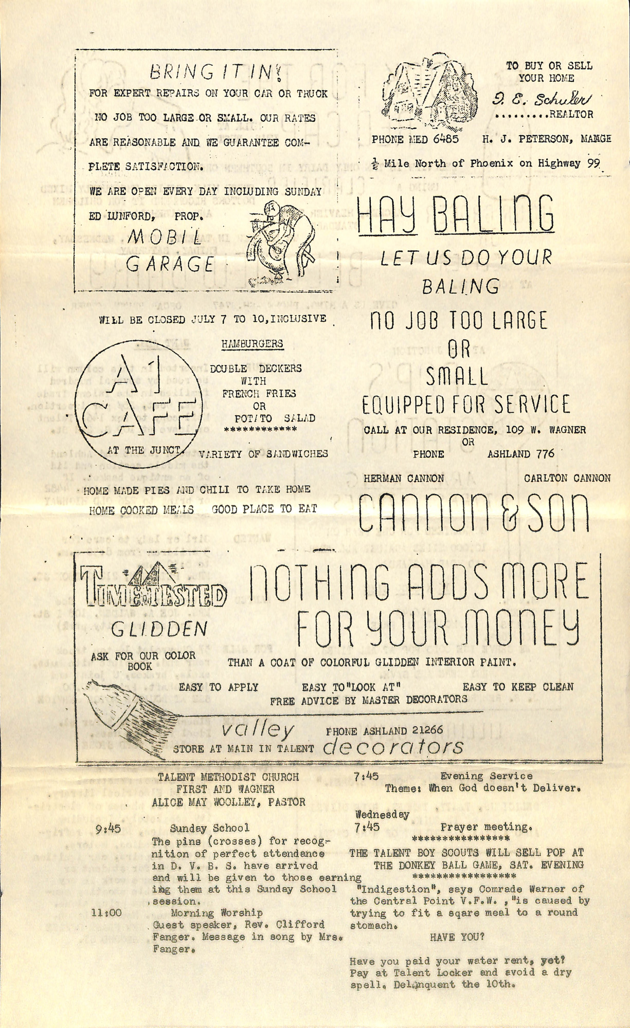 The Evangelistic Services in the Talent Friends Church have created a great deal of interest and response among the people of Talent, especially among the young people. Rev. Harley Adams will give his concluding message on Sunday evening, Oct. 24. The regular church services for the week will be held on schedule. Rev. Adams will speak at both morning and evening services on Sunday. Christian Endeavor and Prayer Meeting at the usual time. TAKE THEM HOME The Parent Teachers Association has to depend to a great extent on the messenger service afforded by the boys and girls of the school in getting notices of meetings, sales, etc. to the homes of the community. In most cases the printed and mimeographed notices are carried home to the parents by the children. The children of the school are urged to do their part by delivering any message given them by their teacher to their parents. A youth spends the years between 7 and twenty-one learning to be his own boss. Then he gets married. Page 7, ads for: COLDWELL & SON LEN SPARKS, ELECTRICAL TECHNICIAN TALENT SANITARY SERVICE HARRY'S PLACE TALENT METHODIST CHURCH FIRST AND WAGNER STREETS Alice May Woolley, Pastor Sunday, October 24 9:45--Sunday School 11:00--Morning Worship, Baptismal Services and Reception of members. 7:30--Evening Service; Theme: Who Hath Believed Our Report? Wednesday, October 27 7:30--Prayer Meeting HAVE YOU Attended the Wednesday night auctions at the Ashland Auction Yard? Col. Mike Denoma, the auctioneer, will give everyone a square deal. Page 8,