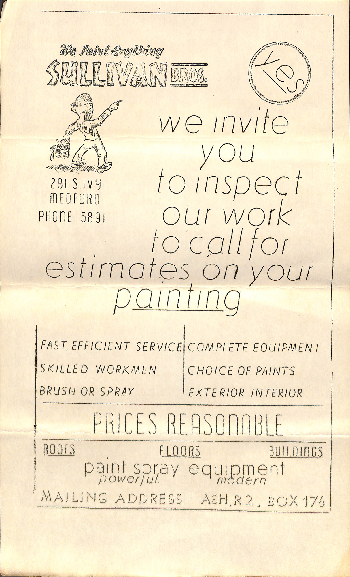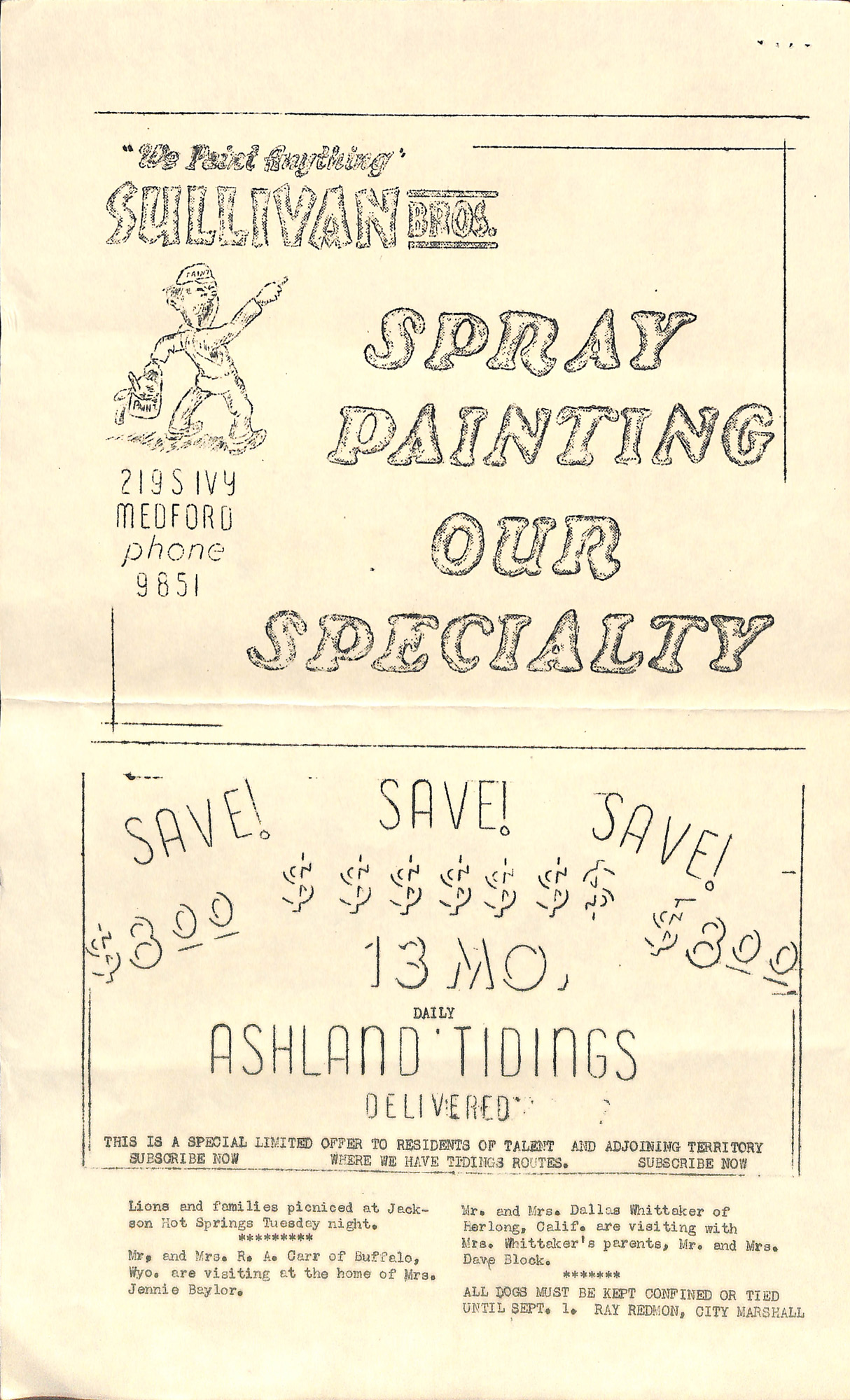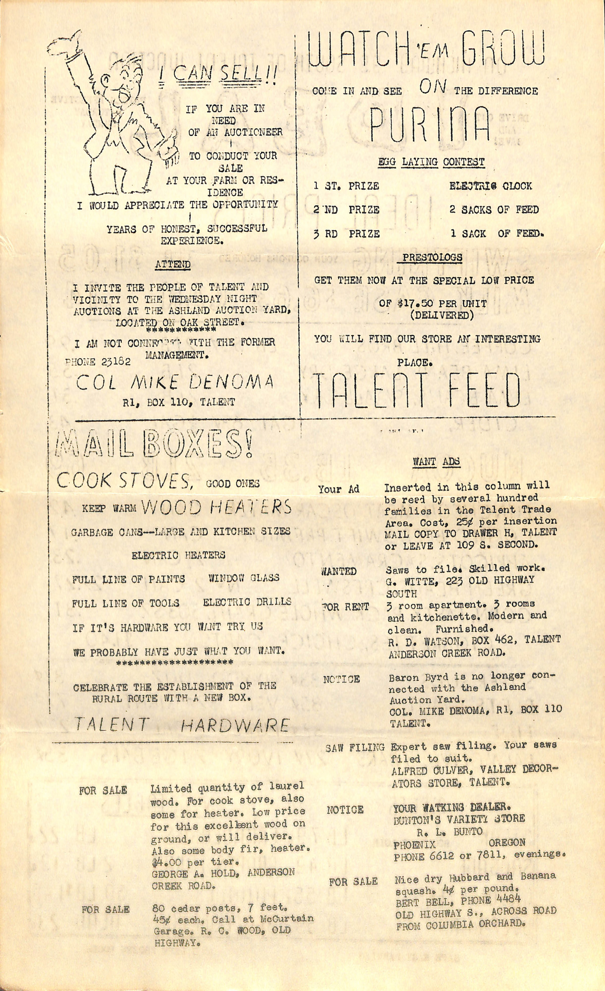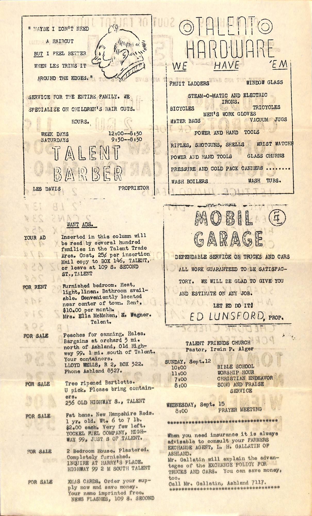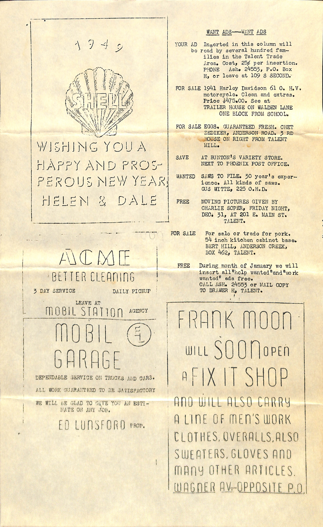 YOUR AD inserted in this column will be read by several hundred families in the Talent trade area. Cost, 25¢ per insertion. PHONE Ash. 24553, P.O. Box H, or leave at 109 S SECOND. FOR SALE--1941 Harley Davidson 61 O.H.V. motorcycle. Clean and extras. Price $475.00. See at TRAILER HOUSE ON WALDEN LANE ONE BLOCK FROM SCHOOL. FOR SALE EGGS. GUARANTEED FRESH. CHET ZEDIKER, ANDERSON ROAD. 3 RD HOUSE ON RIGHT FROM TALENT MILL. SAVE--AT BUXTON'S VARIETY STORE. NEXT TO PHOENIX POST OFFICE. WANTED--SAWS TO FILE. 30 years' experience. All kinds of saws. GUS WITTE, 225 O.H.D. FREE--MOVING PICTURES GIVEN BY CHARLIE SOPER, FRIDAY NIGHT, DEC. 31, AT 201 E. MAIN ST. TALENT. FOR SALE--For sale or trade for pork 54 inch kitchen cabinet base. BERT HILL, ANDERSON CREEK, BOX 462, TALENT. FREE--During month of January we will insert all "help wanted" and "work wanted" ads free. CALL ASH. 24553 or MAIL COPY TO DRAWER H, TALENT. |