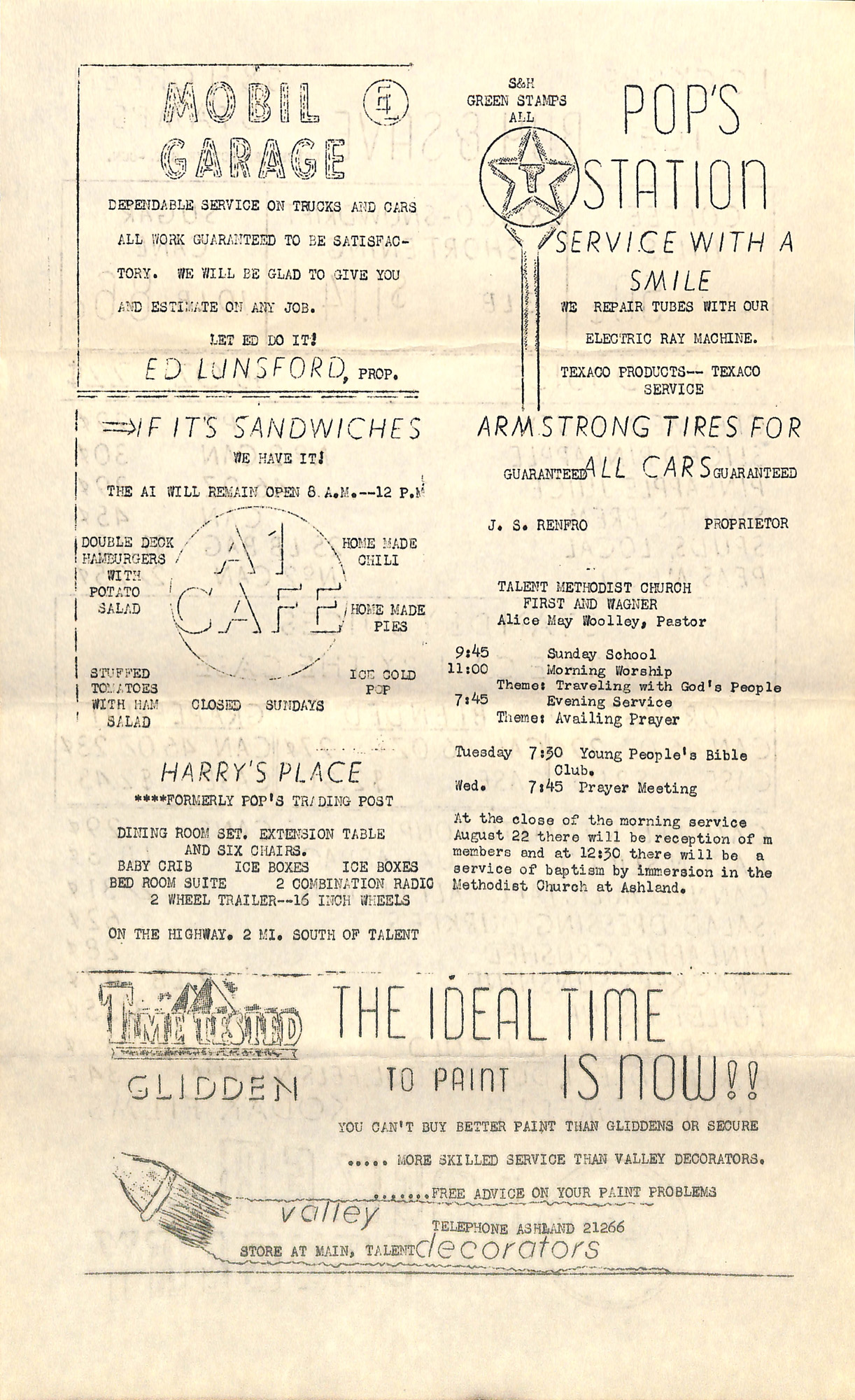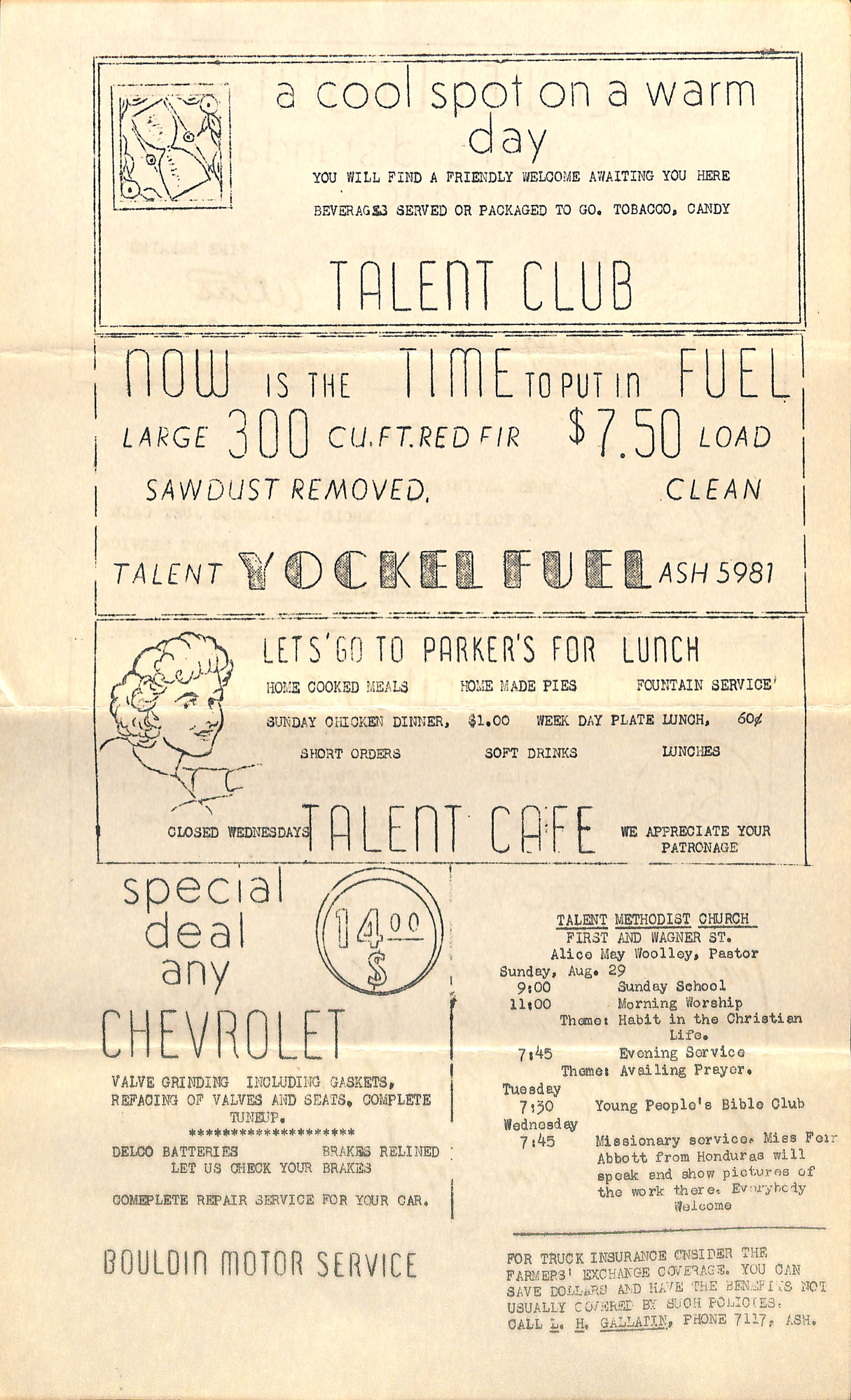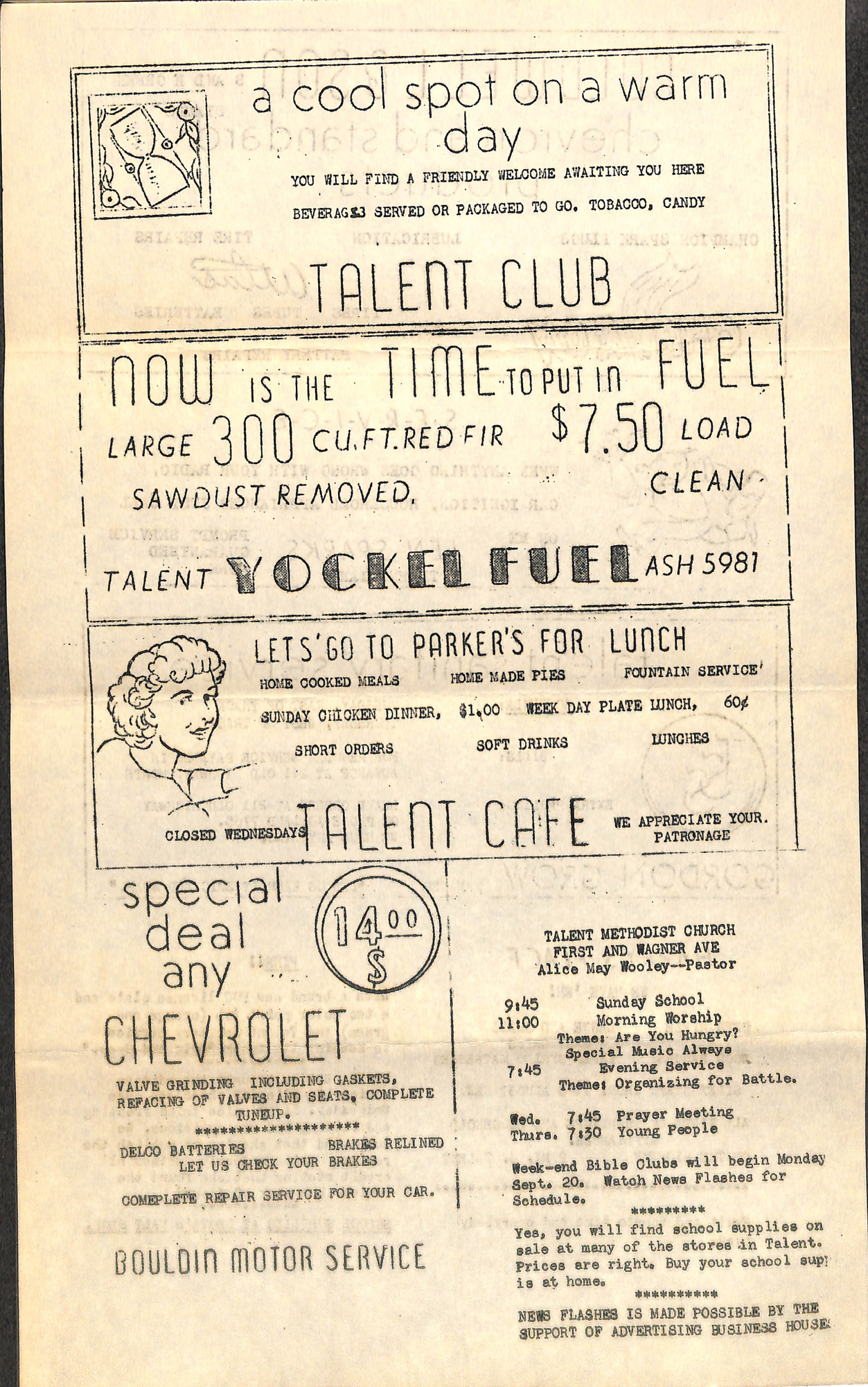 Pastor, Irwin P. Alger SUNDAY, Sept. 12 10:00--BIBLE SCHOOL 11:00--WORSHIP HOUR 7:00--CHRISTIAN ENDEAVOR 8:00--SONG AND PRAISE SERVICE WEDNESDAY, Sept. 15 8:00--PRAYER MEETING Page 5, ads for: TALENT CLUB YOCKEL FUEL PARKER'S TALENT CAFÉ BOULDIN MOTOR SERVICE TALENT METHODIST CHURCH FIRST AND WAGNER AVE Alice May Woolley, Pastor 9:45--Sunday School 11:00--Morning Worship ; Theme: Are You Hungry? Special Music Always 7:45--Evening Service; Theme: Organizing for Battle. Wed. 7:45--Prayer Meeting Thurs. 7:30--Young People Weekend Bible Clubs will begin Monday, Sept. 20. Watch News Flashes for Schedule. Yes, you will find school supplies on sale at many of the stores in Talent. Prices are right. Buy your school supplies at home. NEWS FLASHES IS MADE POSSIBLE BY THE SUPPORT OF ADVERTISING BUSINESS HOUSES. Fruit