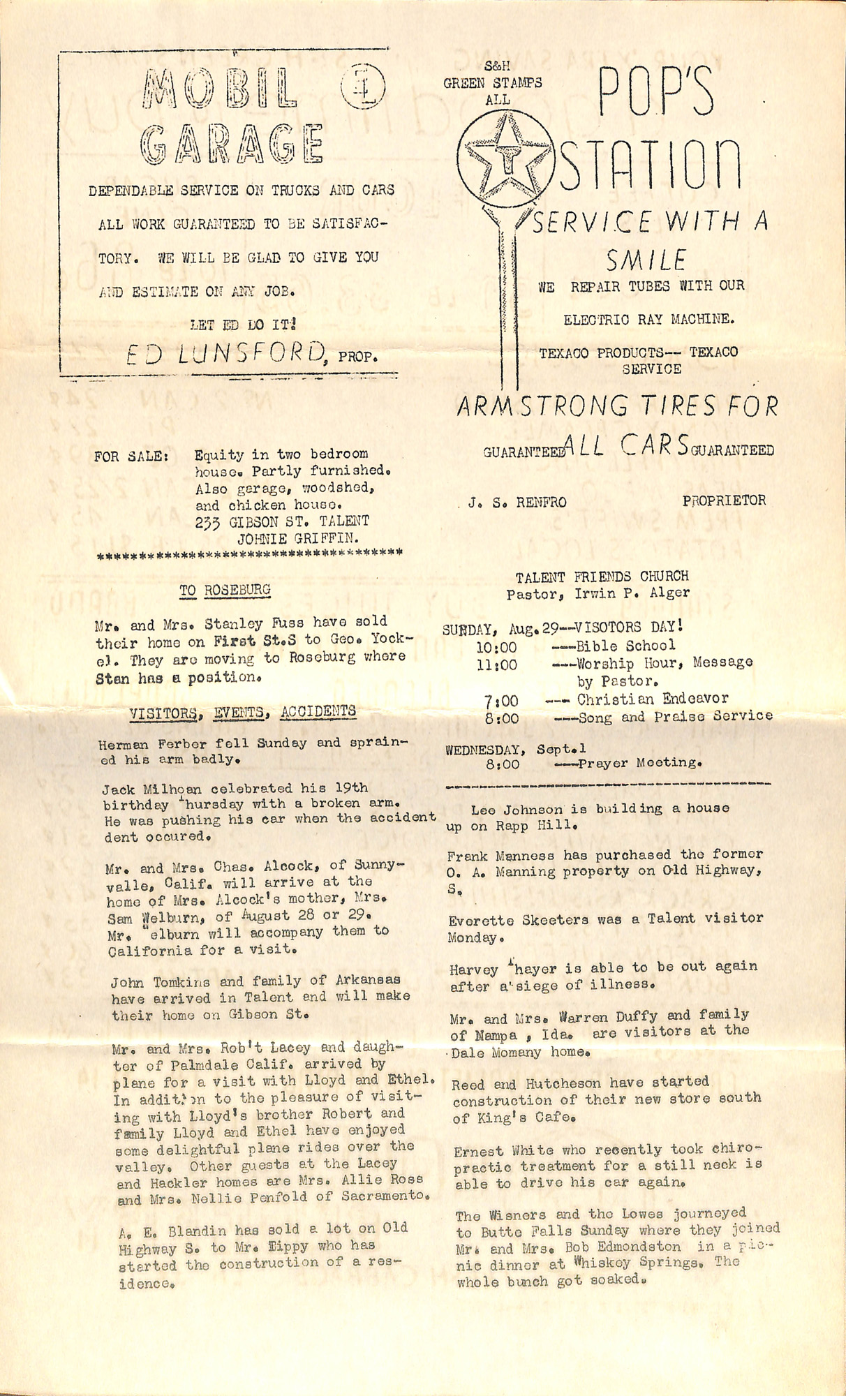 Mrs. Laura Abbott of Butte Falls and Mrs. Hilda Welch of Bellview were visiting with Mrs. Lilly Burnette and Mr. and Mrs. H.H. Lowe on Thursday…Mr. and Mrs. Stanley Robbins have purchased the home formerly occupied by A.T. Edmondson. Talent News Flashes September 13, 1934, now lost. Reprinted in the September 2, 1960 News Flashes -----------------------------------------------------------------------------