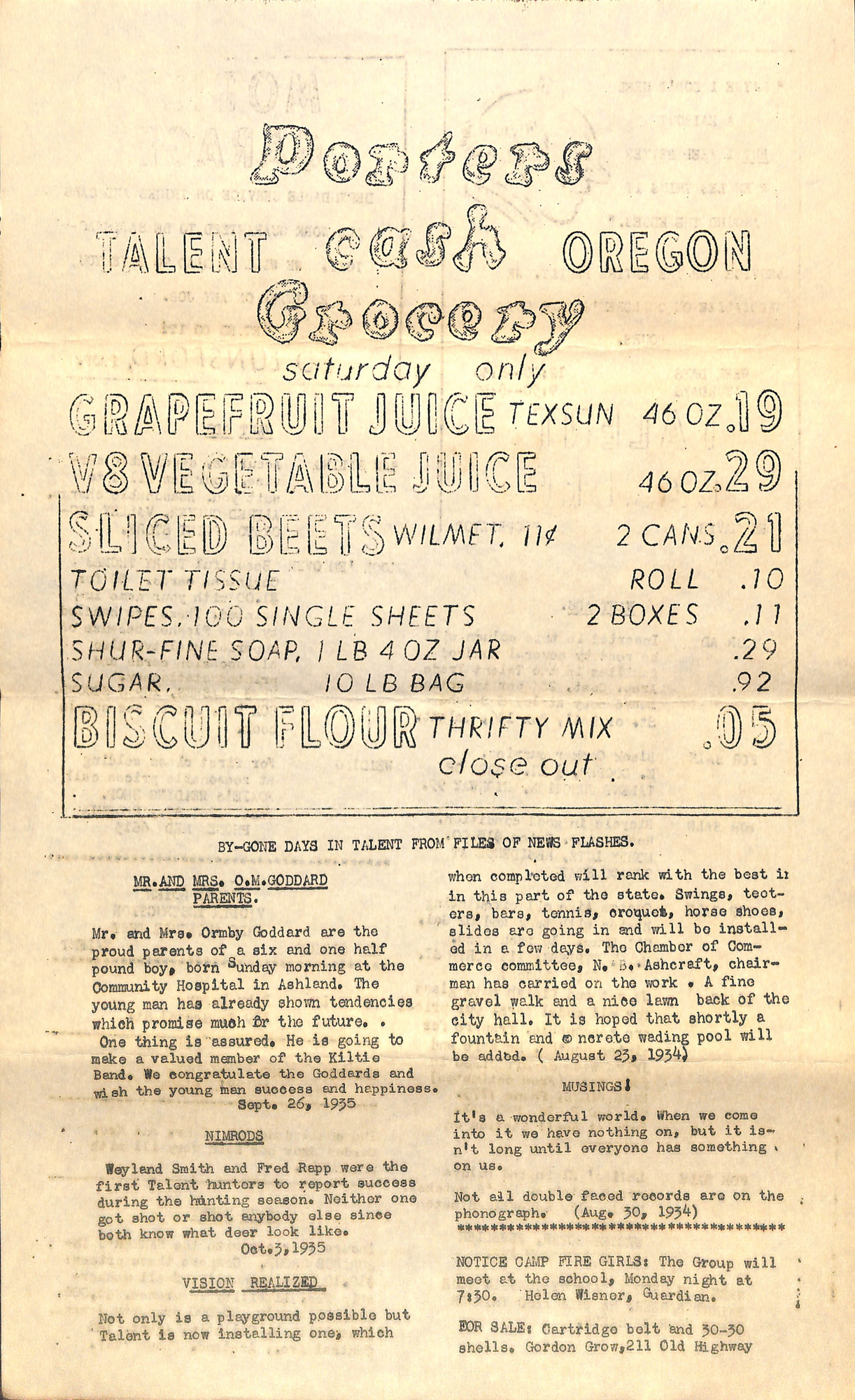 Mr. and Mrs. Ormy Goddard are the proud parents of a six and one-half pound boy, born Sunday morning at the Community Hospital in Ashland. The young man has already shown tendencies which promise much for the future. One thing is assured. He is going to make a valued member of the Kiltie Band. We congratulate the Goddards and wish the young man success and happiness. (Sept. 26, 1935) NIMRODS Wayland Smith and Fred Rapp were the first Talent hunters to report success during the hunting season. Neither one got shot or shot anybody else since both know what deer look like. (Oct. 3, 1935) VISION REALIZED Not only is a playground possible but Talent is now installing one, which when completed will rank with the best in this part of the state. Swings, teeters, bars, tennis, croquet, horse shoes, slides are going in and will be installed in a few days. The Chamber of Commerce committee, N. B. Ashcraft, chairman, has carried on the work. A fine gravel walk and a nice lawn back of city hall. It is hoped that shortly a fountain and concrete wading pool will be added. (August 23, 1934) MUSINGS! It's a wonderful world. When we come into it we have nothing on, but it isn't long until everyone has something on us. Not all double-faced records are on the phonograph. (Aug. 30, 1934) NOTICE CAMP FIRE GIRLS: The group will meet at the school, Monday night at 7:30. Helen Wisner, Guardian. FOR SALE: Cartridge belt and 30-30 shells. Gordon Grow, 211 Old Highway. WANT ADS.