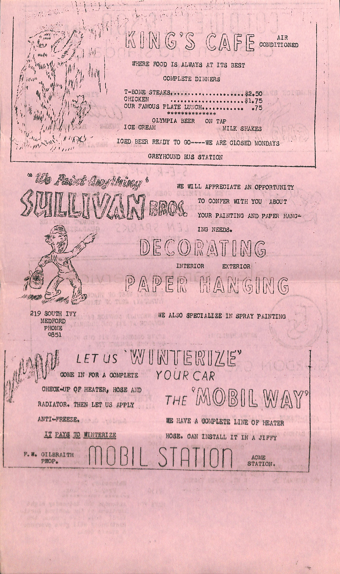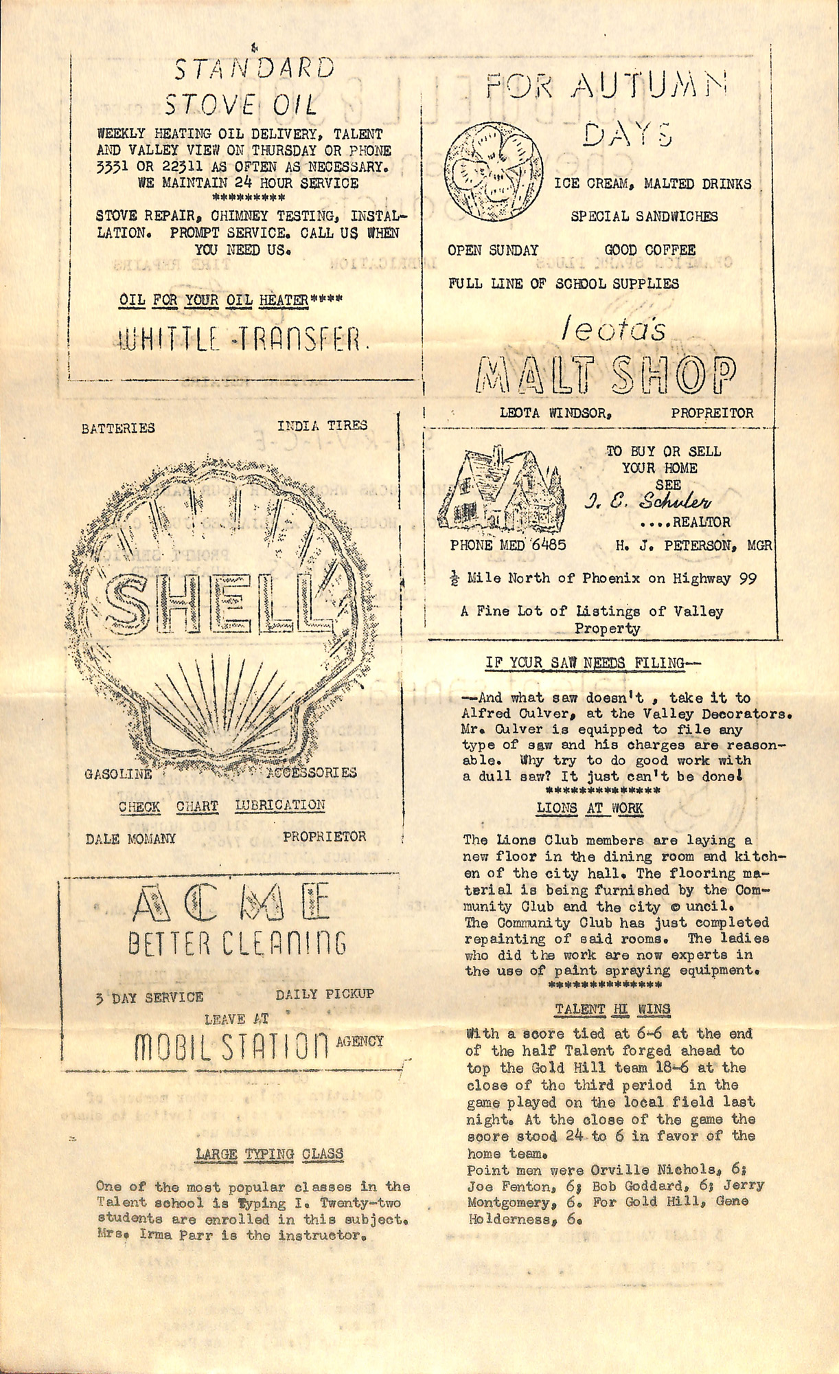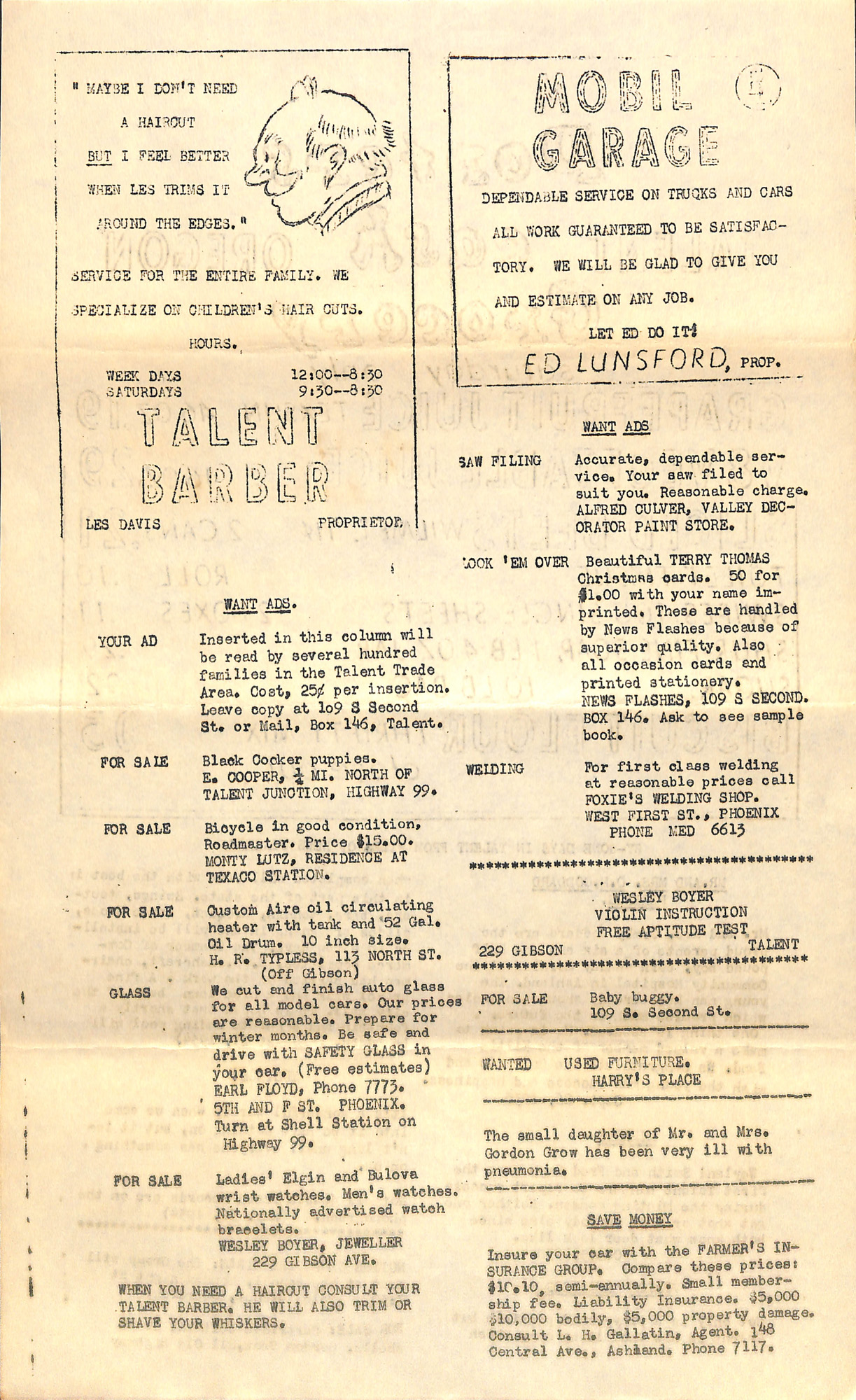 TRANSFERYOUR AD Inserted in this column will be read by several hundred families in the Talent trade area. Cost, 25¢ per insertion. Leave copy at 109 S. Second St., or Mail, Box 146, Talent. FOR SALE--Black Cocker puppies. E. COOPER, ¼ MI. NORTH OF TALENT JUNCTION, HIGHWAY 99. FOR SALE--Bicycle in good condition, Roadmaster. Price $15.00. MONTY LUTZ, RESIDENCE AT TEXACO STATION. FOR SALE--Custom Aire oil circulating heater with tank and 52 Gal. Oil Drum. 10 inch size. H. R. TYPLESS, 113 NORTH ST. (Off Gibson) GLASS--We cut and finish auto glass for all model cars. Our prices are reasonable. Prepare for winter months. Be safe and drive with SAFETY GLASS in your car. (Free estimates). EARL FLOYD, Phone 7773. 5TH AND F ST., PHOENIX. Turn at Shell Station on Highway 99. FOR SALE--Ladies' Elgin and Bulova wrist watches. Men's watches. Nationally advertised watch bracelets. WESLEY BOYER, JEWELER, 229 GIBSON AVE. WHEN YOU NEED A HAIRCUT CONSULT YOUR TALENT BARBER. HE WILL ALSO TRIM OR SHAVE YOUR WHISKERS. SAW FILING--Accurate, dependable service. Your saw filed to suit you. Reasonable charge. ALFRED CULVER, VALLEY DECORATOR PAINT STORE. LOOK 'EM OVER--Beautiful TERRY THOMAS Christmas cards. 50 for $1.00 with your name imprinted. These are handled by News Flashes because of superior quality. Also all-occasion cards and printed stationery. NEWS FLASHES, 109 S SECOND, BOX 146. Ask to see sample book. WELDING--For first-class welding at reasonable prices call FOXIE'S WELDING SHOP, WEST FIRST ST., PHOENIX. PHONE MED 6613 WESLEY BOYER--VIOLIN INSTRUCTION--FREE APTITUDE TEST, 229 GIBSON TALENT FOR SALE--Baby buggy. 109 S. Second St. WANTED--USED FURNITURE--HARRY'S PLACE The small daughter of Mr. and Mrs. Gordon Grow has been very ill with pneumonia. LEOTA'S MALT SHOP MOMANY SHELL STATION ACME CLEANING J. E. SCHULER, REALTOR LARGE TYPING CLASS One of the most popular classes in the Talent School is Typing I. Twenty-two students are enrolled in this subject. Mrs. Irma Parr is the instructor. IF YOUR SAW NEEDS FILING-- And what saw doesn't, take it to Alfred Culver, at the Valley Decorators. Mr. Culver is equipped to file any type of saw and his charges are reasonable. Why try to do good work with a dull saw? It just can't be done! LIONS AT WORK The Lions Club members are laying a new floor in the dining room and kitchen of the city hall. The flooring material is being furnished by the Community Club and the city council. The Community Club has just completed repainting of said rooms. The ladies who did the work are now experts in the use of paint spraying equipment. TALENT HIGH WINS With a score tied at 6-6 at the end of the half Talent forged ahead to top the Gold Hill team 18-6 at the close of the third period in the game played on the local field last night. At the close of the game the score stood 24-6 in favor of the home team. Point men were Orville Nichols, 6; Joe Fenton, 6; Bob Goddard, 6; Jerry Montgomery, 6. For Gold Hill, Gene Holderness, 6. -----------------------------------------------------------------------------