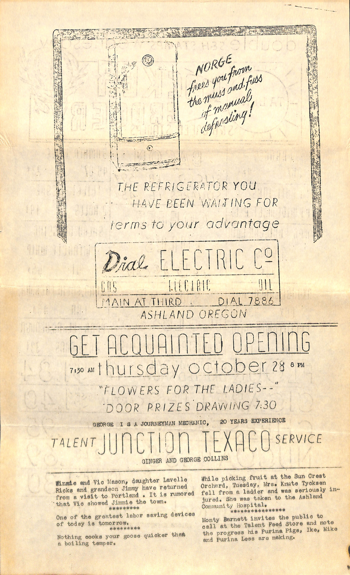 PARENT TEACHERS MEET. With Mrs. Lloyd Morris presiding in place of President Mrs. N.B. Ashcraft, the Parent-Teachers Association met Friday afternoon at the school auditorium. Reports of committees were heard. It was learned that 227 quarts of tomatoes had been canned for use of hot lunch department…THE CHAMBER OF COMMERCE is sponsoring another of its enjoyable dances Friday night of this week at the City Hall in Talent. The committee in charge has arranged for an increased orchestra and is planning some real surprises. TALENT COMING & GOING…Mr. and Mrs. Block of Oklahoma, parents of B.E. Block, came to Talent last week. They plan to make their home here this winter…Mrs. Harriet Bates and Mrs. Oeta Miller attended the Buymanship Meeting at Medford last week, also the Recreation Club meeting held in the Courthouse Wednesday…Mr. and Mrs. Scott MacLarnin of Boone, I., are visiting his sisters, Mrs. Opal Getzlaff of Ashland and Miss Mary MacLarnin of Talent. Talent News Flashes October 4, 1934, now lost. Reprinted in the October 9, 1959 News Flashes The Chamber of Commerce is sponsoring another of its enjoyable dances Friday night of this week at the City Hall in Talent. The committee in charge reports that it has arranged for an increased orchestra and is planning some real surprises. The dance is given as a benefit dance to clear up the unpaid bills incurred in the recently installed playground. The Talent Extension Unit will serve lunch. A jolly good time is anticipated. And this… FOR RENT Four-room unfurnished apartment, bath. Phoenix. $5.00 a month… RECEPTION Talent City Hall, Oct. 10, for the teachers of Talent. Everyone invited and urged to be present. PTA and Community Club auspices… PARENT TEACHERS MEET…with Mrs. Lloyd Morris presiding, in the absence of president Mrs. N. B. Ashcraft. The PTA met Friday afternoon at the school auditorium. Reports of committees were heard. It was learned that 227 quarts of tomatoes had been canned for use of hot lunch department… Mr. & Mrs. Block of Okla., parents of B.E. Block, came to Talent last week. They plan to spend the winter. Mr. and Mrs. Tom Cook of Foss Rd have moved to Medford. THRU THE KEYHOLE. We hear that our old Talent politician Ellsworth Lee Garland and Carolyn Young of Wagner Creek were married in a neighboring state recently…. The hunters are returning from near and far with and without their deer rearming themselves and hieing out to the mountains with loads of double-wrapped bread and other supplies to get two buck with one bullet…Ho for the life of the nimrod or is that a fisherman….Did anyone ever find out who was running for office in a recent item in the Regional News in the Medford Mail Tribune…An item of interest to all Jackson Co. people is the 'O&C' raid…Taxpayers had better look into this….Mr. and Mrs. Garrett's new home on the corner of Beeson Lane and Hendricks Rd. is nearly completed…Beautiful, too….The Don Montgomerys are completing work on their new carport, fruit room and patio addition to their home…Mabel Moore is teaching kindergarten in Phoenix…Thelma Fleshman of Roseburg was a visitor at the Mae Lowe home Saturday….Doreen Feeler and daughters Teresa and Linda returned to their home in Klamath Falls Wednesday….Mr. and Mrs. Lucky Steiger have moved their house in preparation for the new freeway….Chas. Tuggle and son Jackie returned from hunting in Eastern Oregon….Margaret Woods was elected Yell Queen for the Talent Jr. High….FOR BEST RESULTS ADVERTISE IN THE TALENT NEWS FLASHES…PATRONIZE YOUR LOCAL MERCHANTS…THEY SUPPORT YOU. Talent News Flashes October 4, 1934, now lost. Reprinted in the October 7, 1960 News Flashes -----------------------------------------------------------------------------