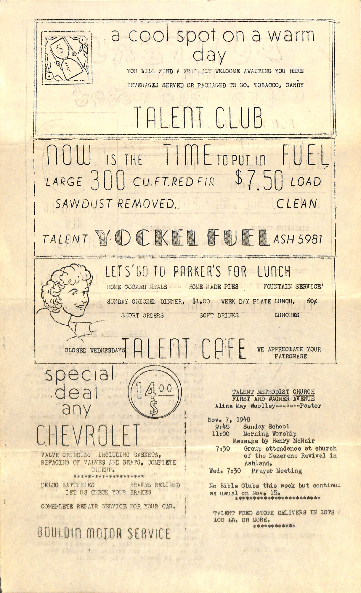 YOCKEL FUEL PARKER'S TALENT CAFÉ BOULDIN MOTOR SERVICE TALENT METHODIST CHURCH FIRST AND WAGNER AVENUE Alice May Woolley--Pastor Nov. 7, 1948 9:45--Sunday School 11:00--Morning Worship; Message by Henry McNair 7:30--Group attendance at church of the Nazarene Revival in Ashland. Wed. 7:30--Prayer Meeting No Bible Clubs this week but continue as usual on Nov. 15. TALENT FEED STORE DELIVERS IN LOTS 100 LB. OR MORE. LOOKING BACK, ETC. Why didn't you pick up some of that 14 to 1 money that was being offered on Dewey last week? One conclusion we have drawn. Straw votes in advance are n.g. Men will tell you whether they prefer brunettes or blonds, what they think of their neighbors and mother-in-laws, whether they like their toast brown or black. BUT a large minority won't tell you how they are going to vote. Our little neighbor to the south has terminated a tumultuous campaign in which many naughty words were uttered and charges made. As neutral onlookers the people of Talent trust that the wounds of battle will heal without infection, that the city park will be restored to its former cleanliness and beauty, that the lithia water supply will be restored and made more attractive and that the weeds will be dug out of the parking strips. The people of Talent have a kindly affection for Ashland tho' we disagree when we are told by the Ashland press that Ashland is the logical trade center for Talent. Our school district will soon be faced with the decision as to how we will handle the school housing situation. It is the duty of every taxpayer and parent to inform himself fully on the condition prevailing. The board is calling a meeting to give information and permit discussion. It should be well attended. PERSONALIZED CHRISTMAS