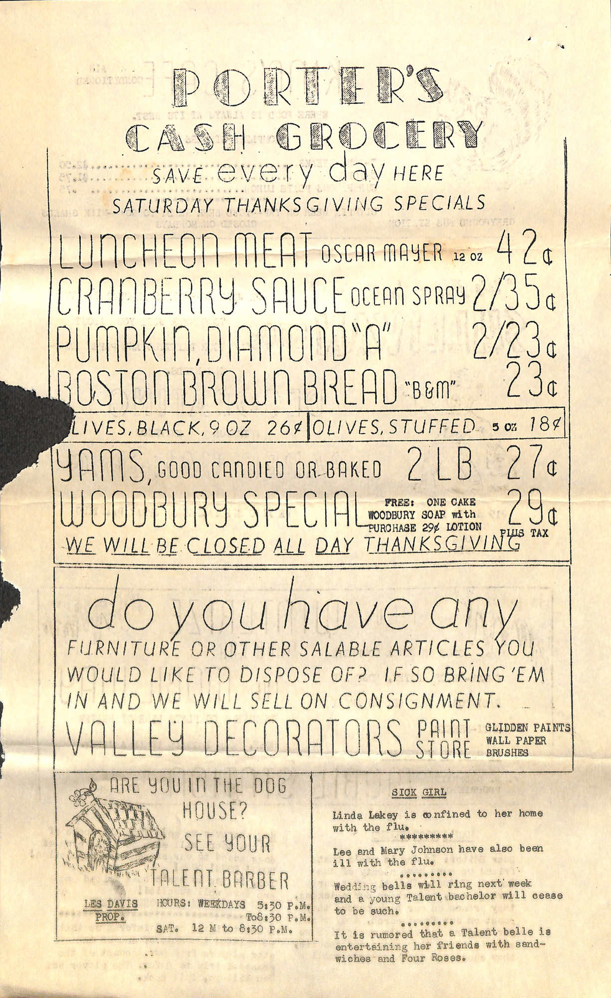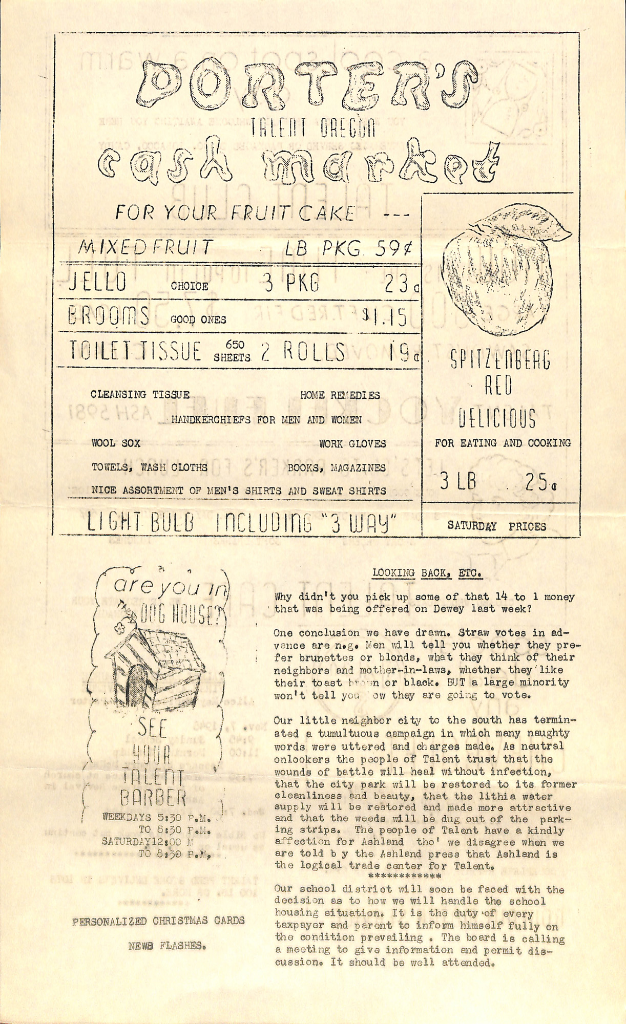 NO NEWS FLASHES NEXT WEEK We are suspending publication for one week, anticipating turkey and trimmin's with some of our folks in Portland. Our wish is that our readers will have as pleasant a time as we are anticipating. ALL TALENT CLOSED TURKEY DAY. All the stores and business houses of Talent will be closed next Thursday. Even the cafes will not open. So get your supplies before Thursday morning. The merchants will display some attractive buys during the early part of the week. The Texaco station will be open a part of the Thanksgiving morning for emergency service. DISCUSS BUILDING On last Monday evening the parents and taxpayers of Dist. 22 met at the school gymnasium at the request of the school board. Chairman A. W. Wisner presided at the meeting and gave an able summary of the housing situation in the Talent school. At present classes are being held in three basement rooms, the gymnasium, and the Methodist church. From present trend in population more room will be needed soon. The Talent School has been conditionally standardized for the present year by the state board of education pursuant to a program of improvement recently submitted by the local board. Continued receipt of funds from the Basic School Support is contingent upon the execution of this program. The meeting was not well attended but those who were present showed a serious interest in the problem which confronts our school district. MRS. ALICE GUNZELL [article cut off] DONATIONS BY V.F.W. The Veterans of Foreign Wars has donated the sum of $100.00 to the city playground fund and $50.00 to the Crater Lake Campfire Girls. The Campfire Girls have been sponsored by the V.F.W. and Auxiliary since the girls organized. MANY CHESTS EXAMINED The X-ray Unit which gave free service Monday was patronized by 399 from the Talent and Phoenix communities. It is reported that this was the largest number of persons examined in one day since the establishment of the service. Local ladies assisting with the work were Gertrude Ottinger, Nancy Jennings, Winnie Mason, Louvella Long, Alice Burnette, Clarabelle Bunnell and Grace Barnes. Nancy Jennings of the P.T.A. and Gertrude Ottinger of the Community Club wish to thank those who assisted. DUFUR BOWS TO TALENT The Talent High six-man football team played Dufur Saturday night at the Dalles and won the state quarter-final skirmish by a score of 46 to 26. With the victory comes the opportunity of Talent to play in the semi-finals for state honors. The next game will be played in either Ashland or Medford the coming weekend. Talent's opponents have not yet been determined. ABOUT TOWN Mrs. Harold Straus was taken to the Community Hospital in Medford, Wednesday where she underwent an operation. Word has been received from Sgt. Harland Lowe that he arrived in England after [cut off] Page 2, full-page ad for: TALENT MARKET Page 3, ads for: PORTER'S CASH GROCERY VALLEY DECORATORS TALENT BARBER SICK GIRL Linda Lakey is confined to her home with the flu. Lee and Mary Johnson have also been ill with the flu. Wedding bells will ring next week and a young Talent bachelor will cease to be such. It is rumored that a Talent belle is entertaining her friends with sandwiches and Four Roses. MAN'S BEST FRIEND Dear Editor: If dog is man's best friend we sure have plenty of the same in Talent. They tip over our garbage can, they chase our chickens, they prance on our back porch, they roost on our front porch, they wash our fenders and wheels every time we stop in town, they chase our rabbits, they chase one another--we smell dog wherever we go! From the looks of things there will soon be a new crop of dogs added to our present dog population! DOGS! DOGS! DOGS! Yes, if dog is man's best friend we are darn well supplied! A