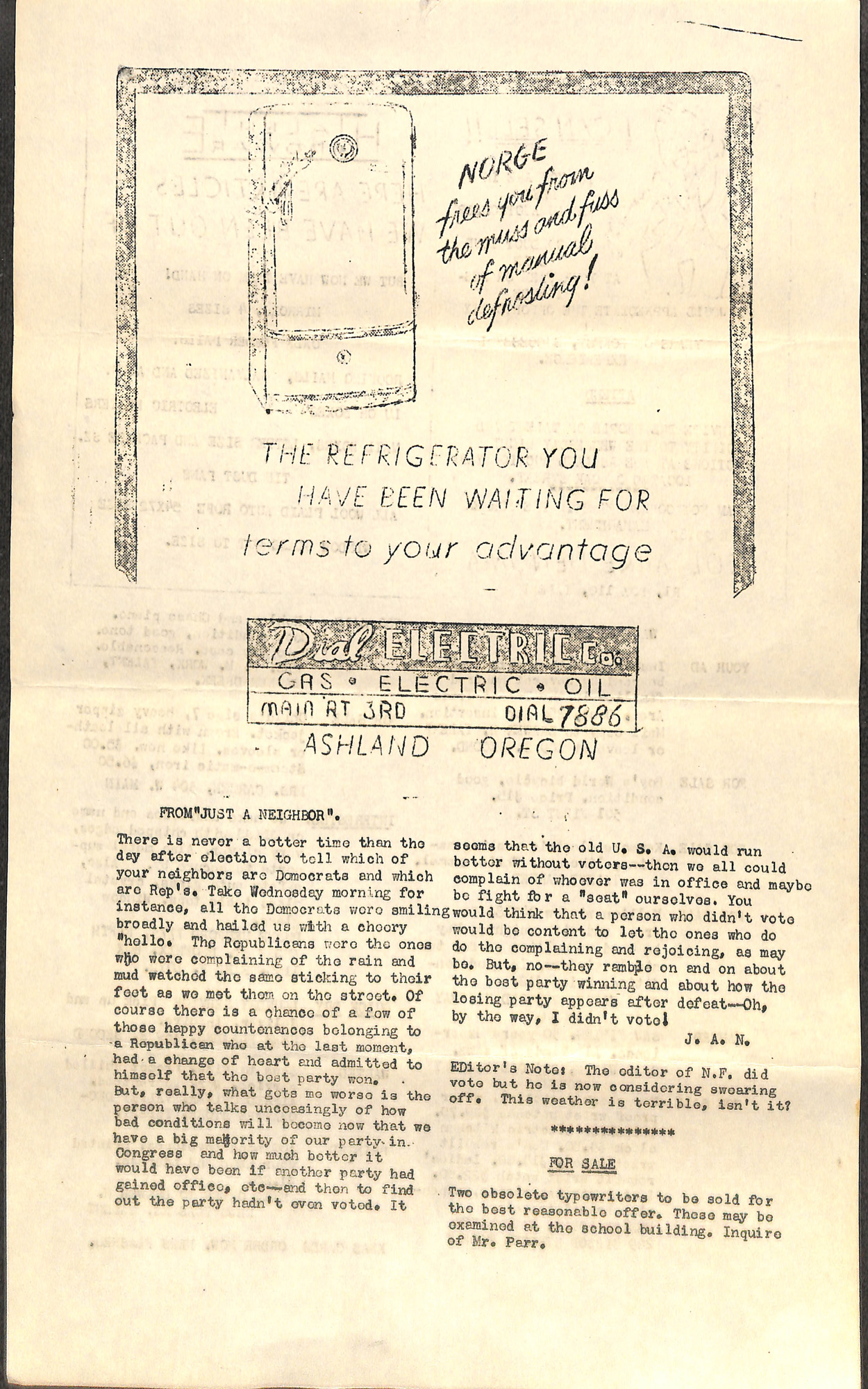 There is never a better time than the day after election to tell which of your neighbors are Democrats and which are Reps. Take Wednesday morning for instance, all the Democrats were smiling broadly and hailed us with a cheery "hello." The Republicans were the ones who were complaining of the rain and mud, watched the same sticking to their feet as we met them on the street. Of course there is a chance of a few of these happy countenances belonging to a Republican who at the last moment had a change of heart and admitted to himself that the best party won. But, really, what gets me worse is the person who talks unceasingly of how bad conditions will become now that we have a big majority of our party in Congress and how much better it would have been if another party had gained office, etc.--and then to find out the party hadn't even voted. It seems that the old U.S.A. would run better without voters--then we all could complain of whoever was in office and maybe be fight for a "seat" ourselves. You would think that a person who didn't vote would be content to let the ones who do do the complaining and rejoicing, as may be. But, no--they ramble on and on about the best party winning and shout how the losing party appears after defeat--Oh, by the way, I didn't vote!--J.A.N. Editor's Note: The editor of N.F. did vote but he is now considering swearing off. This weather is terrible, isn't it? FOR SALE Two obsolete typewriters to be sold for the best reasonable offer. Those may be examined at the school building. Inquire of Mr. Parr. WANT ADS. YOUR AD--Inserted in this column will be read by several hundred families in the Talent trade area. Cost, 25¢ per insertion. Mail copy to DRAWER H, TALENT or leave at 109 S. SECOND. FOR SALE--Boy's World Bicycle, good condition. Price $15. 301 FIRST ST. FOR SALE--Kenmore electric washing machine, like new. White enamel. TALENT MARKET. FOR SALE--Mullion window 24x28. In frame and with weights. May be used as mullion or for two single windows. In good condition. Price $12. GUST WITTE, 223 OLD HIGHWAY SOUTH. WANTED--SAW FILING. 30 years experience. All kinds of saws. GUST WITTE, 223 OLD HIGHWAY SOUTH FOR SALE--New shock resisting, waterproof wrist watches $29.75. Telechron electric kitchen clock $4.50. Men's rebuilt wrist watch, $15.00. Ladies' rebuilt wrist watch $22.50. Leather straps, chains, expansion bracelets, etc. WESLEY BOYER, WATCHMAKER 229 GIBSON STREET, TALENT FOR SALE--Kohler and Chase piano. Good condition, good tone. Mahogany case. Reasonable. MRS. H. M. WORK, TALENT, WAGNER CREEK. FOR SALE--Child's size 7, heavy zipper jacket. Brown with all leather sleeves. Like new. $5.00. Steam-o-matic iron, $6.50. MRS. CARMEN, 304 W. MAIN. INTERESTED?--We make addresses and name on GLASS with chipped edges, very clever. Also metal supports to secure by. Also, safety auto glass, crystal glass table tops. Window glass. PHONE MEDFORD 7773, FIFTH AND F ST. PHOENIX. BOX 1165. EARL FLOYD. QUICK DRY--LAUNDRY SERVICE. Pick up and deliver. Inquire. NEWS FLASHES, 109 S. SECOND WANTED--Saws to file. Prompt skilled service. Work guaranteed. ALFRED CULVER, VALLEY DECORATORS STORE, TALENT. PRINTED--100 bond envelopes, printed your name and address. $1.25. MAIL ORDER TO DRAWER H. NEWS FLASHES, TALENT XMAS CARDS--ORDER NOW. NEWS FLASHES. -----------------------------------------------------------------------------
