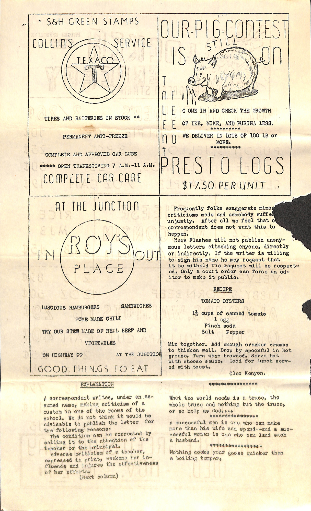A sweet little co-ed informs us that we omitted the name of one of the star players from our account of the proposed trip to Dufur. The player was Don Millage, fullback. EXPLANATION A correspondent writes, under an assumed name, making criticism of a custom in one of the rooms of the school. We do not think it would be advisable to publish the letter for the following reasons: The condition can be corrected by calling it to the attention of the teacher of the principal. Adverse criticism of a teacher, expressed in print, weakens her influence and injures the effectiveness of her efforts. Frequently folks exaggerate minor criticism made and somebody suffers unjustly. After all we feel that our correspondent does not want this to happen. News Flashes will not publish anonymous letters attacking anyone, directly or indirectly. If the writer is willing to sign his name he may request that it be withheld. His request will be respected. Only a court order can force an editor to make it public. RECIPE TOMATO OYSTERS 1½ cups of canned tomato 1 egg Pinch soda Salt Pepper Mix together. Add enough cracker crumbs to thicken well. Drop by spoonful in hot grease. Turn when browned. Serve hot with cheese sauce. Good for lunch served with toast. Cleo