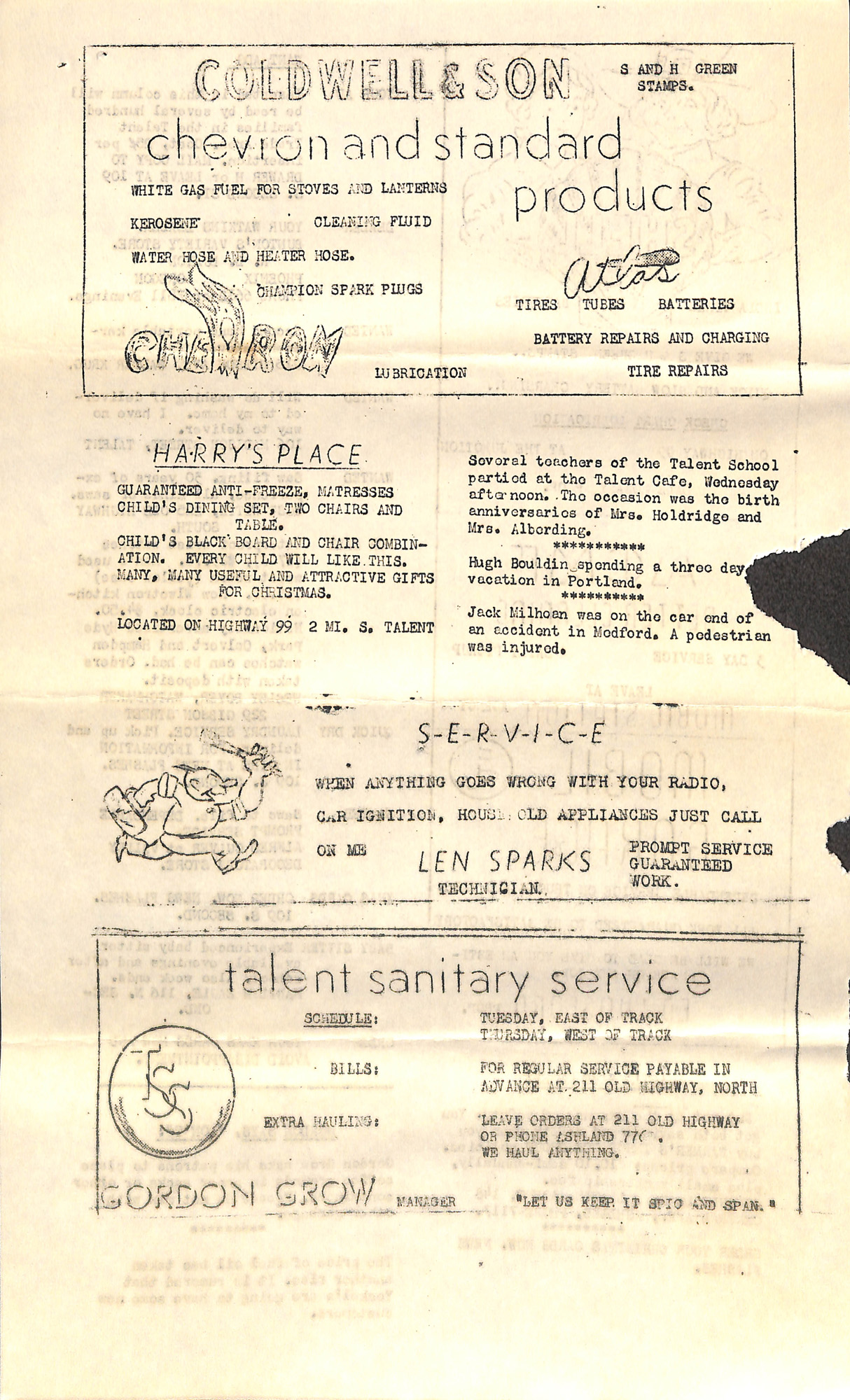 What the world needs is a truce, the whole truce and nothing but the truce, or so help us God… A successful man is one who can make more than his wife can spend--and a successful woman is one who can land such a husband. Nothing cooks your goose quicker than a boiling temper. Page 6, full-page ad for: TALENT LOCKER GROCERY Page 7, ads for: COLDWELL & SON CHEVRON HARRY'S PLACE LEN SPARKS ELECTRICAL TECHNICIAN TALENT SANITARY SERVICE Several teachers of the Talent School partied at the Talent Café, Wednesday afternoon. The occasion was the birth anniversaries of Mrs. Holdridge and Mrs. Alberding. Hugh Bouldin spending a three-day vacation in Portland. Jack Milhoan was on the car end of an accident in Medford. A pedestrian was injured. Page 8, ads for: MOMANY SHELL STATION ACME BETTER CLEANING LUNSFORD MOBIL GARAGE FARMER'S INSURANCE GROUP ORDER YOUR CHRISTMAS