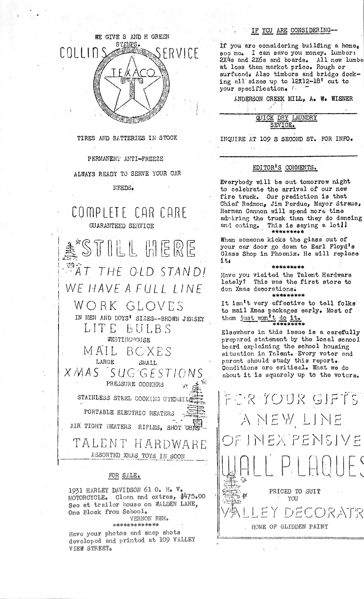 EDITOR'S COMMENTS. Everybody will be out tomorrow night to celebrate the arrival of our new fire truck. Our prediction is that Chief Redmon, Jim Perdue, Mayor Straus, Herman Cannon will spend more time admiring the truck than they do dancing and eating. This is saying a lot!! When someone kicks the glass out of your car door go down to Earl Floyd's Glass Shop in Phoenix. He will replace it. Have you visited the Talent Hardware lately? This was the first store to don Xmas decorations. It isn't very effective to tell folks to mail Xmas packages early. Most of them just won't do it. Elsewhere in this issue is a carefully prepared statement by the local school board explaining the school housing situation in Talent. Every voter and parent should study this report. Conditions are critical. What we do about it is squarely up to the voters. ABOUT THOSE SCHOOL BONDS A MESSAGE TO THE VOTERS OF TALENT SCHOOL DISTRICT #22 As you probably know, there will be an election on December 15th to decide whether bonds of the Talent School District, in the amount of $92,000, shall be issued for the purpose of constructing and equipping a building of six rooms for elementary grades. Your school board feels the importance of this election so strongly that they take this method of reminding the voters, and of answering some questions that have risen. 1. WHY BUILD AT ALL? Some provision must be made to take care of the present overcrowded conditions. We have one class in an entirely inadequate room in the gymnasium. One class is held in a neighboring church building, remote from the school, and requiring that the children cross the road. Three classrooms are in substandard basement quarters. In all, we need five additional rooms to care for the present enrollment. Future enrollment may be expected to be higher, in accordance with the current trend of population growth in this neighborhood and throughout the valley. This will require still larger quarters. Finally, the State Department of Education has declared our building only conditionally standard, and has agreed to continue the school even in that provisional classification only because your board has proposed the new building. If the State Department should finally declare our school substandard, we should lose state funds to the amount of approximately $25,000, which is far more than the annual cost of interest and annual payment of principal on the proposed bonds. For those reasons, your board believes the building, and the issuance of bonds to pay for it, to be absolutely necessary. 2. HOW WERE THE SIZE OF THE BUILDING AND THE AMOUNT OF THE BOND ISSUE DETERMINED? The building must be as large as possible in view of the probable growth of the school. It is estimated that the six rooms will be required within one or at most two years. The size however, is limited by the funds that can be obtained. $92,000 is almost exactly 10% of the assessed valuation of the district, and 10% in bonds is the limit allowed by the law. The architect believes that this sum will just about cover the building planned and its equipment. It is the intention of the board, if the bonds are voted, not to issue any beyond what may be needed for the stated purposes. 3. WHY IS IT IMPORTANT TO ACT AT ONCE? The building is urgently needed now, and if it is not ready by next September the need will be an emergency. Under present law, the authority to issue bonds up to !0% of the assessed valuation expires on July 1, 1949. If we delay, we can, after that date, issue bonds only up to 5%, and the sum of $46,000 would be altogether inadequate for the building. 4. WHY AN ELEMENTARY RATHER THAN A HIGH SCHOOL BUILDING? The quarters now occupied by the high school, while far from satisfactory, serve fairly well for those grades. They would not serve equally well for elementary grades. Certain small rooms that will take care of small classes in the high school would be of no value for elementary classes. Further, the cost per unit of a high school building is greater than that of an elementary building, to say nothing of the expense of converting present high school rooms to elementary school uses. It has been suggested that the purpose of the board in preferring a new elementary building to a new high school building is to do away with our high school by consolidation with some other district, or by becoming a non-high school district. This is not the case. In the first place, the board has formed no policy with respect to such a change. In the second place, any such change would need to be voted by the citizens, and could not be imposed by this or any later bond. But if the question of a consolidation should at any time arise, it would seem better that the voters should have a free choice, for or against, rather than that they should be so committed, by previous building, as to have no such choice. This election is an important matter. It concerns the welfare of your children and your neighbors' children. Your board hopes that every voter will cast his or her ballot. TIME: