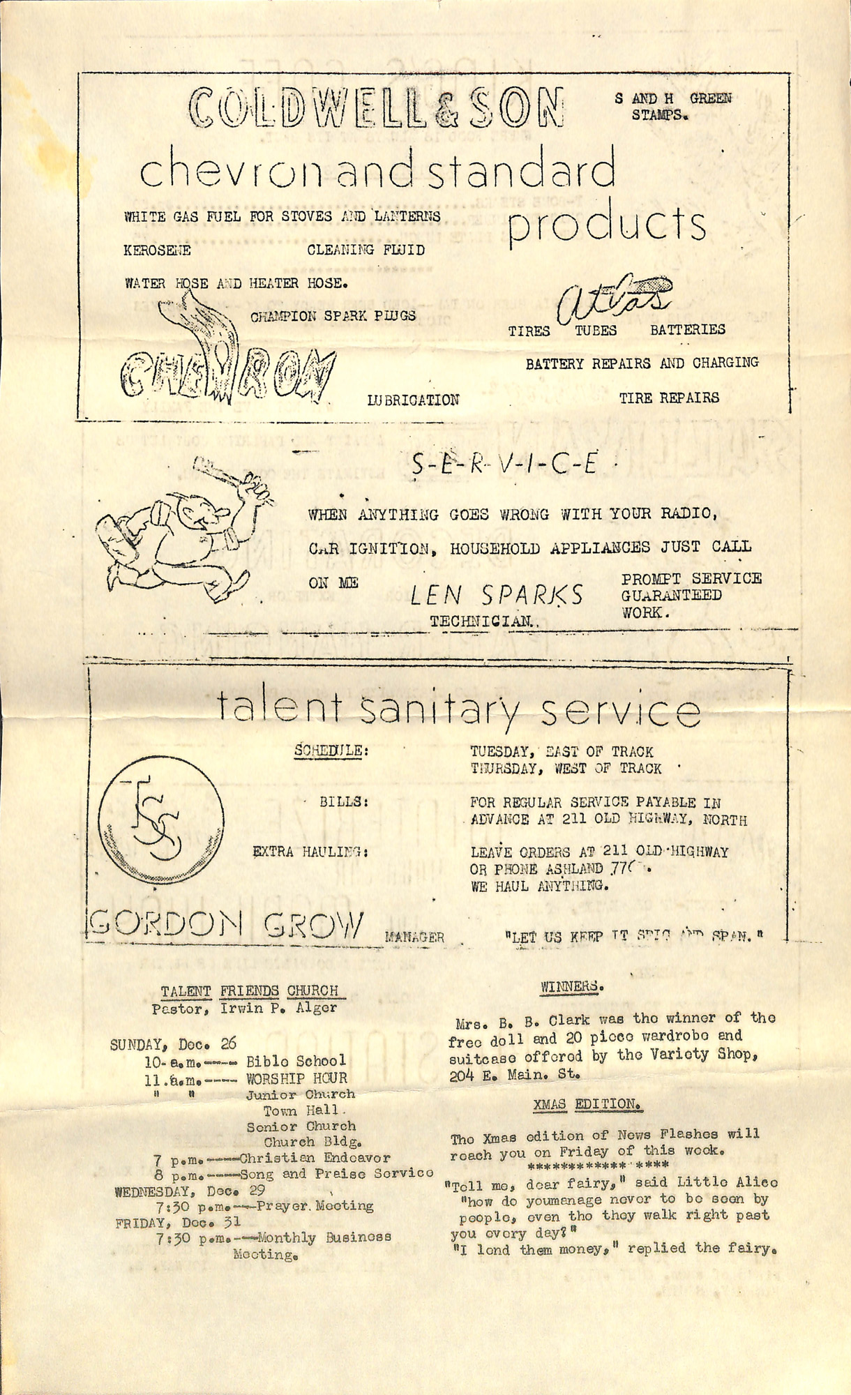 FOR LADY OF YOUR CHOICELet us make your pictures. Developing, Printing, Enlarging, Reasonable Rates. McDOWELL, 109 VALLEY VIEW ST. WANTED SAW FILING 30 years experience, all kinds of saws. GUST WITTE, 225 OLD HIGHWAY, SOUTH. BEAUTIFUL HAND MADE EARRINGS FOR XMAS. TALENT HARDWARE 1940 FOUR DOOR SEDAN. GOOD CONDITION. BILL BREESE, 237 OLD HIGHWAY, S. Page 4, ads for: COLDWELL & SON LEN SPARKS ELECTRICAL TECHNICIAN TALENT SANITARY SERVICE TALENT FRIENDS CHURCH Pastor, Irwin P. Alger SUNDAY, Dec. 26 10 a.m.--Bible School 11: a.m.--WORSHIP HOUR 11 a.m.--Junior Church, Town Hall; Senior Church, Church Bldg. 7 p.m.--Christian Endeavor 8 p.m.--Song and Praise Service WEDNESDAY, Dec. 29 7:30 p.m.--Prayer Meeting FRIDAY, Dec. 31 7:30 p.m.--Monthly Business Meeting WINNERS. Mrs. B. B. Clark was the winner of the free doll and 20 piece wardrobe and suitcase offered by the Variety Shop, 204 E. Main St. XMAS EDITION. The Xmas edition of News Flashes will reach you on Friday of this week. "Tell me, dear fairy," said little Alice, "how to you manage never to be seen by people, even tho they walk right past you every day?" "I lend them money," replied the fairy. -----------------------------------------------------------------------------
