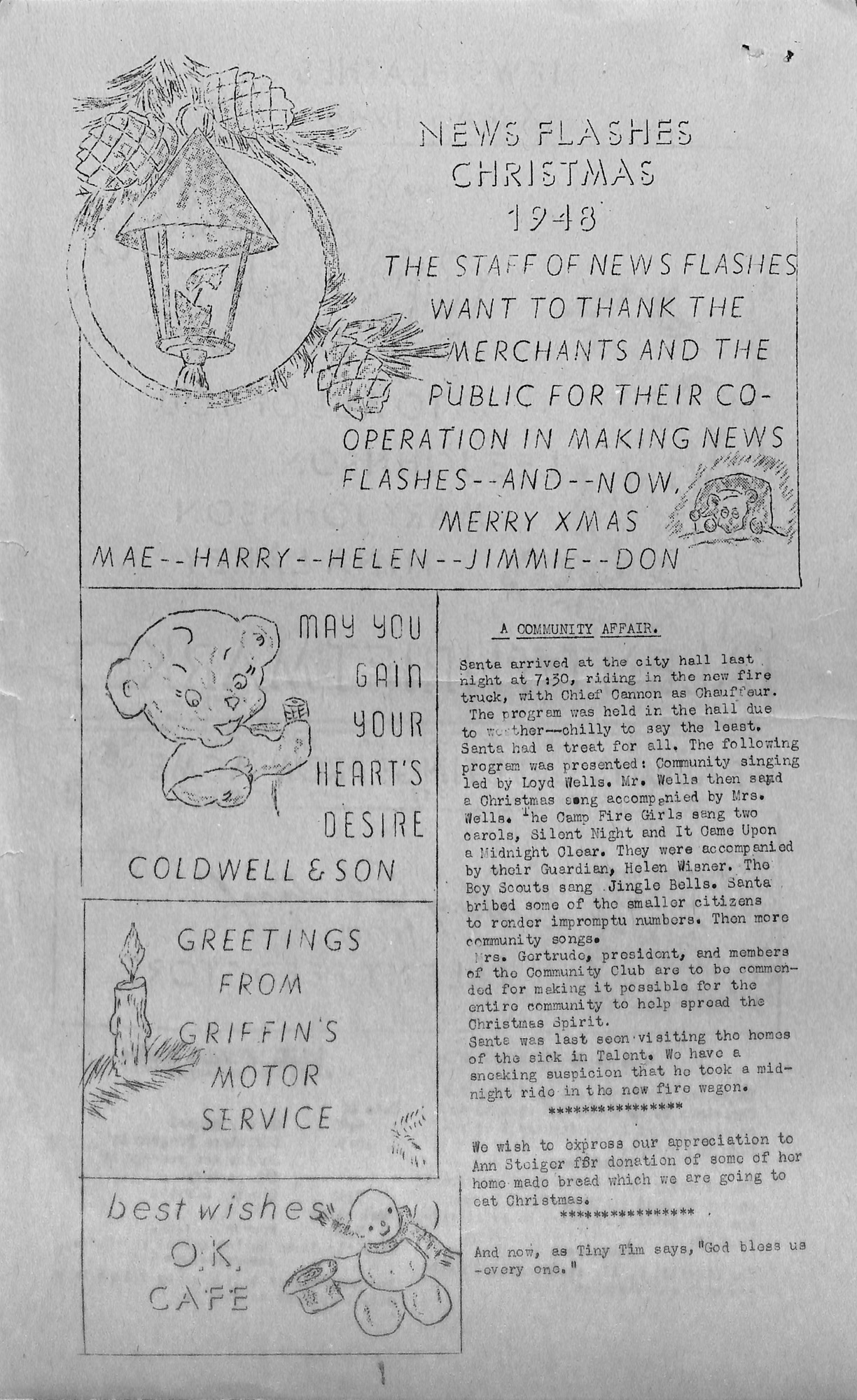 Mae--Harry--Helen--Jimmie - Don A COMMUNITY AFFAIR. Santa arrived at the city hall last night at 7:30, riding in the new fire truck, with Chief Cannon as Chauffeur. The program was held in the hall due to weather--chilly to say the least. Santa had a treat for all. The following program was presented: Community singing led by Lloyd Wells. Mr. Wells then sang a Christmas song accompanied by Mrs. Wells. The Camp Fire Girls sang two carols, Silent Night and It Came Upon a Midnight Clear. They were accompanied by their Guardian, Helen Wisner. The Boy Scouts sang Jingle Bells. Santa bribed some of the smaller citizens to render impromptu numbers. Then more community songs. Mrs. Gertrude, president, and members of the Community Club are to be commended for making it possible for the entire community to help spread the Christmas Spirit. Santa was last seen visiting the homes of the sick in Talent. We have a sneaking suspicion that he took a midnight ride in the new fire wagon. We wish to express our appreciation to Ann Steiger for donation of some of her homemade bread which we are going to eat Christmas And now, as Tiny Tim says, “God bless us--every one.” MRS. C. W. HOLDRIDGE SAYS: Those who have not sent any money for Christmas T.B. Seals and wish to do so please send in by January 1 or return the stamps. The plumbing at the city hall was frozen due to cold weather. Chief Redmon has been putting in extra hours repairing same. The Linville family is spending Christmas with relatives at Bend. TALENT METHODIST CHURCH.