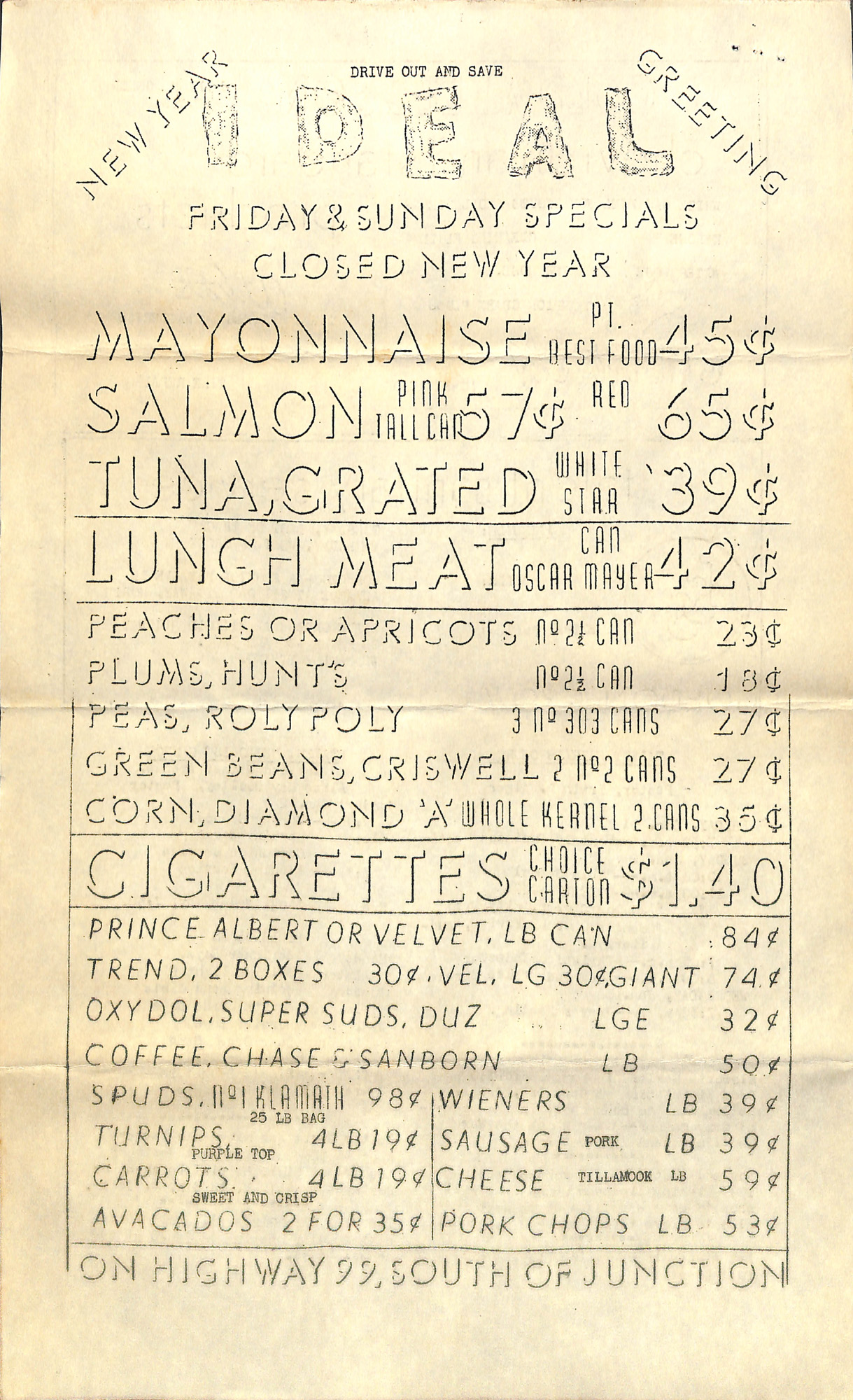 1st and Wagner Avenue. Alice May Woolley, Pastor Sunday Jan. 2 9:45--Sunday School. 11:00 Morning Worship; Communion Service 7:30--Evening Service Prayer Meeting, Wednesday, 7:30. BIBLE CLUBS Monday--Beginner Boys. Later--Shining Light Girls Tuesday--Helping Hand Girls Later--Fourth Grade Boys Wed.--Booster Boys Later--Bear Creek Gang Thurs.--Beginner Girls Later--King's Daughters Thurs. 7:30--Young People. Lester Davis has moved his barber shop to the building just north of the Talent Club. He will be open for business from 12 M. to 8 P.M. daily. The Camp Fire Girls will hold their next regular meeting on Jan. 5 at the school house. Page 8, full-page ad for: IDEAL MARKET Page 9, ads for: SHELL STATION (HELEN & DALE) ACME BETTER CLEANING LUNSFORD MOBIL GARAGE MOON FIX-IT SHOP