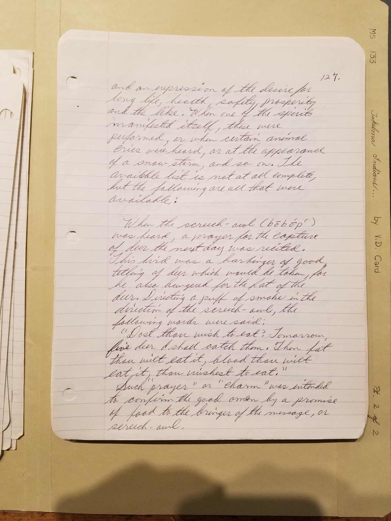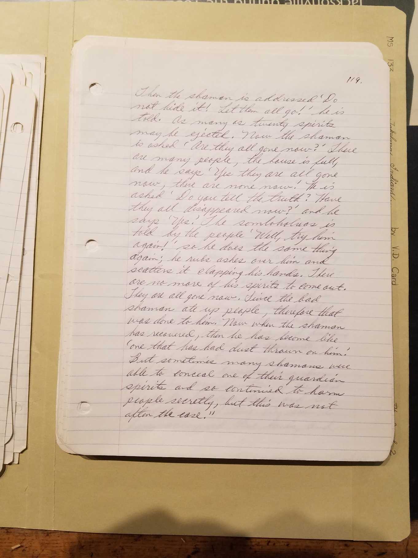 spirit, before Daldal made it into a spirit creature, the great mountain[Page 163] was fire on top. Then the people were cold, they had no fire, only the mountain had fire. Then Coyote asked other beings to help him get fire for the people. Now he set his helpers in the woods here and here and here, all the way to the mountain he set his helpers. Then he went to the great mountain and waited. Then the wind blew hard and the ground shook and fire was blown out of the mountain. Then Coyote caught fire and ran down the mountain with it but his tail was caught and burned some. That is why his tail is a little white now. Then he threw it to Wolf who ran with it and threw it to Beaver who ran with it and threw it to to Squirrel. That person put it on his neck and jumped from tree to tree and it scorched his neck so that place is scorched even to this day. Thus fire was passed along until it came to the people who gave some to the trees. That is why fire can be called forth from tree limbs today. [In fire-twirler, making fire by rubbing sticks, etc.] [Page 164]