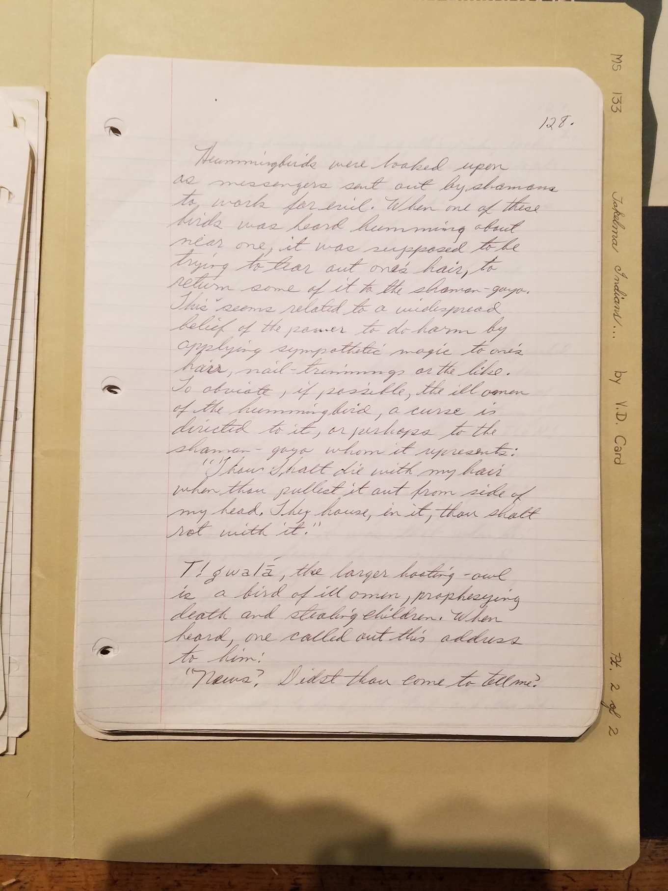 stole the girl and [Page 142] took her with him. Then, tis said, a stone he took up and put into her and into his own house he came with her. The girl was pregnant and gave birth to a child. Then Coyote missed his girl. He looked for her but found only her skirt by the water. Then he became a mourner. Before, Coyote always killed big deer, but now he could only kill fawns, and he was as a slave. Coyote did not know where his daughter had been taken away. Now the child was born and it grew. Now he became big. His mother told him "your maternal grandparents are living up the river." Then he traveled about in his canoe. "Mother, I shall go to see my maternal grandparents." Tis far away she said. There I will go he replied. You will be lost she said. I shall go! What is their appearance? "He is red-eared, sharp-clawed, [Card 143] sharp nose, and red in his ears. Your grandmother has a long neck." Rock Boy had become big. He paddled a canoe off up the stream. He sang "As Otter's boy, I wander about." Over a house he walked, "tul, tul, tul." Who is on top of the graveyard house? someone said. Is that a graveyard house? he asked. Look inside they said. Inside he looked and was hit, his nose was scratched and became full of blood. Then he went in the house and hit and whipped the people. He demanded and got dentalia for that injury, and when he had got it he made all the people to be well again. He took up water and blew it upon them and made them well. Then he went off up the stream and soon this all happened again, and he was hit and he hit the people and got dentalia then blew water upon them and made them well again. Then he went on, singing. And [Page 144] night came, but then he thought he had found his maternal grandparents. He was hungry, he looked for food and he found acorn mush and ate it. Then he awakened the people. It must be Wolf's children she said. And when Coyote was awake, Rock Boy said "I am hungry, go and hunt, I desire venison fat." Coyote could no longer kill big deer but only fawns. And Wolf's wife kept stealing Coyote's wife's food. And Rock Boy beat her then, and killed all the women. Coyote only had a fawn. When they came the women said "he has whipped us all." And Rock Boy was hard and he beat all the Women of Wolf and their husbands. Then he went down river again, to his mother, and he told her how Wolf had enslaved all her Coyote people, taking their food and firewood. So Rock Boy's mother, Coyote's daughter, went to her father, and [Page 145] her husband too, with a canoe ful of salmon. Coyote was very happy when he saw them, and their daughter returned, and Rock Boy had killed all the Wolf people.