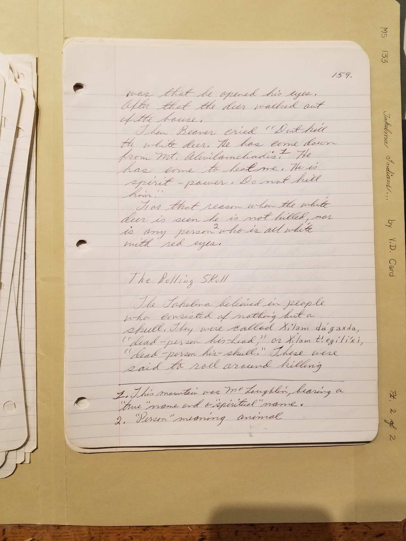 "Beaver is dead."Now the people were driving in the deer and there was one white deer without any color on him. [All abino animals were sacred to the Takelma.] His tail was white and his shoes. All was white but his eyes were pink. And then the white deer walked in the house of Beaver. There he stood and looked at Beaver. Now Beaver was dead but it then [Page 159] was that he opened his eyes. After that the deer walked out of the house. Then Beaver cried "Don't kill the white deer. He has come down from Mt. Alwilamchadis [this mountain was McLoughlin, bearing a "true name and a "spiritual" name.] He has come to heal me. He is a spirit-power. Do not kill him." For that reason when the white deer is seen he is not killed, nor is any person who is all white with red eyes. ["Person" meaning animal.]