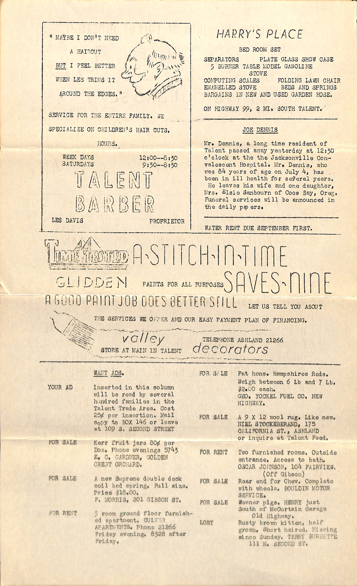 News Flashes EVERYBODY READS NEWS FLASHES VOLUME X NO. 39 SEPT. 24, 1948 NOMINEES FOR CITY OFFICE As a result of two nominating caucuses Talent has a group of nominees of record breaking proportion. MAYOR Harold Straus John Childers RECORDER Dave Block, Mrs. Teeter, Mrs. Dale Momany. TREASURER Frank Manness COUNCILMEN Ada Bouldin, Clarence Walden, Fred Van Dyke, Rudy Conner, Lucky Gilbreath, Chas. Long, Bob Logan, Roy Coghill, Leslie Mason, Joe Hosich, Loran Casebier, Ira Culver, Forrest Jennings, John Sample, Roy McGarety, Wayne Cowdrey. THREE GRANGES TIE In the Fall Harvest Festival Jubilee Talent, Bellview and Phoenix tied for first place for best display. Clarence Holdridge won fourth on his individual display. TALENT R.F.D.--OCT. 1. With Clarence Chamberlin of Ashland as carrier Talent Rural Route 1 will begin operation on Oct. 1. This route from the Talent office will cover Wagner Creek, Anderson Creek, Valley View, Sun Crest, and Old and New Highway South. This territory was formerly covered by Ashland, R 2. FOOD SALE SATURDAY. The Talent P.T.A. will hold a cooked food sale at the Talent Locker on Saturday of this week. Mrs. Nancy Jennings, Mrs. Ruth Zediker, and Mrs. Enid Casebier are among those who will conduct the sale. According to Mrs. Nancy Jennings, president of the organization, food contributions are solicited. My idea of a convincing talker is the fellow who can keep both hands in his pockets while describing the fish that got away. PLANNING COMMITTEE TO MEET Monday night the playground planning committee consisting of representatives of the Council, V.F.W., Grange, Community Club, Lions will meet and plan the location of equipment of playground apparatus in city park. INVOLVING PEOPLE Mr. and Mrs. Kenneth Porter, of Ohio, have taken over the management of the Talent Economy Grocery. Mrs. Leora Sommer has been confined to the Ashland Community Hospital with a severe attack of the influenza. The ladies of the Community Club spent Tuesday and Wednesday redecorating the dining room of the city hall. Mrs. Jas. Fleshman of Worthington Apartments has been elected to teach the eighth grade of the Butte Falls Schools. Charlie and Louvella Long visited in Roseburg last week. Leslie Pruett was involved in an auto collision near the fairgrounds last Sunday. Born: To Mr. and Mrs. Herman Bernstein, a daughter, Dawn Harriet. Mr. and Mrs. Ray Redmon have returned from Los Angeles where they visited Mr. Redmon's mother who has been ill. Ernie Allen of the Ideal Market has returned to work after a siege of flu. The editors are recipients of a beautiful bouquet of dahlias and Michelmas daisies presented by Mrs. Lulah Boyer of the Talent Green House. Wesley Boyer an experienced and successful violin instructor is offering a free aptitude test to prospective students. Mr. Boyer lives at 229 Gibson Street. Mr. C. C. Harper reports that the stove he advertised in our last issue was sold within three hours of distribution of News Flashes. The most interesting part of News Flashes is the advertising section. Page 2, full-page ad for: TALENT MARKET Page 3, ads for: COLDWELL & SON LEN SPARKS ELECTRICIAN TALENT GARAGE TALENT SANITARY SERVICE Mrs. E. Nieswonger has returned from a month's visit with her son Raleigh who lives at Bend, Oregon. Ed Lunsford and family have returned from Yakima, Wash. where they have been visiting relatives. WANT ADS. YOUR AD--Inserted in this column will be read by several hundred families in the Talent trade area. Cost, 25¢ per insertion. Mail copy to BOX 146 or leave at 109 S. SECOND. FOR SALE--New 17 jewel ladies' wrist watches, $22.50. Lady's used Gruen wrist watch, $16.50. 15 j. Lady's used Warwick wrist watch $12.75. WESLEY BOYER, 229 GIBSON, TALENT FOR SALE--Good buys in used garbage cans. POP'S TRADING POST. FOR SALE--Big New King Nectarberries. Filling orders now. LLOYD WELLS, 1 MI. S. OF TALENT, OLD HIGHWAY. FOR SALE--High oven gas range, cheap. Good condition. ALBERT CULVER, 314 S. FIRST ST., TALENT. PHONE ASH. 8328 FOR SALE--White enameled ice box. MRS. JENNIE BAYLOR, 108 S. FIRST ST. FOR SALE--Personalized stationery. New line, One day service. NEWS FLASHES. 109 S. SECOND FOR SALE--Rabbits. Custom dressed. CRAWFORD'S RABBITRY. 1 MI. SOUTH, H.W. 99 Page 5, ad for: PORTER'S CASH GROCERY BYGONE DAYS IN TALENT FROM FILES OF NEWS FLASHES MR. AND MRS. O. M. GODDARD