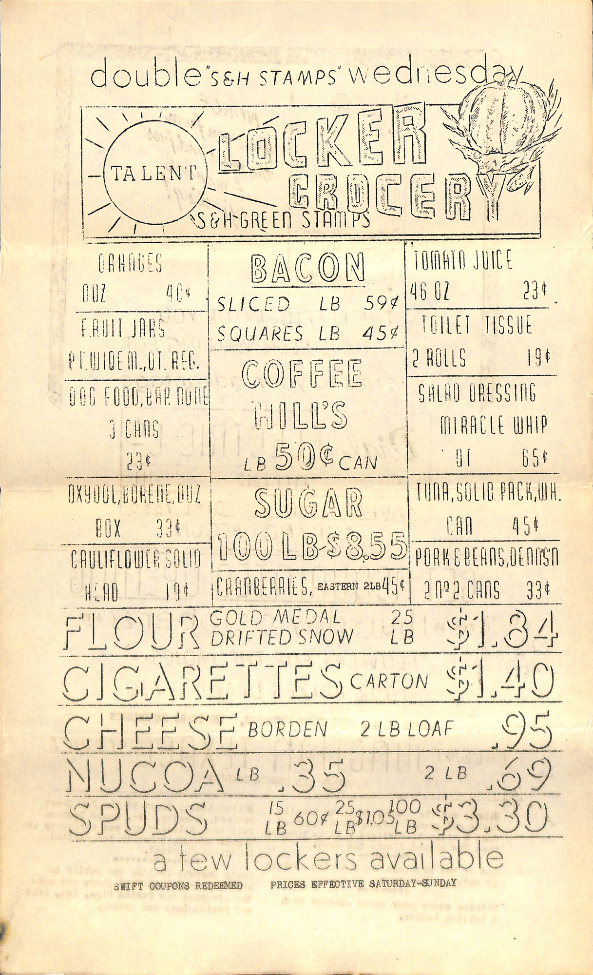 SATURDAY SPECIALS. GROCERY DEPARTMENT JELLO--5¢ pkg. SUGAR 10-lb. bag--50¢ FLOUR, KLAMATH HARD WHEAT 49-lb. bag--$1.69 FLOUR, KLAMATH, GOOD 49-lb. bag--$1.39 VEGETABLE DEPARTMENT SPUDS--50 lbs. #2--39¢ BRINER'S BERRIES 2 boxes--15¢ LEMONS, SUNKIST .doz--28¢ LETTUCE, large heads, 5¢ MEAT MARKET FINE STEAK--15¢ ROASTS--9¢ STEWS--6¢ LAMB CHOPS--15¢ BAKERY DEPARTMENT THAT GOOD HOMEMADE BREAD STILL 3 LOAVES--20¢ Many other treats at popular prices WE CARRY ICE, MEDFORD QUALITY AND PRICES FOR COMPLETE FOOD SERVICE, TRY RAY'S MARKET ----------------------------------------------------------------------------- TRAFFIC & WATER At the recent meeting of the city council, called for the purpose of considering the feasibility of securing more water, a proposition was made by the Talent Transient Camp that the members of the Camp would donate the necessary labor for the construction of a larger and deeper well at the lower city well property. It is planned to dig the well as deep as is necessary to secure an adequate flow of water, after which extensive drifts will be made to secure sufficient reservoir space. At the same meeting of the council it was voted to send for a supply of earwig parasites which are said to be efficacious in destroying the earwigs. It is requested that all owners of bantam chickens keep them penned up as a protection to the parasites…. KID PARTY Mrs. H. Good was hostess at a surprise kitchen shower Tuesday evening, honoring her sister, Miss Ione Bates, who is to be married to Mr. W. Dooms, Friday. The affair was given as a "Kid Party," and all the guests came dressed in an appropriate manner. The kids enjoyed punch and suckers and played kid games until a late hour. Many beautiful gifts were received by the guest of honor. About thirty friends of the guest of honor were present. Talent News Flashes June 23, 1934, now lost. Reprinted in the June 26, 1959 News Flashes -----------------------------------------------------------------------------