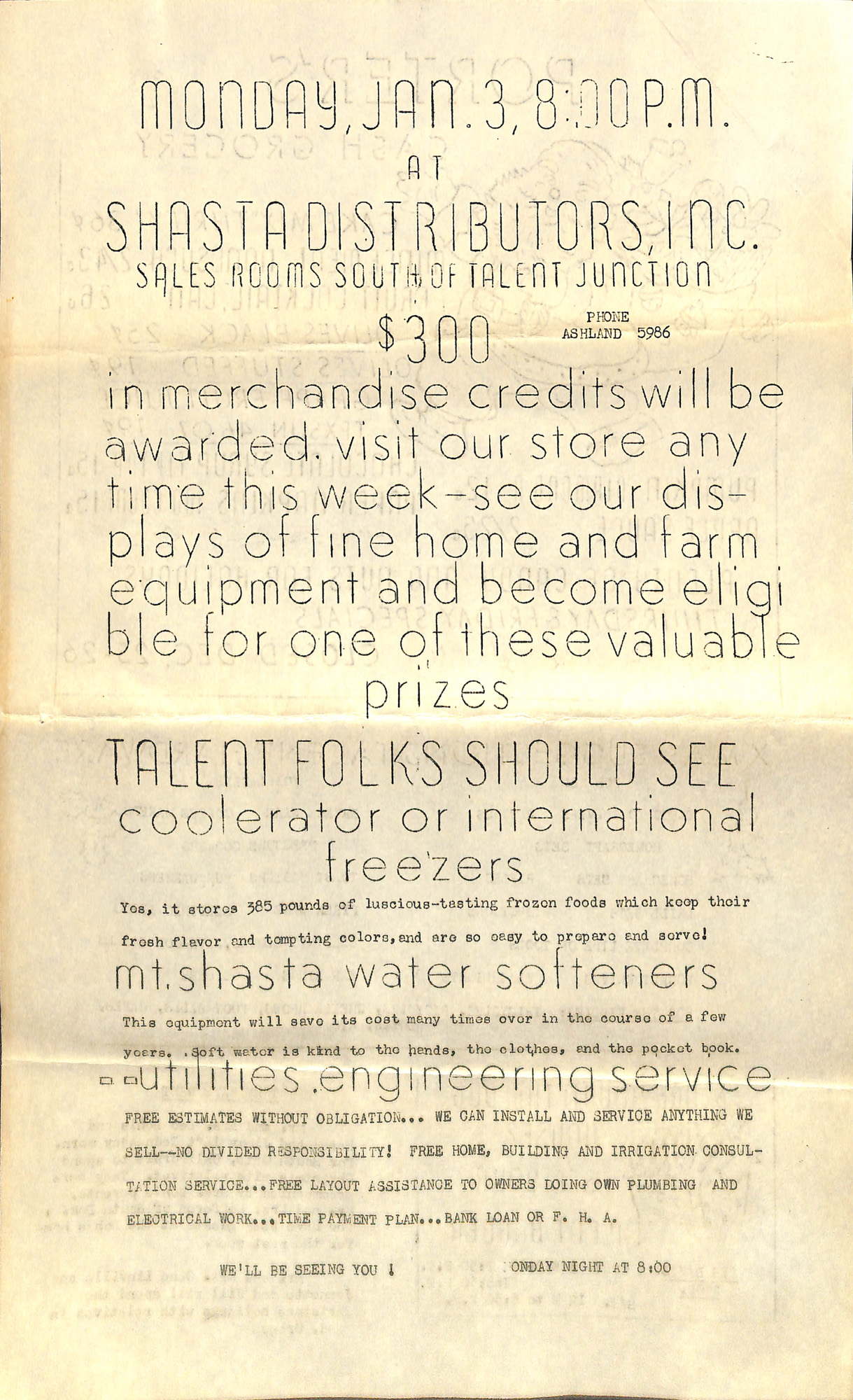 VOL. X NO. 51 WEDNESDAY, DECEMBER 22, 1948 OPENING WELL ATTENDED The opening of the new Shasta Distributor store and sales rooms was attended by several hundred people on Saturday. A complete line of plumbing and electrical equipment was on display. Mr. and Mrs. Reed and Mr. and Mrs. Hutcheson acted as hosts for the occasion. The store was tastefully decorated in keeping with the Christmas season. The owners of the new store plan to carry one of the most complete lines in Southern Oregon. It is stated that they will install a model kitchen where demonstrations of equipment will be conducted and where cooking demonstrations will be conducted monthly. The drawing for the $300 in prizes will be held on Monday, Jan. 3, at 8:00 p.m. GAMES TO BE BROADCAST. As a public service eleven business houses in Talent are sponsoring broadcast of three basketball games in which the Talent Bull Dogs compete. The first broadcast occurred last night when the Gold Hill Beavers went down to defeat before the local team. Sponsors of this service are: Skeeters