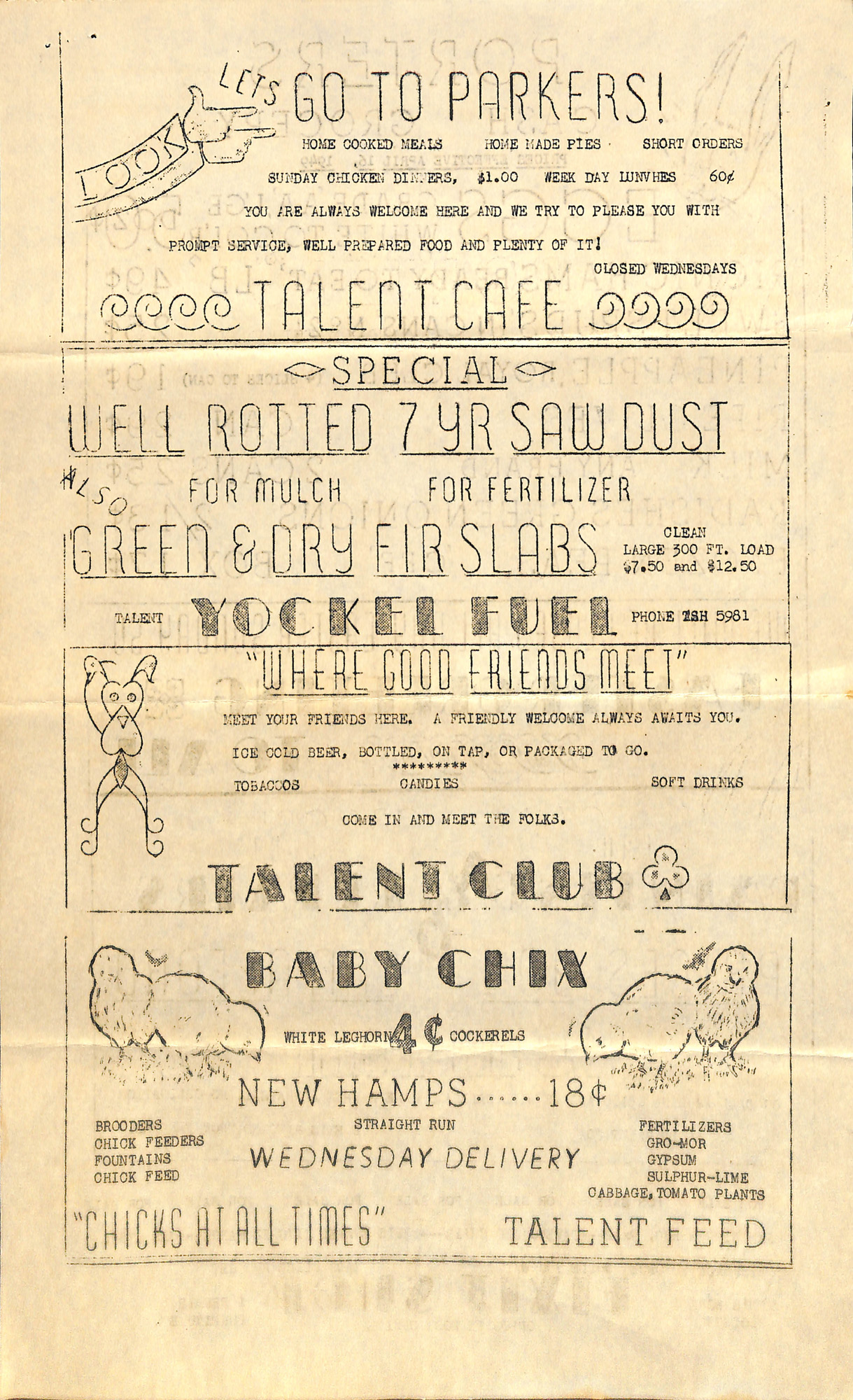 Due to the fact that we have a working agreement with a number of California brokers, we GET THE JOB DONE! WE SPECIALIZE IN RANCHES. If you want to sell your ranch LET US HANDLE IT. PHILLIPS REAL ESTATE R1 BOX 224 TALENT HIGHWAY 99, SOUTH Page 4, full-page ad for: VALLEY LOCKER GROCERY Page 5, ads for: YOCKEL FUEL TALENT CLUB GRIFFIN AUTO REPAIR PARKER'S TALENT CAFÉ Page 6, ads for: MOMANY SHELL STATION ACME BETTER CLEANING LUNSFORD MOBIL GARAGE WANT ADS. Your ad inserted in this column will be read by several hundred families in the Talent trade area. Cost 25¢ per insertion. Phone copy to ASH 24553 or leave at 109 S. SECOND, TALENT. FOR SALE--One hay rake and one John Deere Mowing Machine with two sickle bars. Apply to C. A. MOORE, OPPOSITE COUNTY HOSPITAL. SEWING--Dress making and alterations. CALL AT VALLEY DECORATORS. MRS. L. AVERY. FOR SALE--Five room modern home. Lot 66x150. Venetian blinds, insulated, garage, 2 bedrooms. CALL JUNCTION POINT SHELL STATION. PHONE ASH 7764. RADIO--RADIOS REPAIRED, LOCALLY. GENE ROELLE, 113 N. FIRST. FOR SALE--King Nectarberry Plants. Vigorous, healthy stock. 25¢ each. LLOYD WELLS, 1 Mi. S. TALENT. OLD HIGHWAY. Phone ASH 8327. WANTED--SAWS TO FILE. ALL KINDS. PROMPT SERVICE. GUST WITTE. 205 OLD HIGHWAY S. FRYERS--HEAVY RED FRYERS. 45¢ AND 50¢ LB. SULLIVAN POULTRY FARM, ½ MI. WEST ON WALDEN LANE. WATKINS--R. L. BUNTON, YOUR WATKINS DEALER. VARIETY STORE. NEXT DOOR TO PHOENIX POST OFFICE. FOR SALE--Wayne 2 Stage, 1 horse power AIR COMPRESSOR. Price $175 or will take 6" Delta Jointer or equal. SUBURBAN BODY AND PAINT CO. Phone MED 6684. FOR SALE--Enameled Montag range in A1 condition, $45.00. Keys made to order with new machine just installed. FRANK MOON'S STORE (Opposite Valley Locker) SPECIAL--Cottonseed meal, $5.00 per CWT. TALENT FEED STORE FOR RENT--APARTMENT. Phone ASH 2-1266 or see Mrs. Culver evenings. FOR SALE--GARDEN SULFUR. TALENT FEED STORE. It's incredible how soon your least charming traits show up in Junior. BORN To Mr. and Mrs. ason a daughter, born at Ashland Community Hospital, March 5. Her name is Janice and she looks like her mamma and pappa. COMMUNITY CLUB COMMUNITY CLUB WILL MEET AT CITY HALL WEDNESDAY AFTERNOON. ATTENTION HOME OWNERS THE PERIOD MARCH 15-31 HAS BEEN DESIGNATED BY THE MAYOR AND COUNCIL AS ANNUAL TOWN CLEANUP TIME ALL RESIDENTS ARE REQUESTED TO CLEAN YARDS OF TRASH AND RUBBISH AND DEPOSIT FOR COLLECTION. LAWNS SHOULD BE RAKED, DEAD LEAVES COLLECTED FROM FENCE ROWS AND BROKEN AND DISCARDED FURNITURE AND EQUIPMENT BURNED OR HAULED AWAY. YOU ARE ASKED TO COOPERATE AND MAKE YOUR HOME AND STREET MORE ATTRACTIVE AND OUR TOWN MORE BEAUTIFUL. RAY